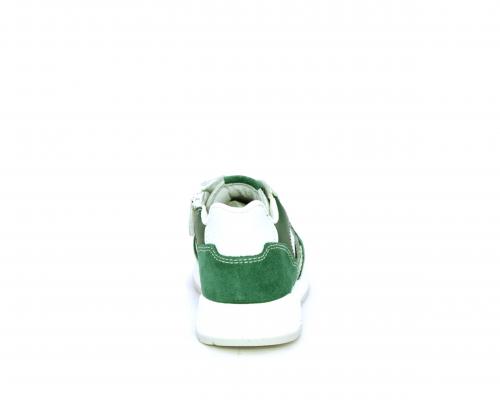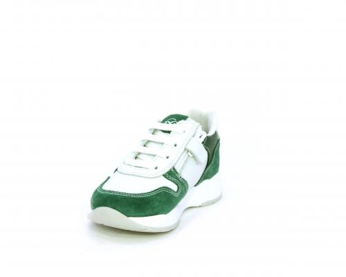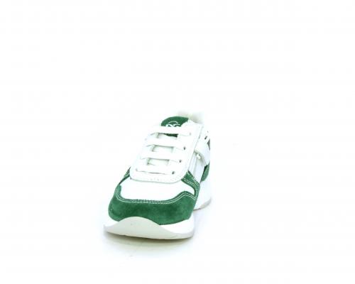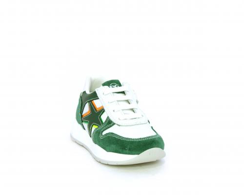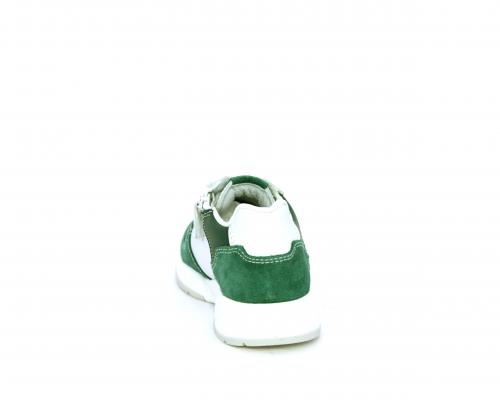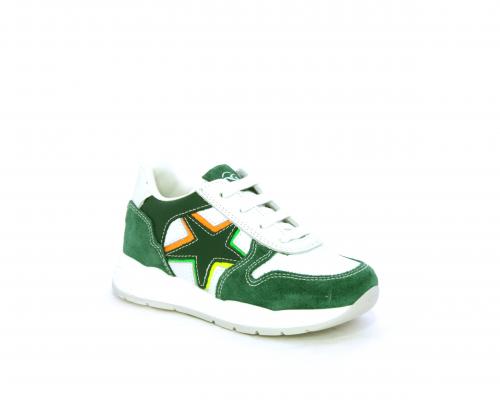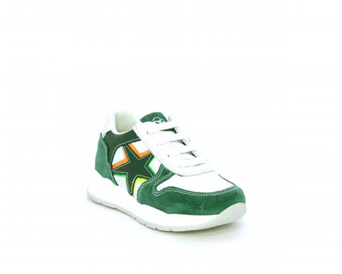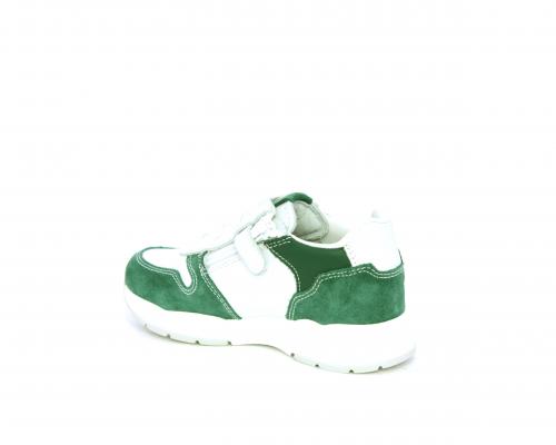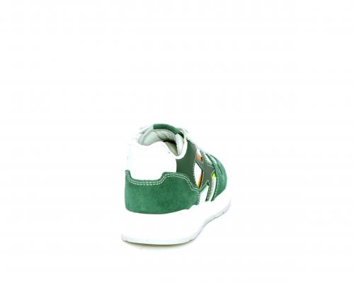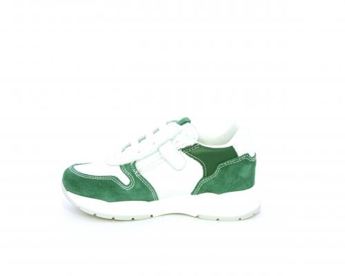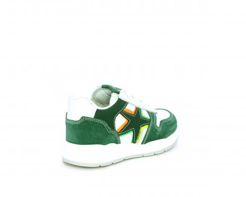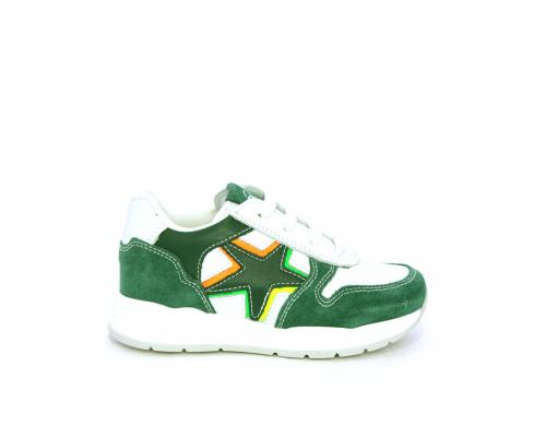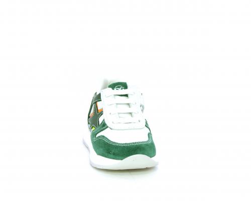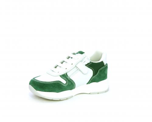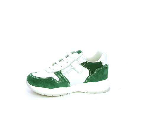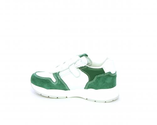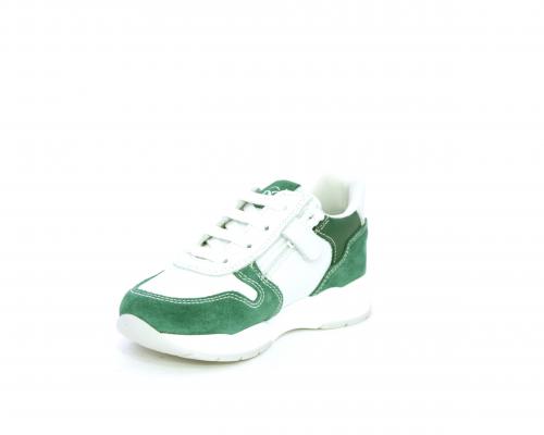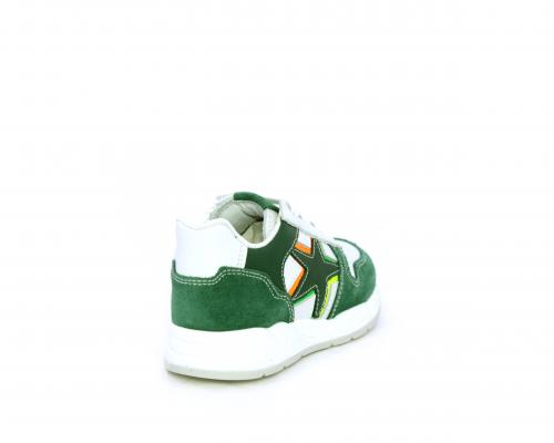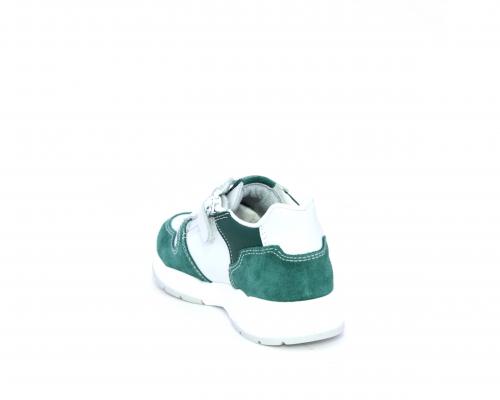 Scarpa bambino con lacci e chiusura laterale per facilitare la calzata, tomaia in pelle con parti colorate in suede e pelle, cuscinetto in tessuto nella parte interna intorno alla caviglia, sottopiede e fodera interna in pelle.