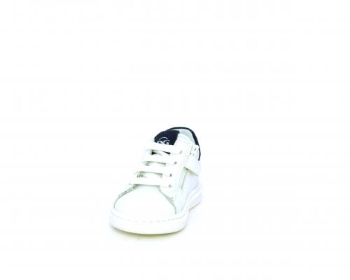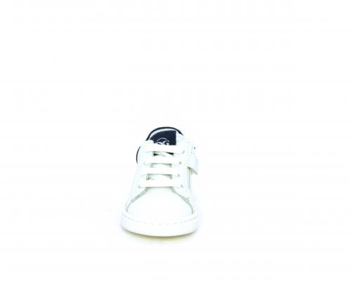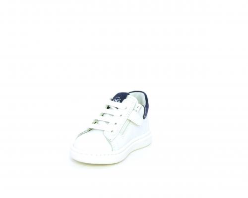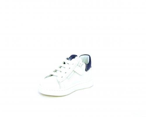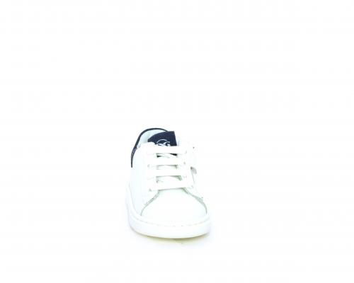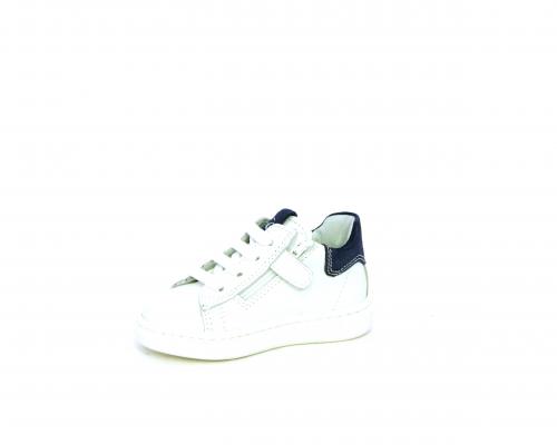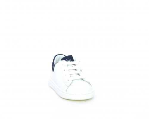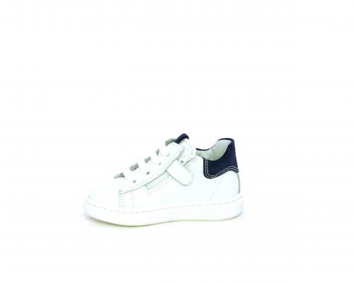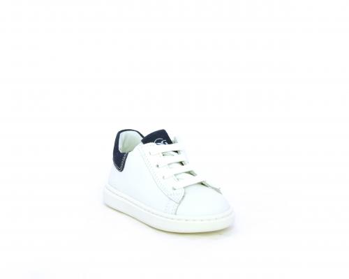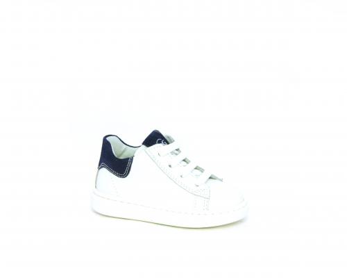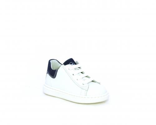 Scarpa primi passi bambino con lacci e chiusura laterale per facilitare la calzata, tomaia in pelle con parti colorata in suede dietro al tallone, cuscinetto in tessuto nella parte interna intorno alla caviglia, sottopiede e fodera interna in pelle, fusbet estraibile.