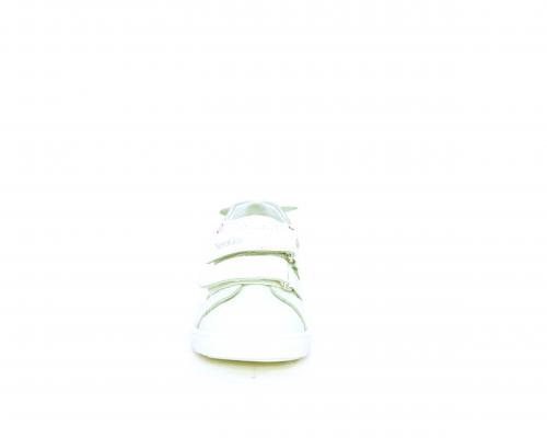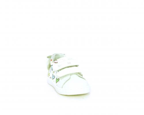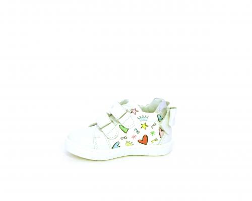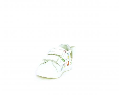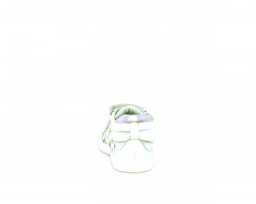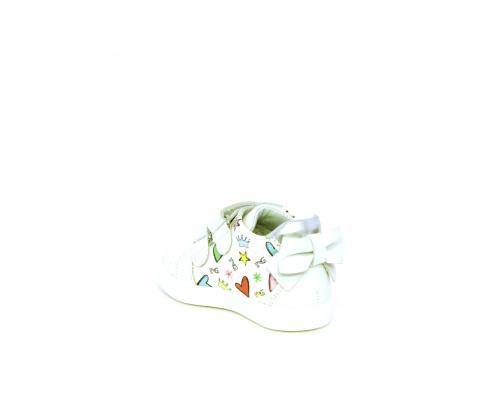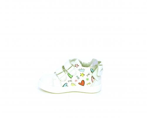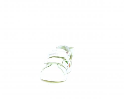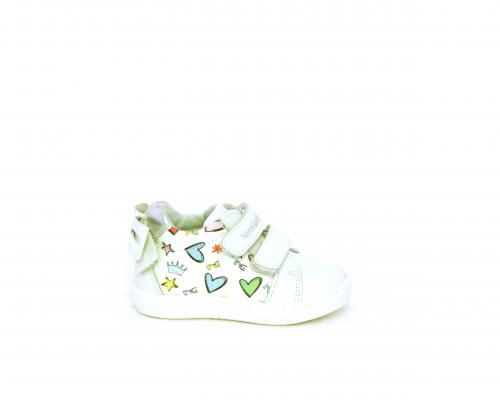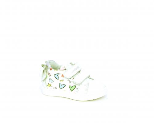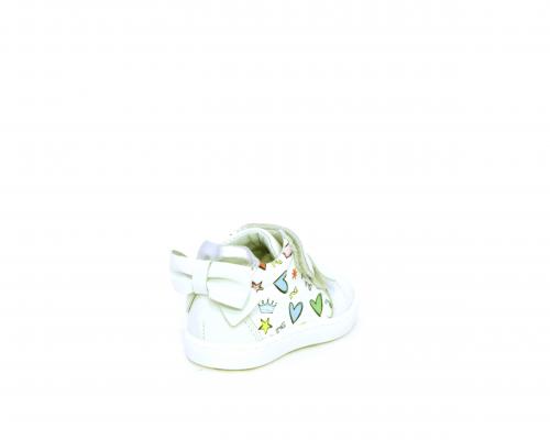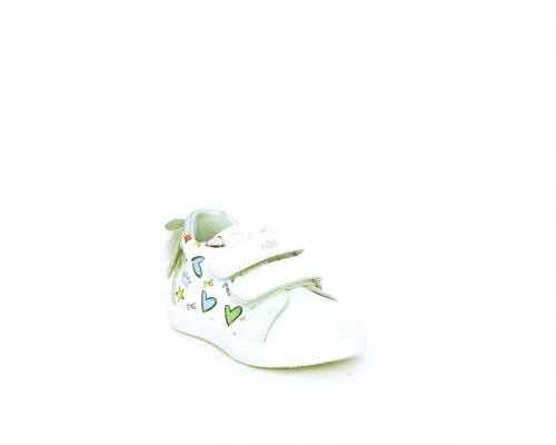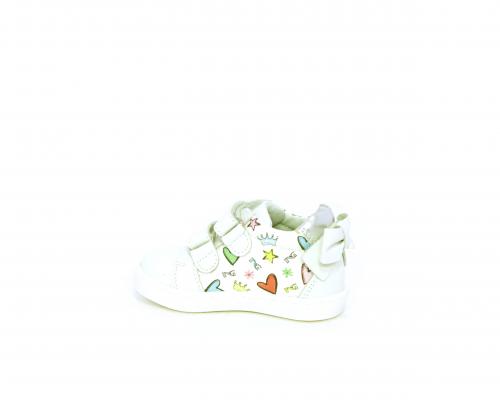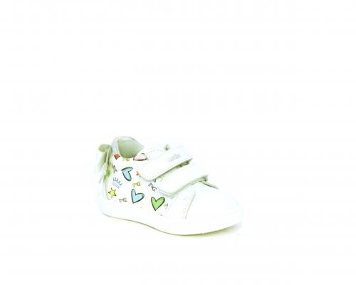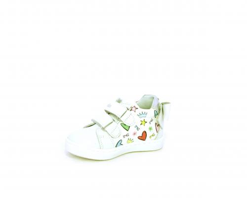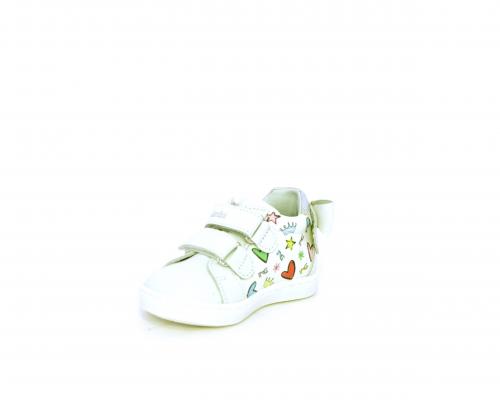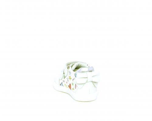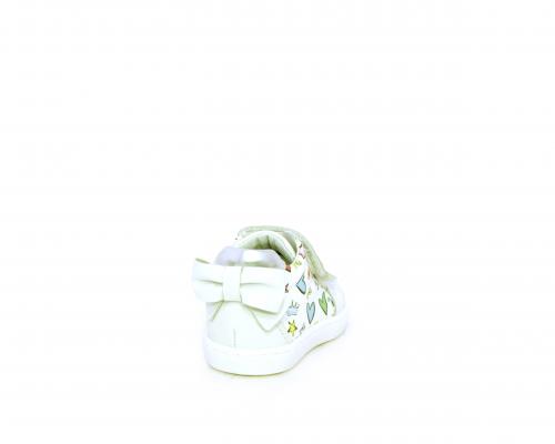 Scarpa primi passi bambina con doppio velcro, tomaia in pelle con stampe laterali e fiocchetto in pelle dietro al tallone, sottopiede e fodera interna in pelle, fusbet estraibile.