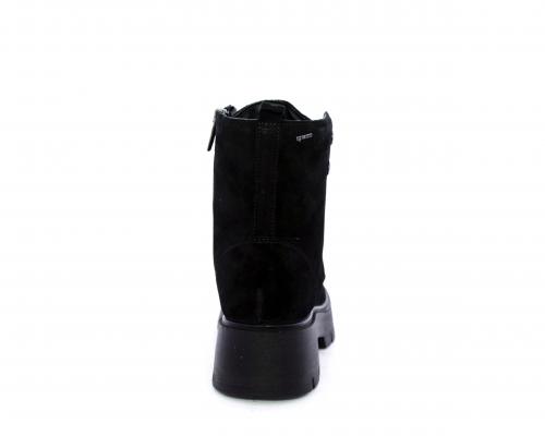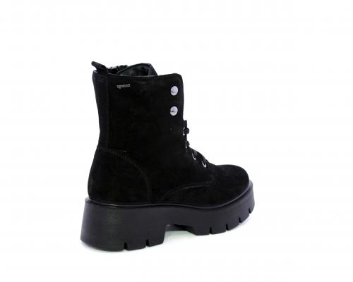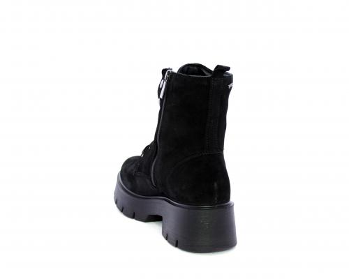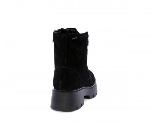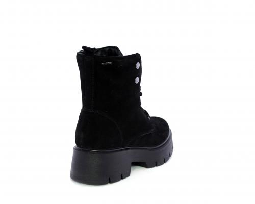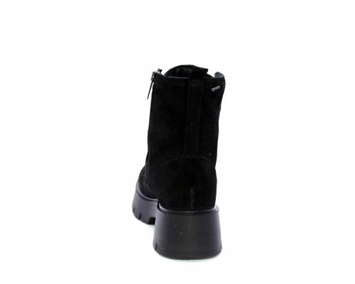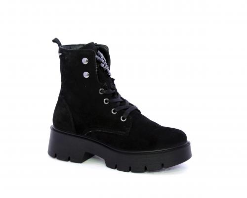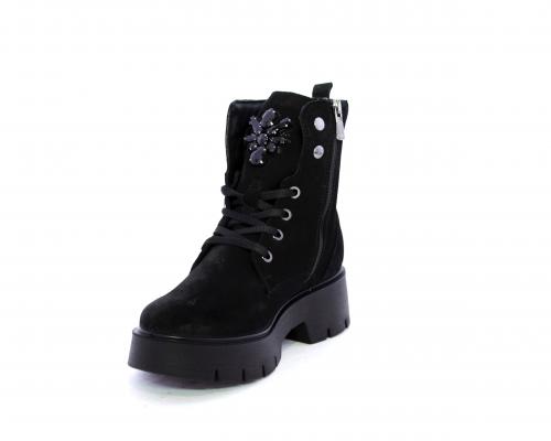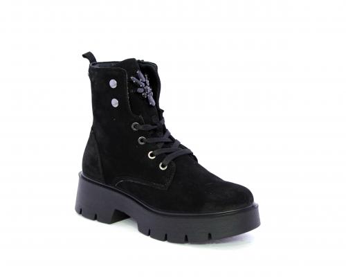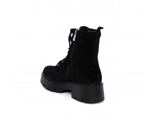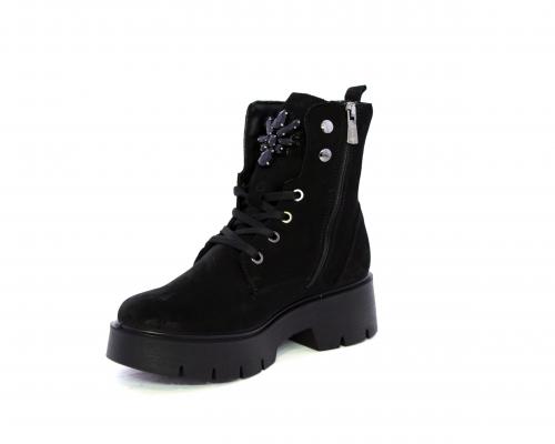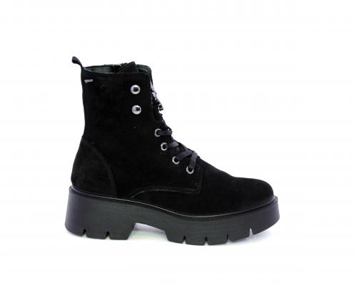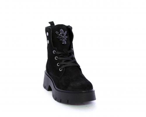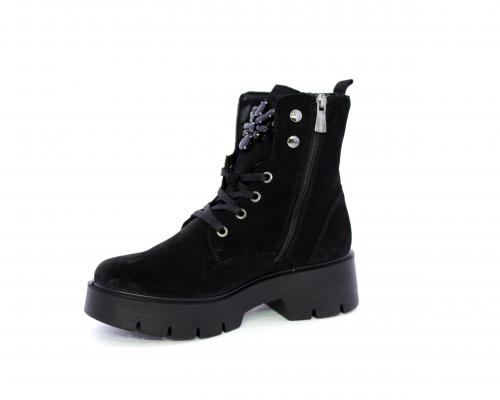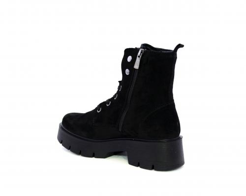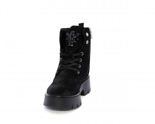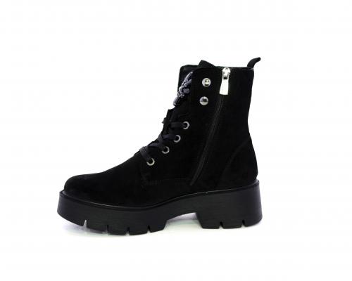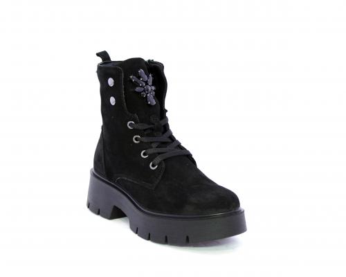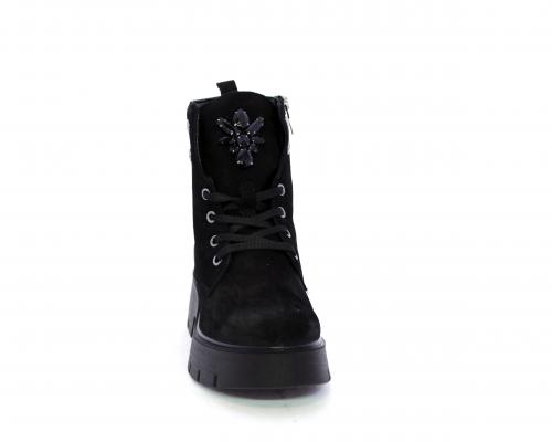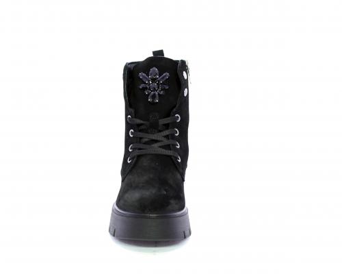 Anfibio fondo gomma, tomaia in camoscio con lacci e chiusura laterale per facilitare la calzata, inserti di swarosvki nella linguetta della scarpa, sottopiede in pelle, fodera interna in tessuto, fusbet anatomico estraibile.