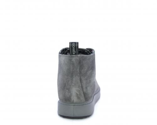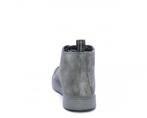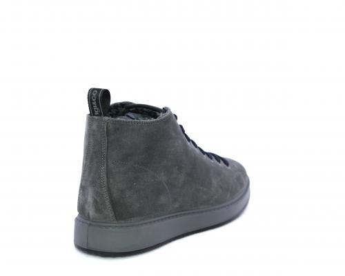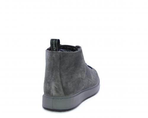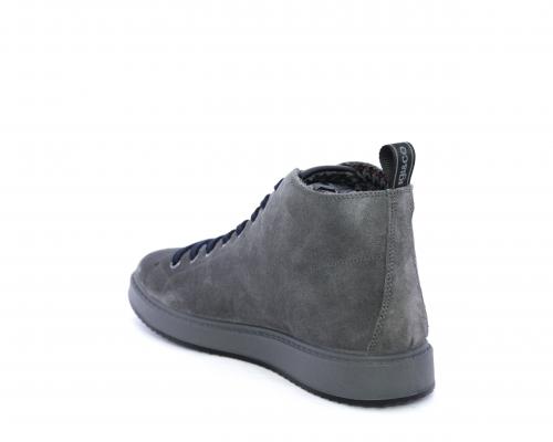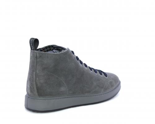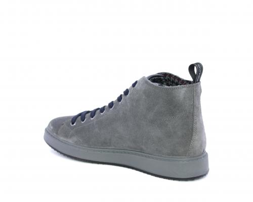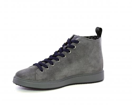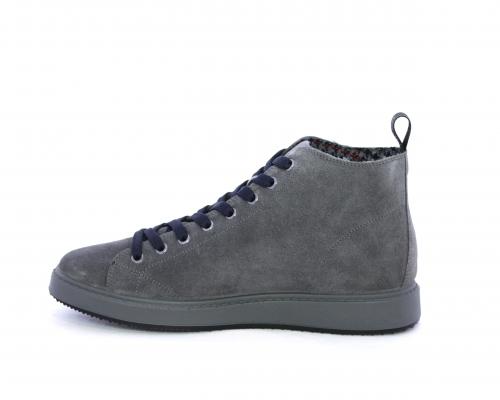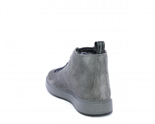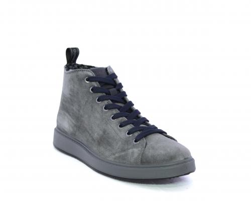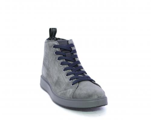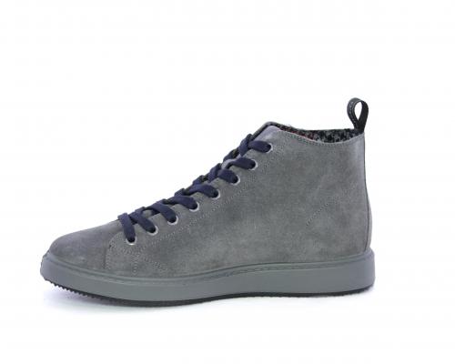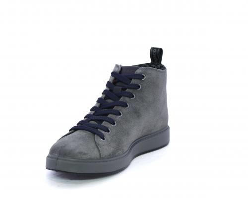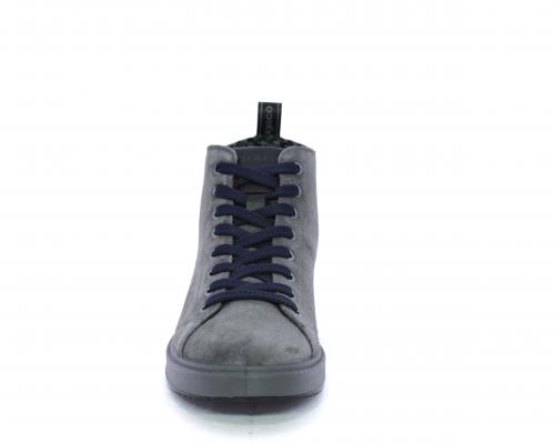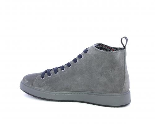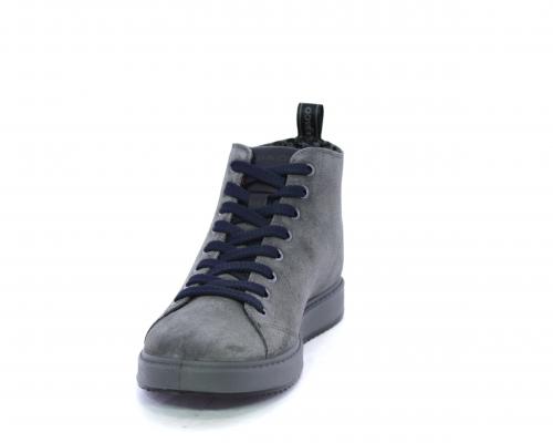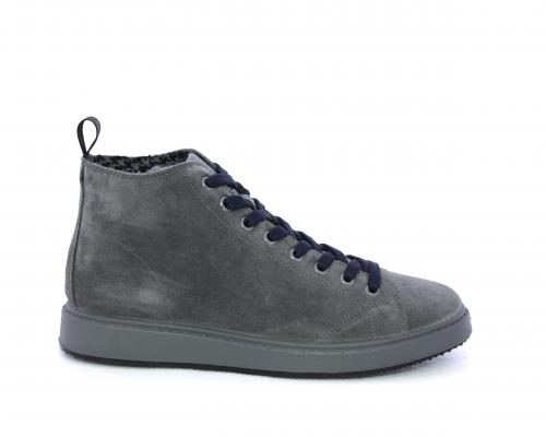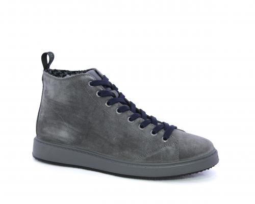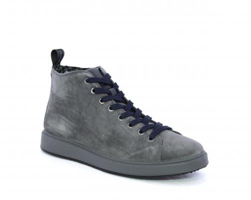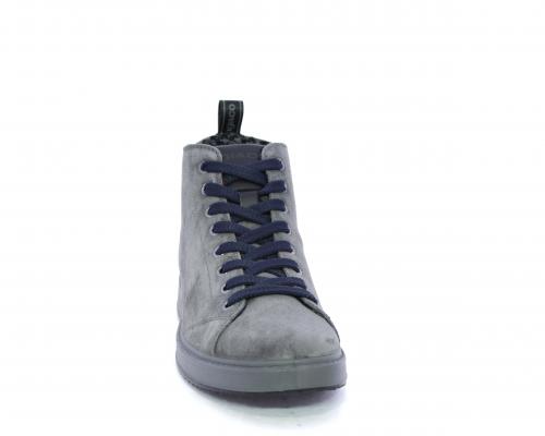 Sneakers uomo alta alla caviglia, tomaia in camoscio con doppio laccio blu e grigio, sottopiede in pelle, fodera interna in tessuto, fusbet anatomico estraibile.