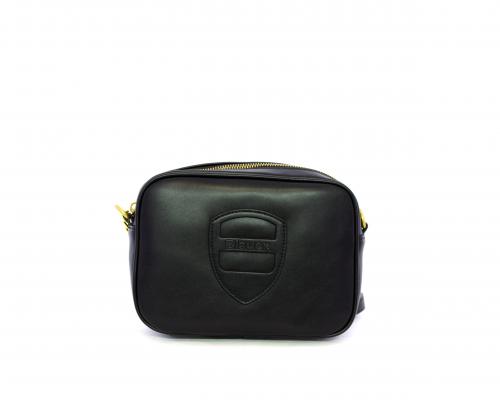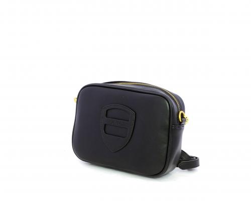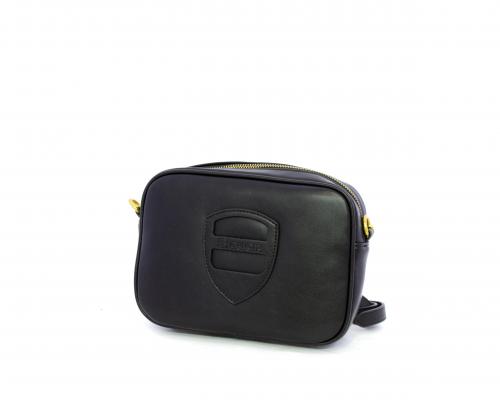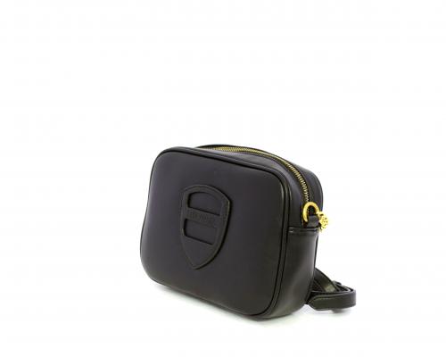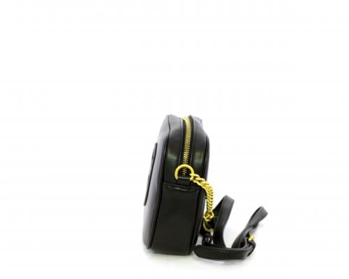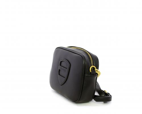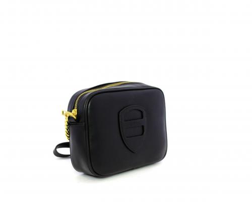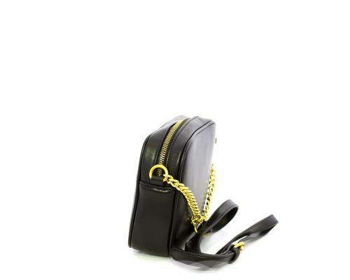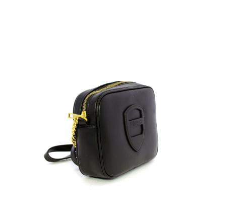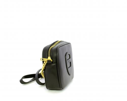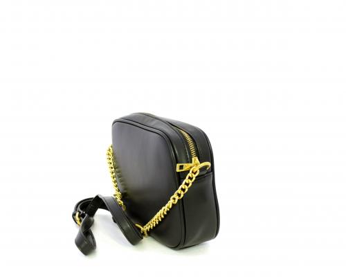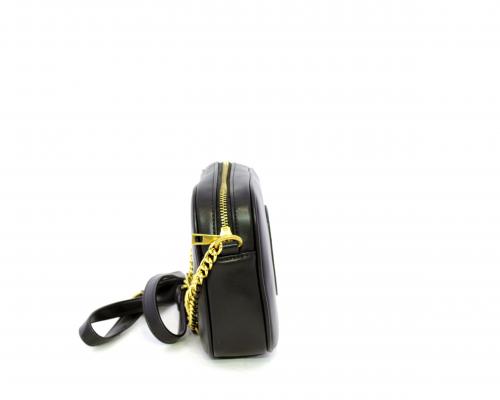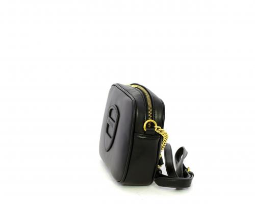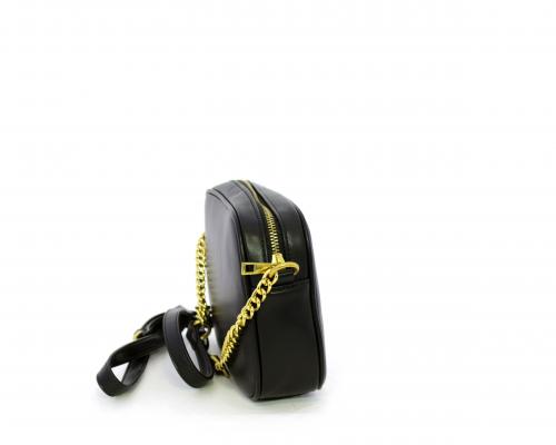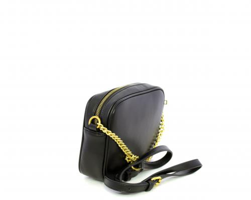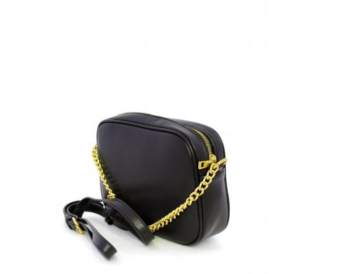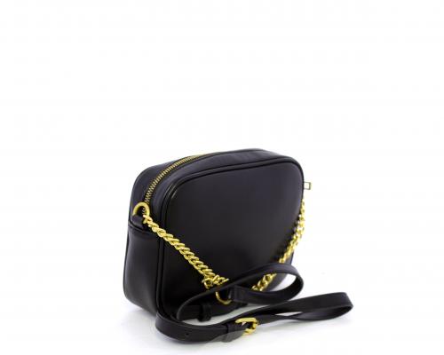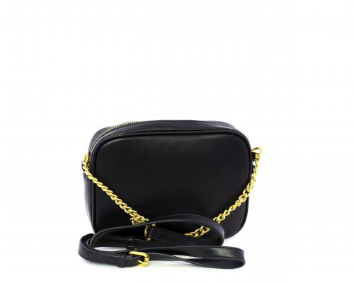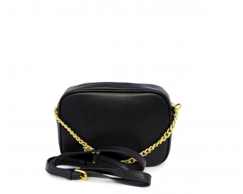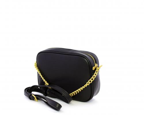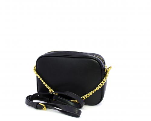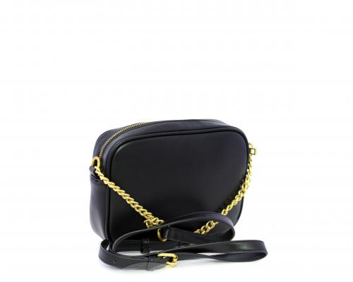 Borsa con tracolla lunga di forma rettangolare, la tracolla è regolabile in pelle e caratterizzata da una parte in catena, logo in pelle nella parte anteriore, chiusura superiore della borsa con cerniera, fodera interna in tessuto.
