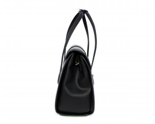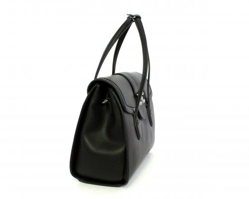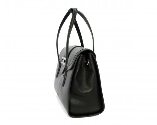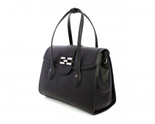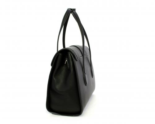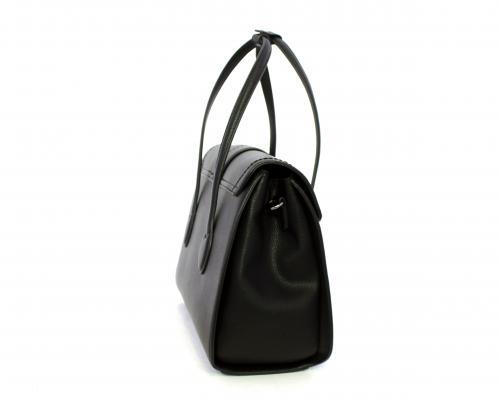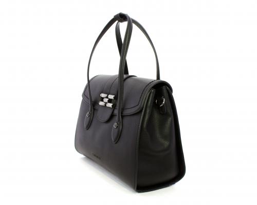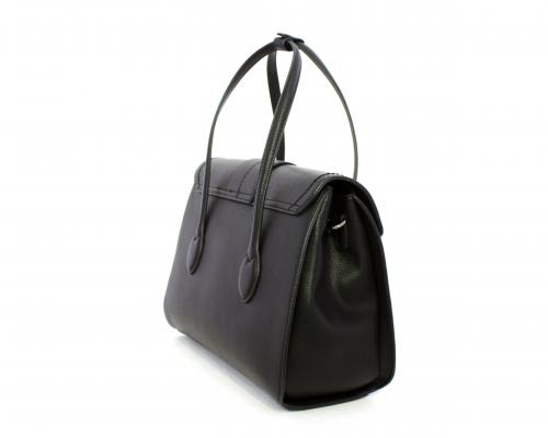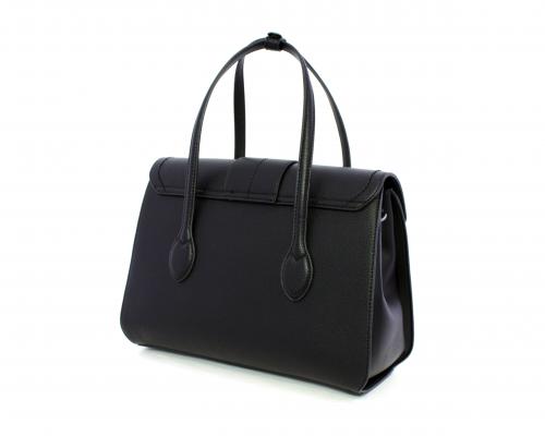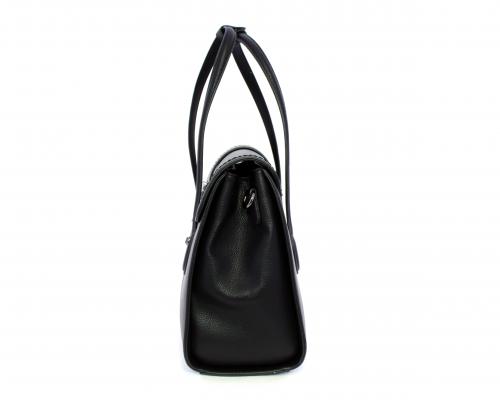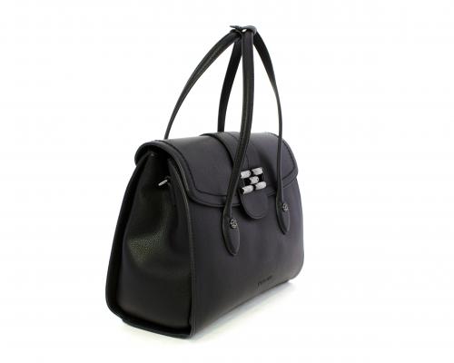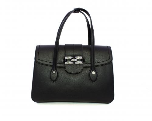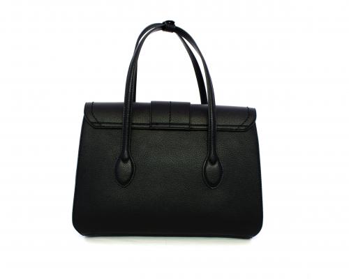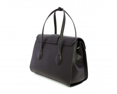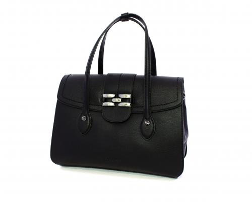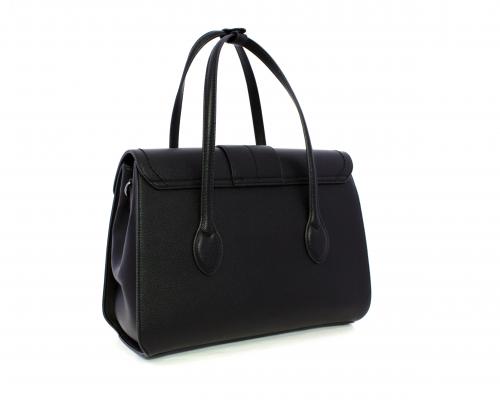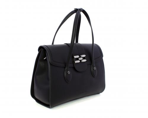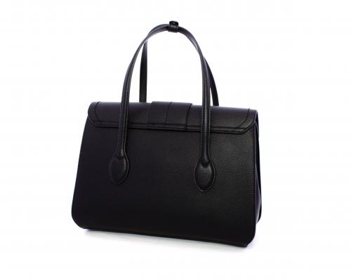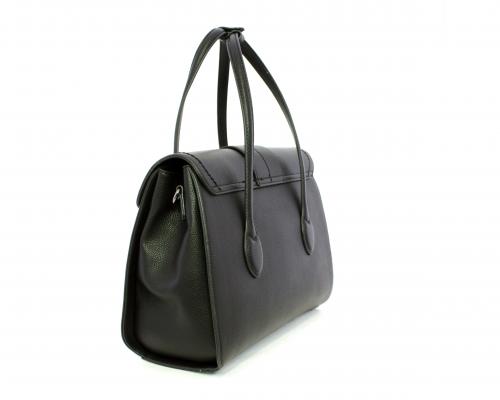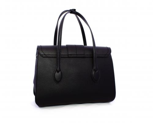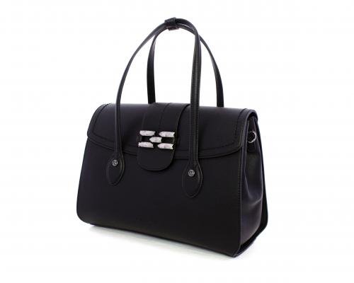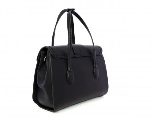 Borsa in pelle, forma rettangolare con doppio manico in pelle e possibilità di aggiungere la tracolla in pelle regolabile, chiusura della ribaltina con la clip, fodera interna in tessuto, interno diviso in due scomparti da una tasca con zip.