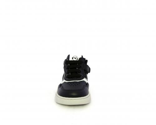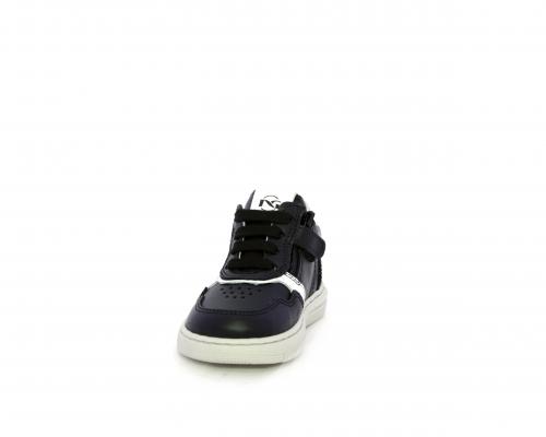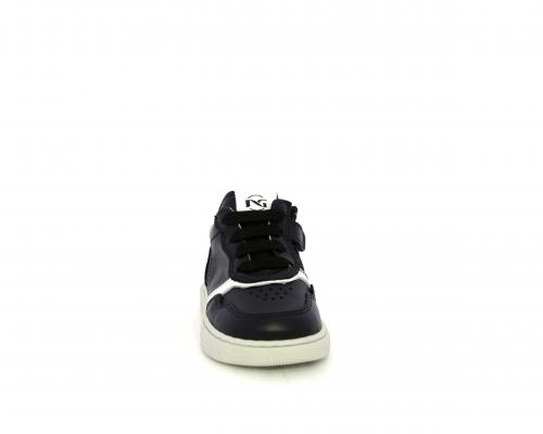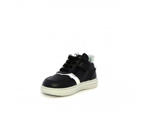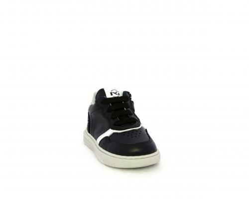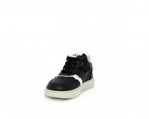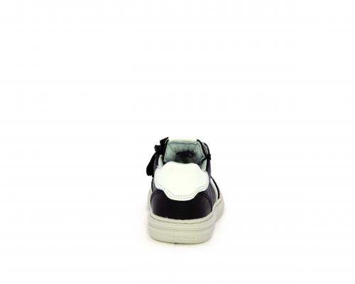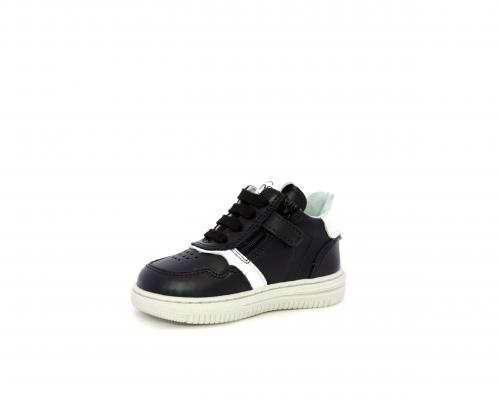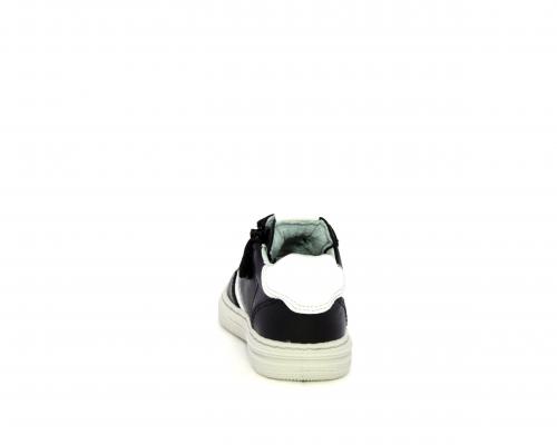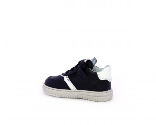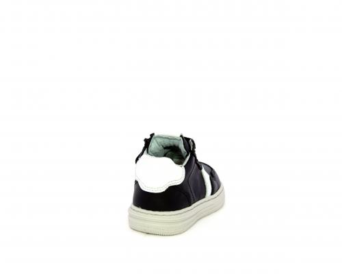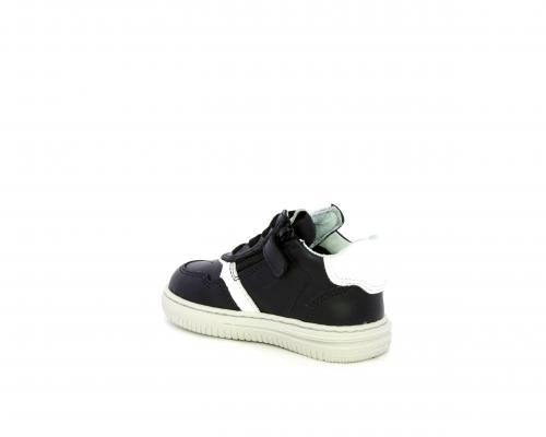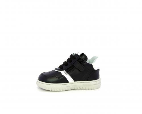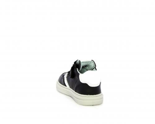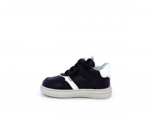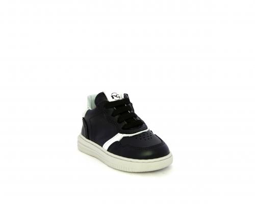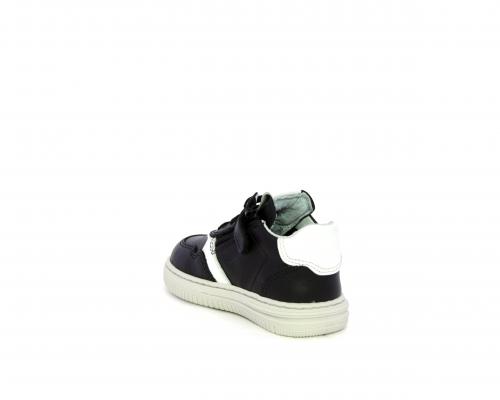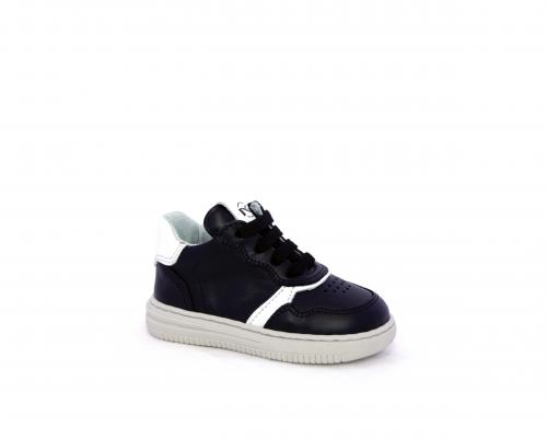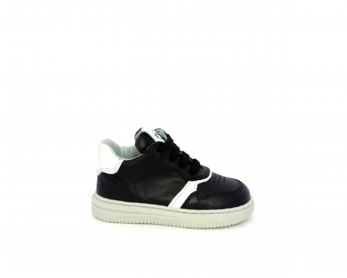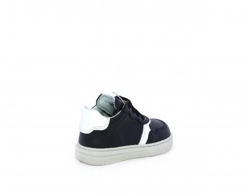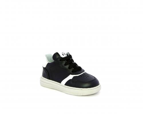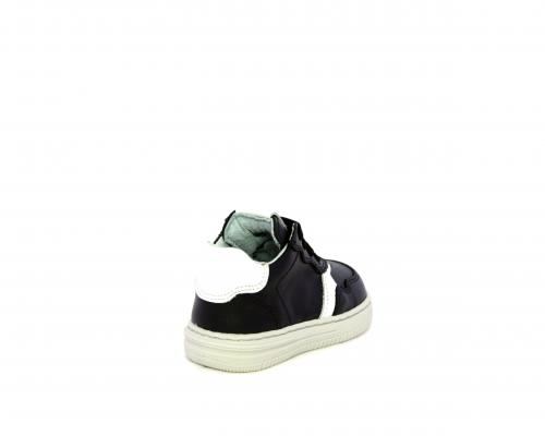 Sneakers primi passi con lacci e chiusura laterale per facilitare la calzata, tomaia in pelle nera con inserto in pelle bianca, sottopiede e fodera interna in pelle, fusbet estraibile.