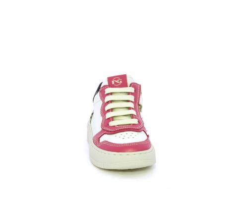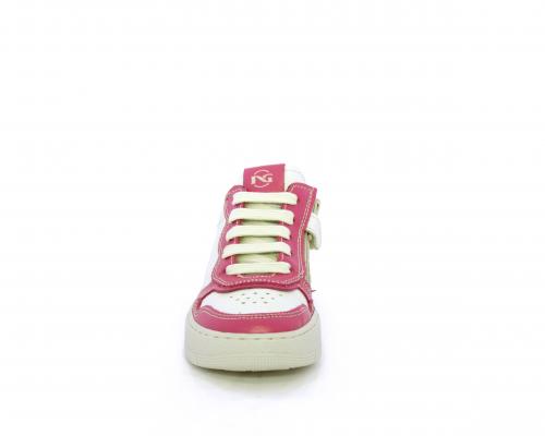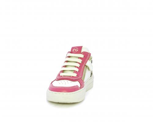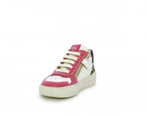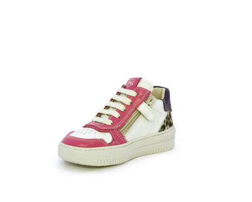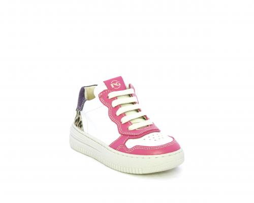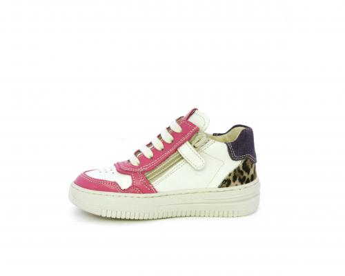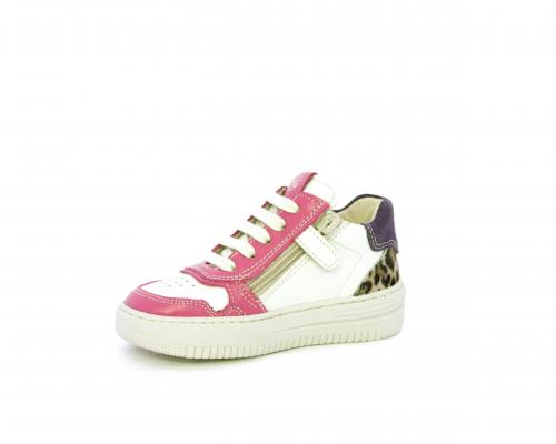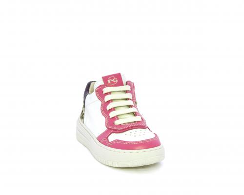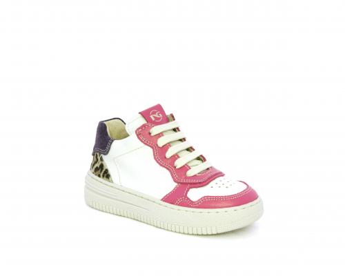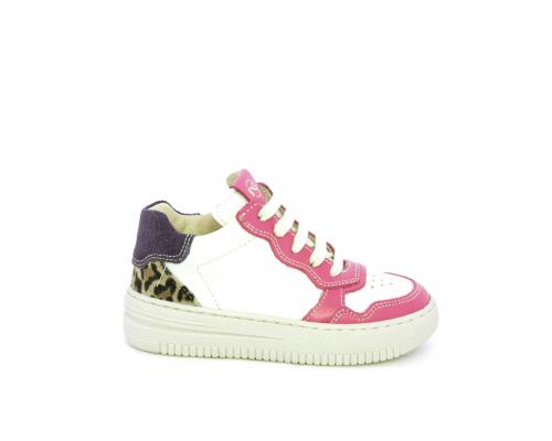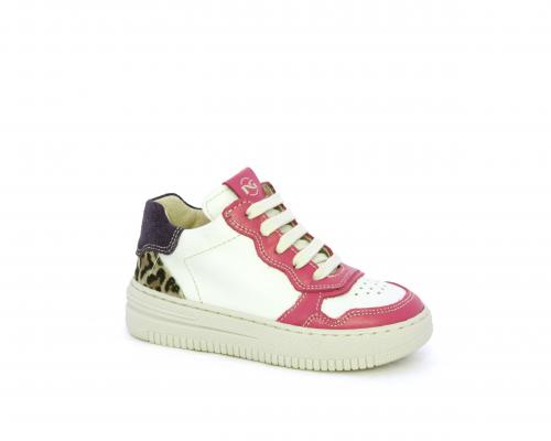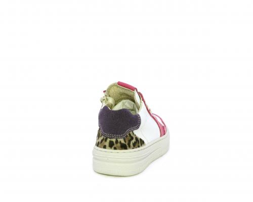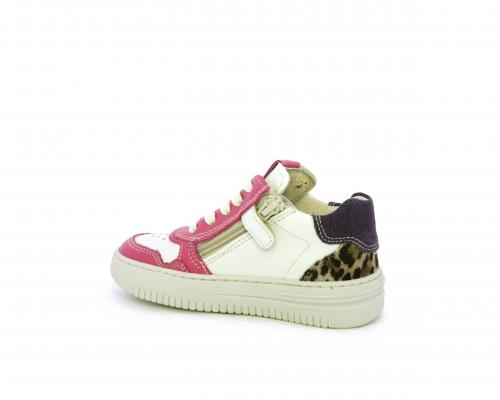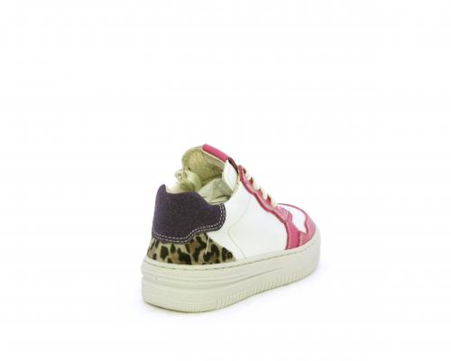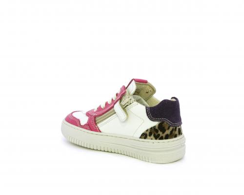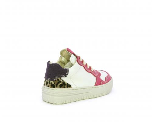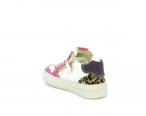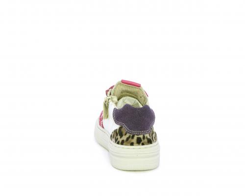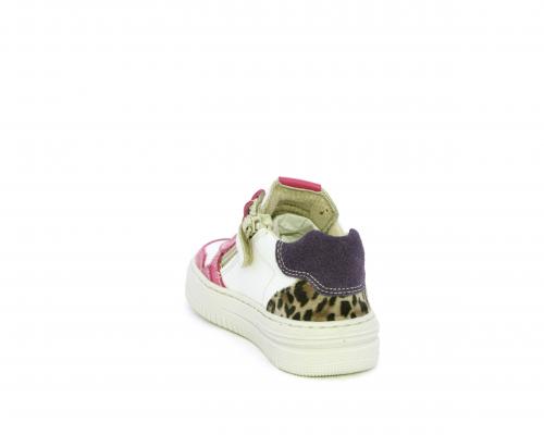 Sneakers con lacci e chiusura laterale per facilitare la calzata, tomaia in pelle bicolore con inserto in tessuto maculato al tallone, sottopiede e fodera interna in pelle, fusbet estraibile.
