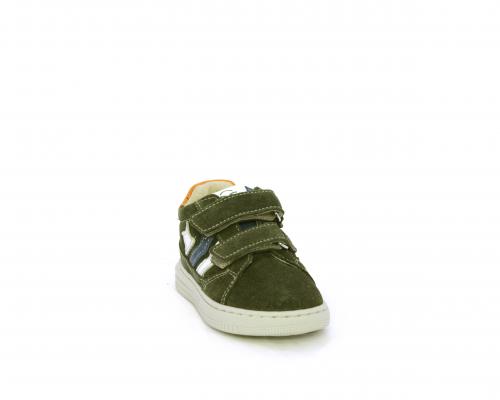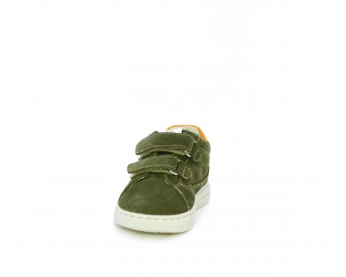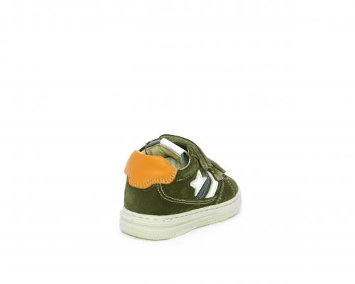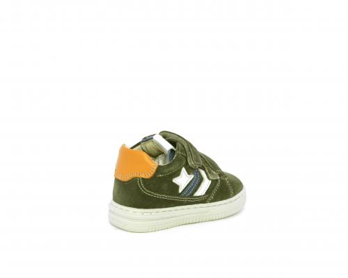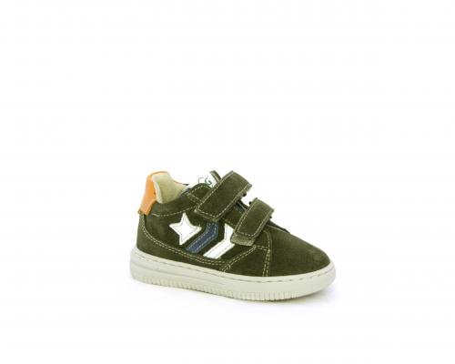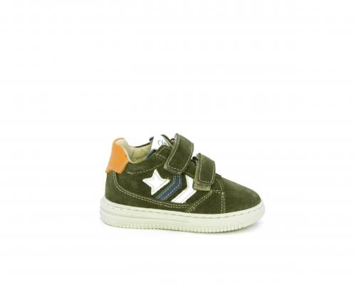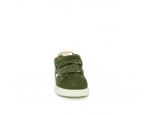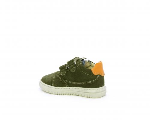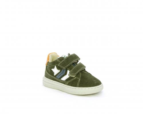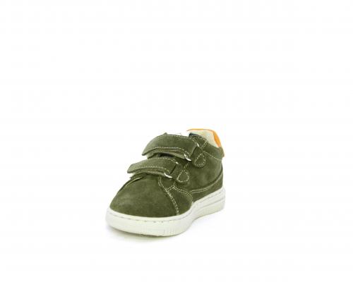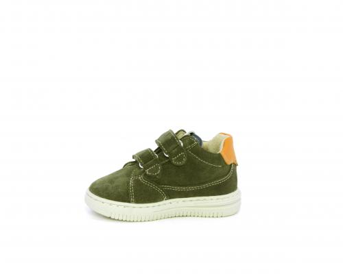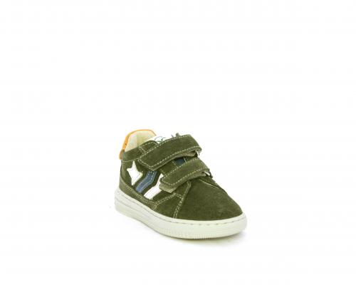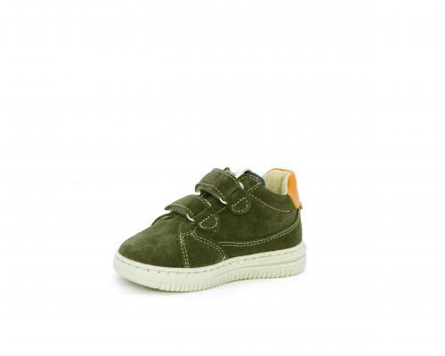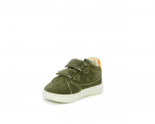 Sneakers primi passi con doppio velcro, tomaia in camoscio con inserti in pelle, sottopiede e fodera interna in pelle, fusbet estraibile.