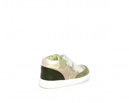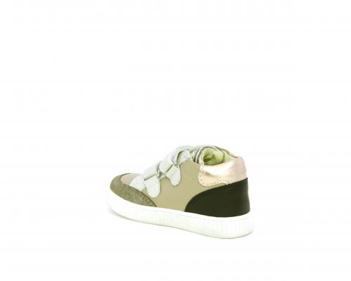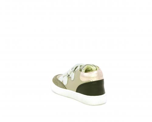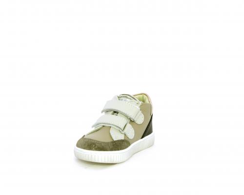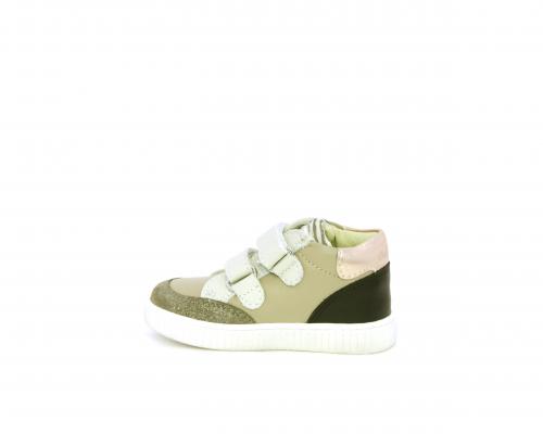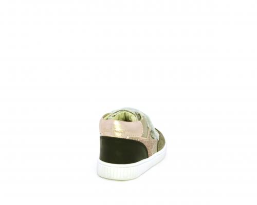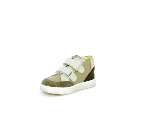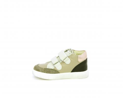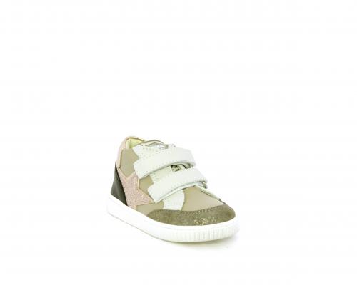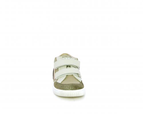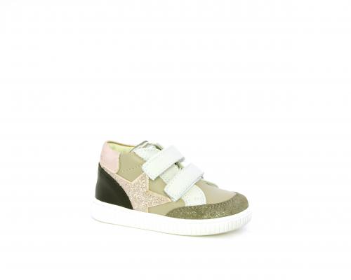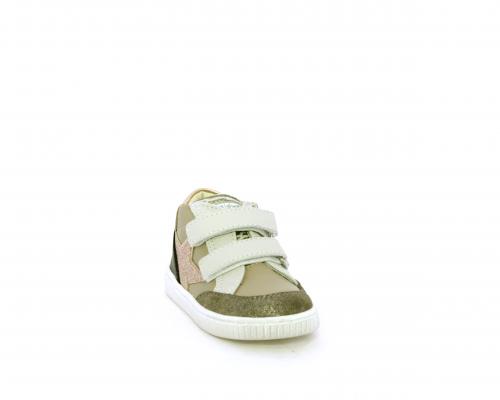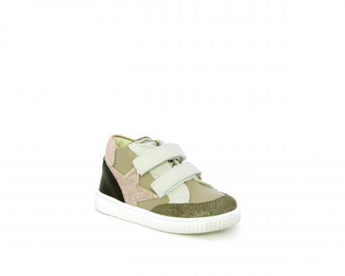 Sneakers primi passi flessibili e leggere, con doppio velcro, tomaia in pelle con inserti in camoscio e lurex, sottopiede e fodera interna in pelle, fusbet estraibile.