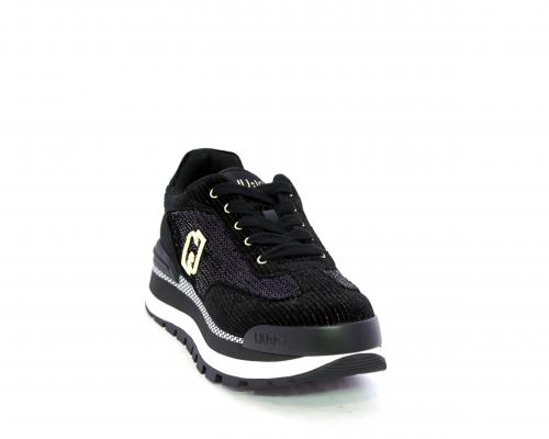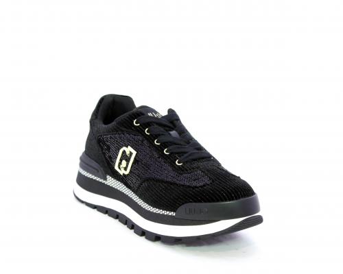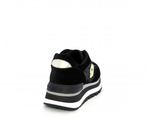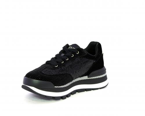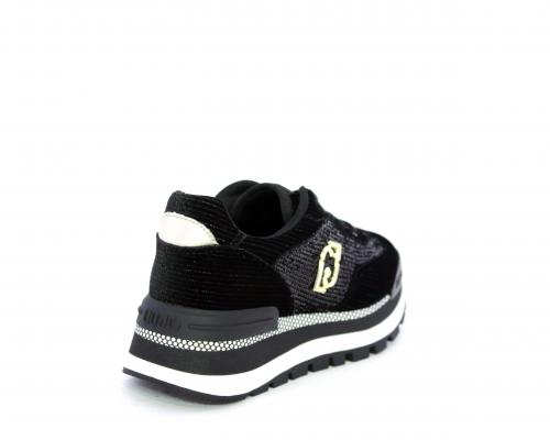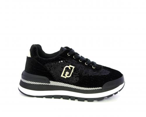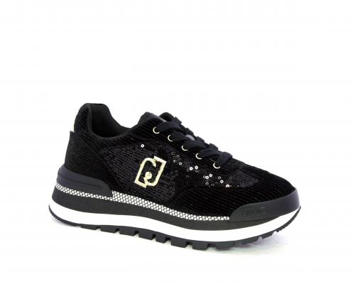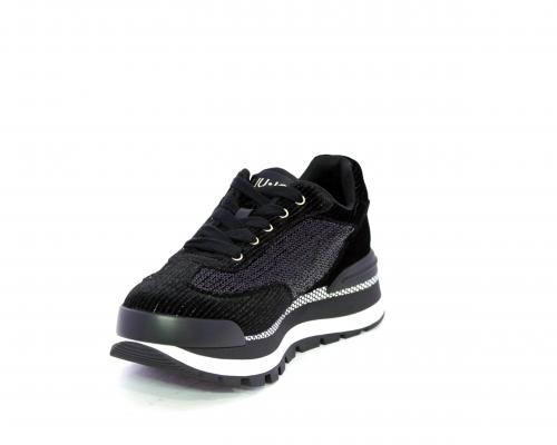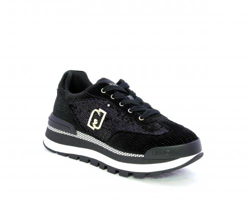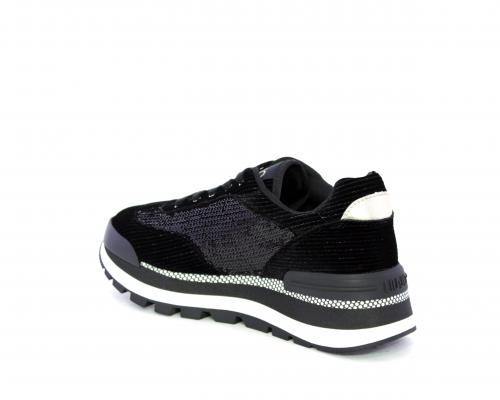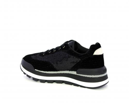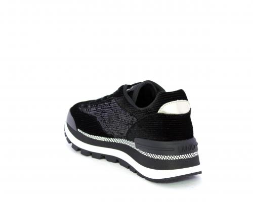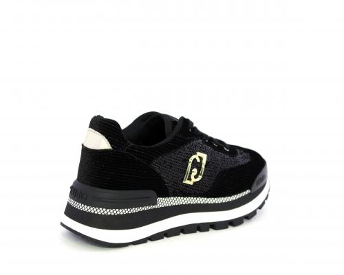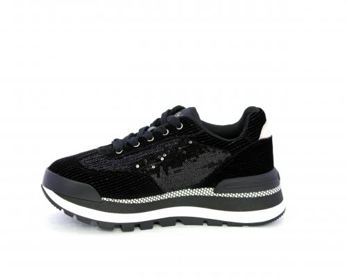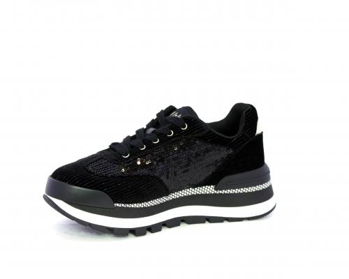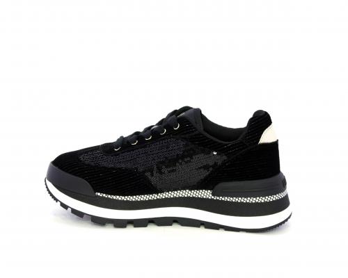 Sneakers con lacci, zeppa in gomma bicolore, tomaia in velluto e parte laterale con pailletes, logo laterale dorato, sottopiede e fodera interna in tessuto, fusbet anatomico estraibile.