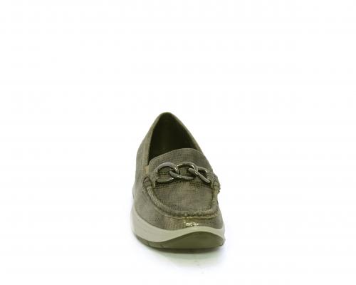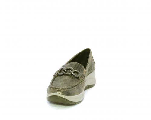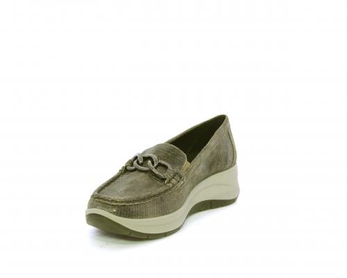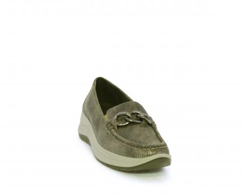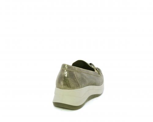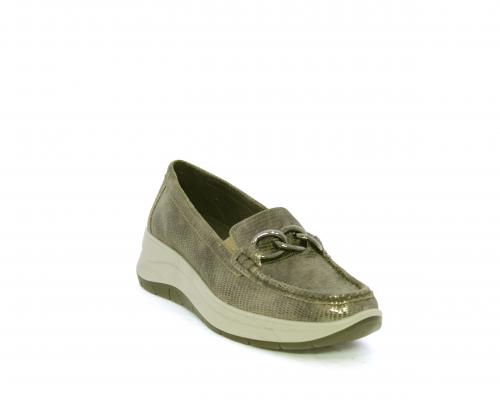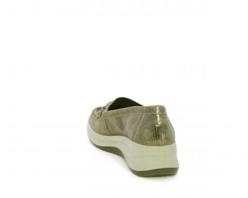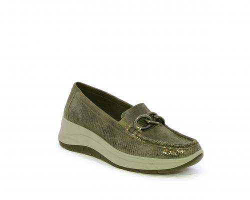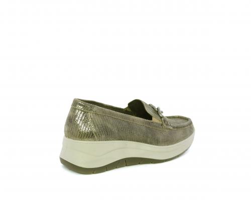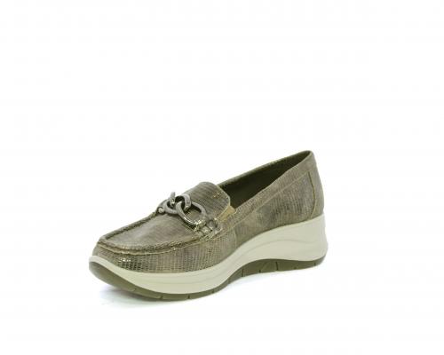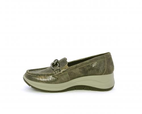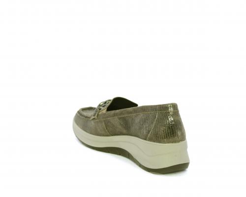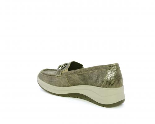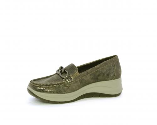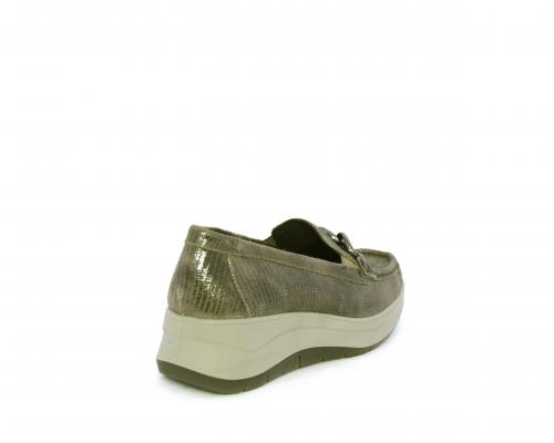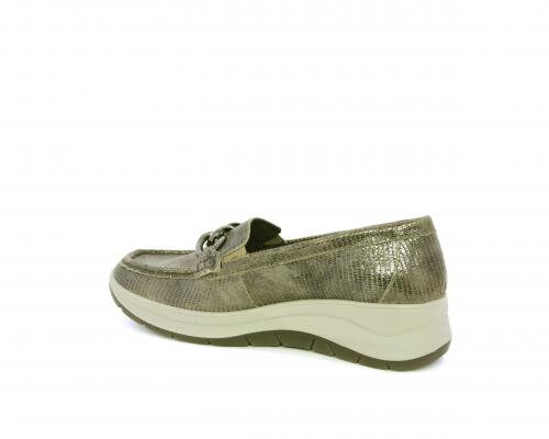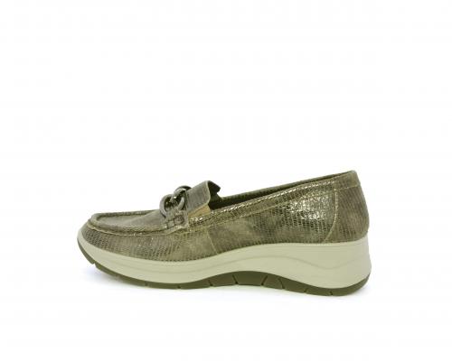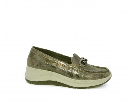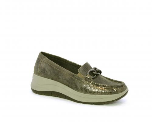 Mocassino con zeppa in gomma, tomaia laminata con elestico sul collo del piede e catena, sottopiede e fodera interna in pelle, fusbet anatomico estraibile.