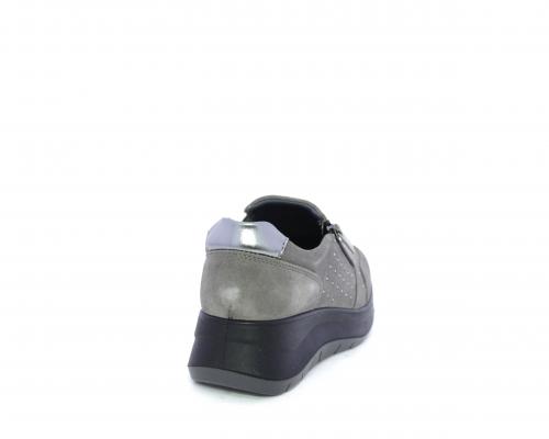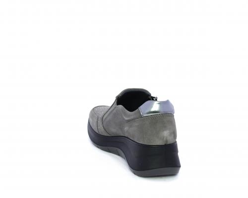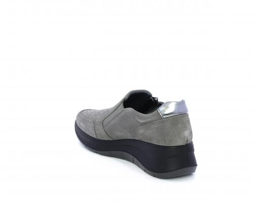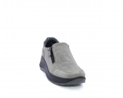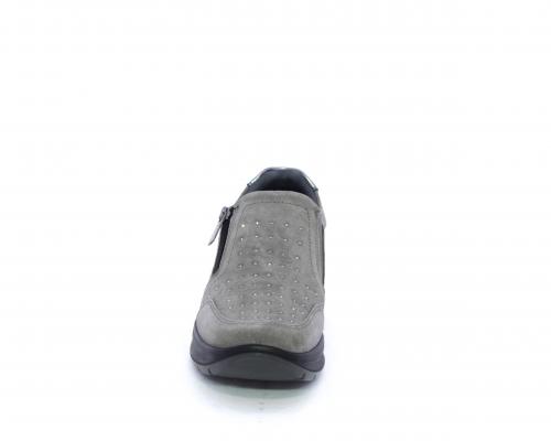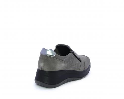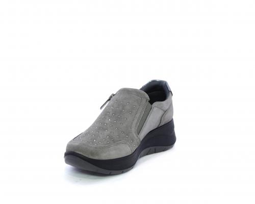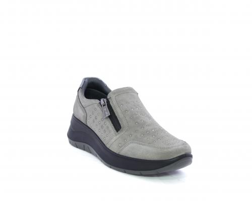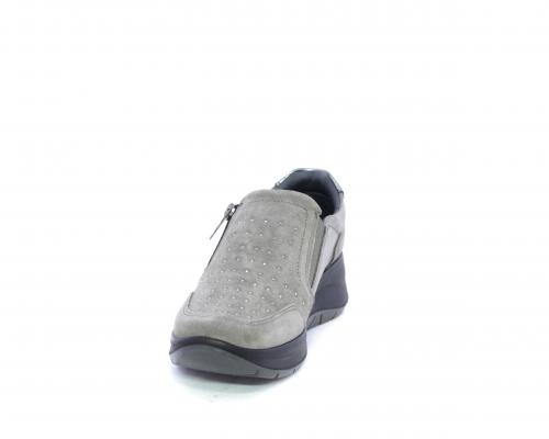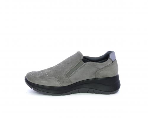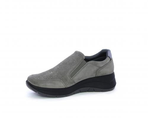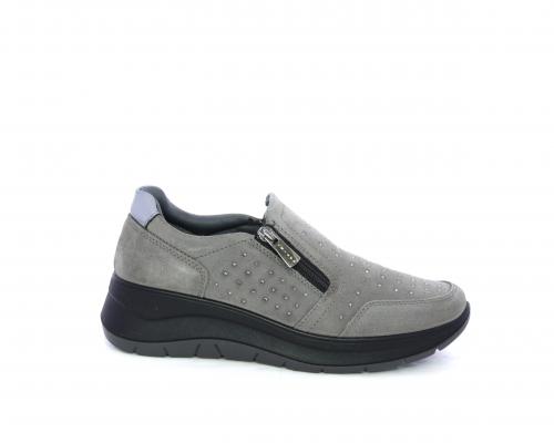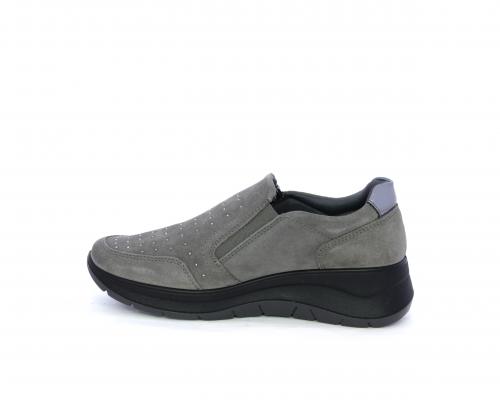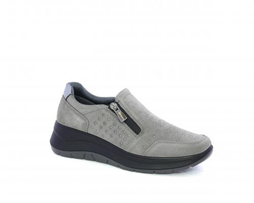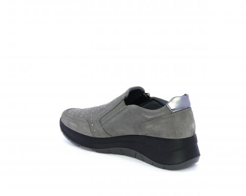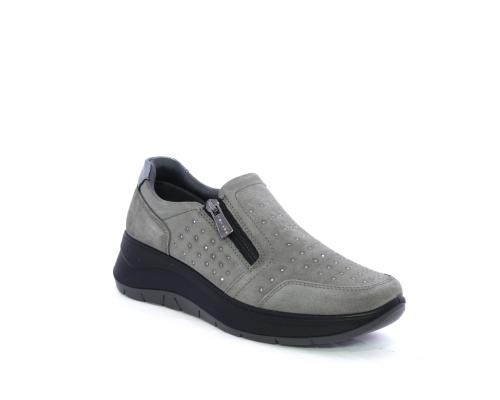Sneakers con zeppa in gomma, tomaia in camoscio con applicazione di brillatini, sul collo del piede elastico e chiusura laterale, sottopide in pelle, fodera interna in tessuto, fusbet anatomico estraibile.
