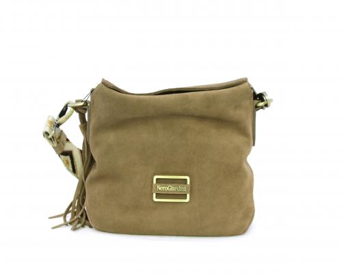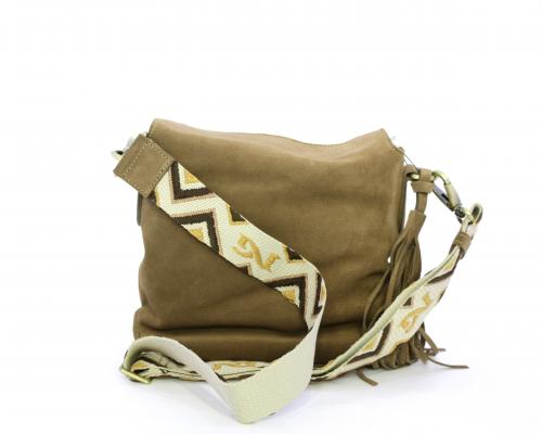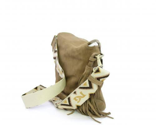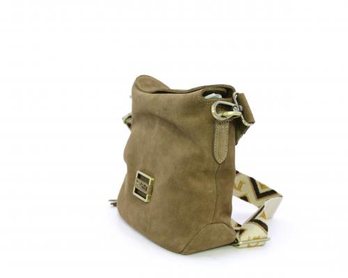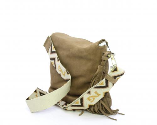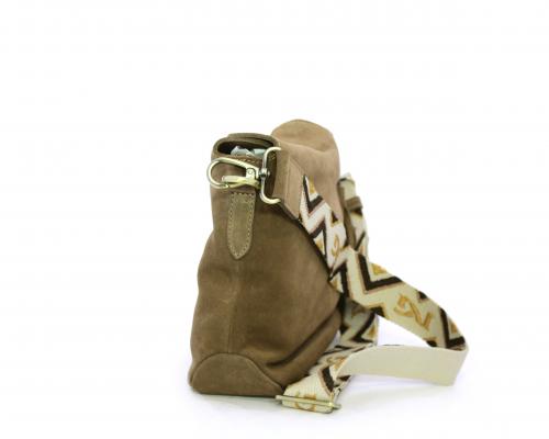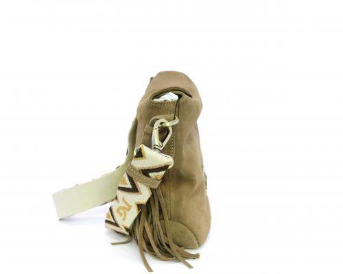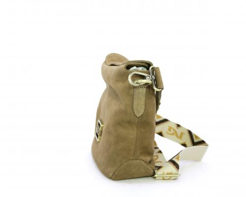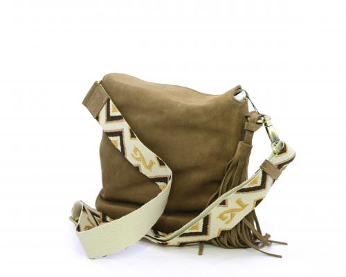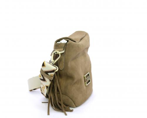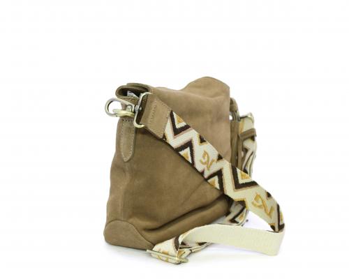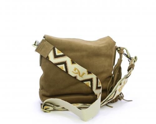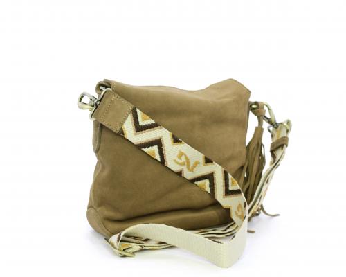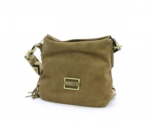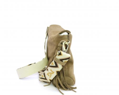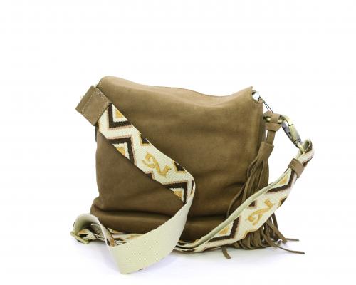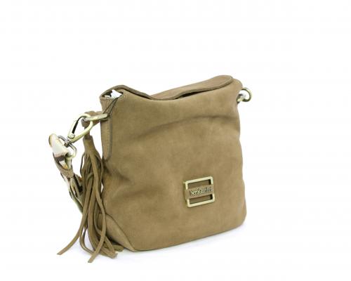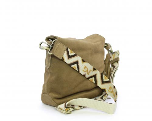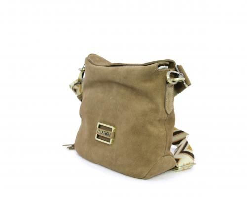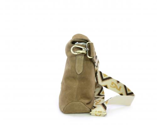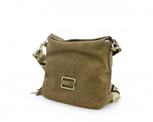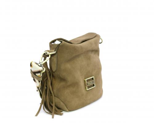 Borsa di forma rettangolare in renna, chiusura superiore della borsa con clip, rifiniture in acciaio, tracolla in tessuto ed accessorio laterale in renna, fodera interna in tessuto con taschino.