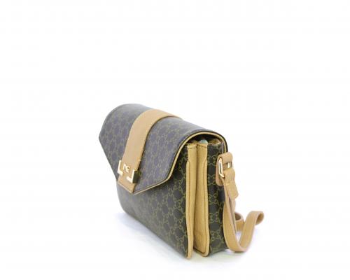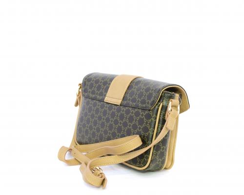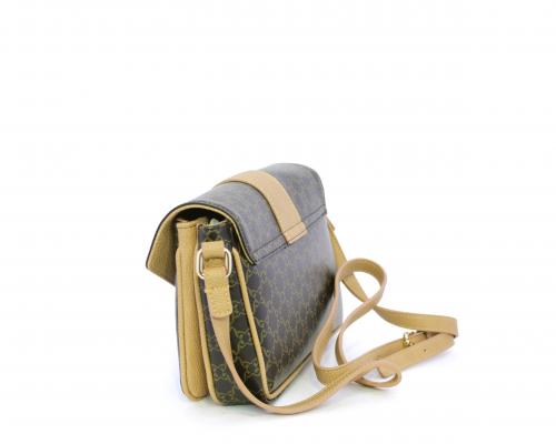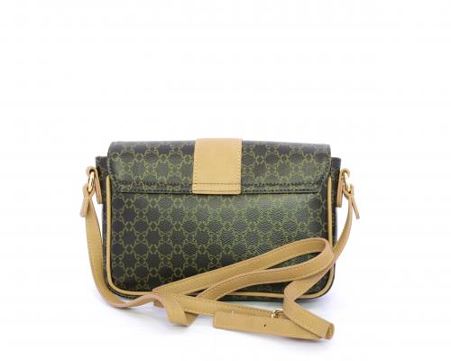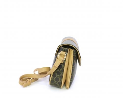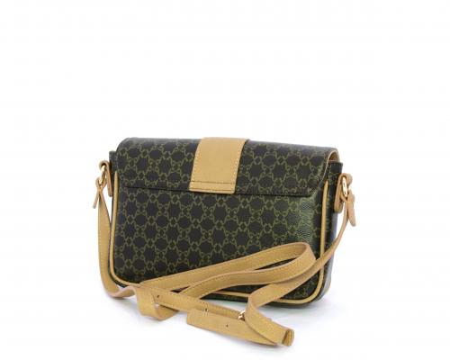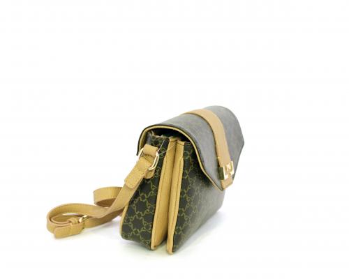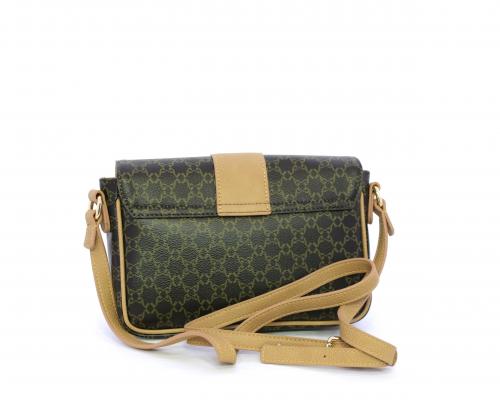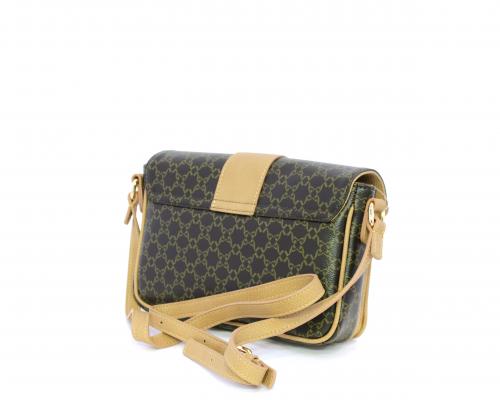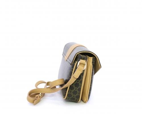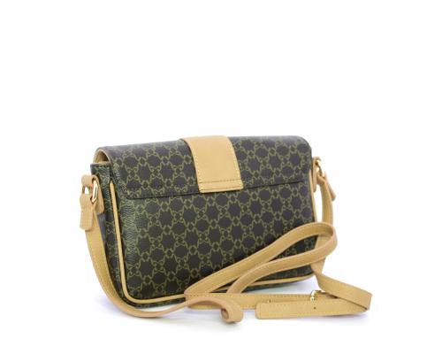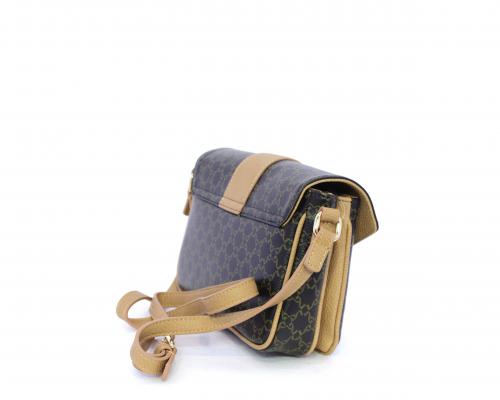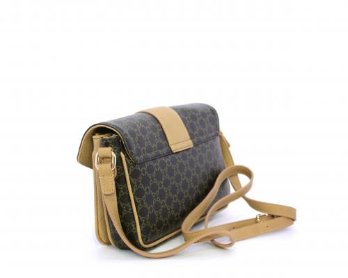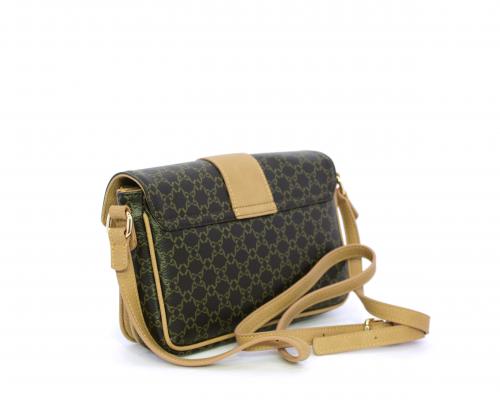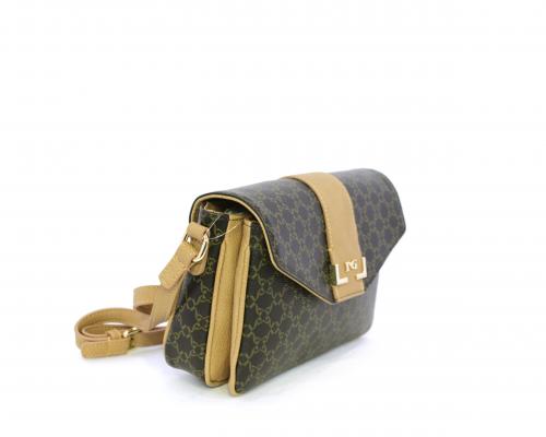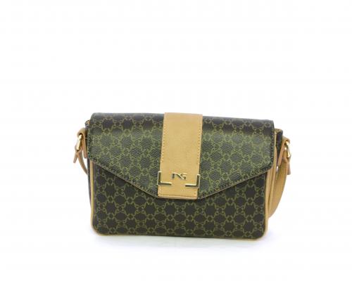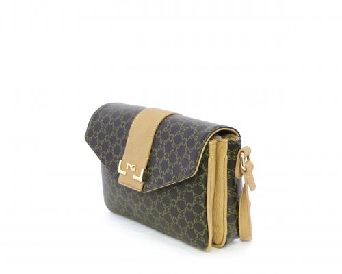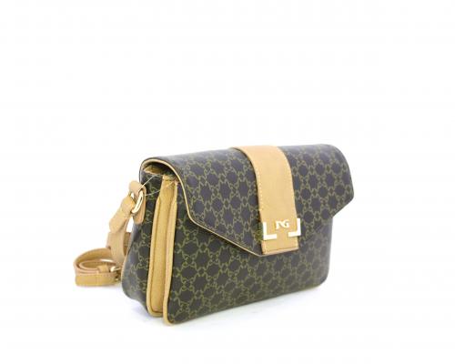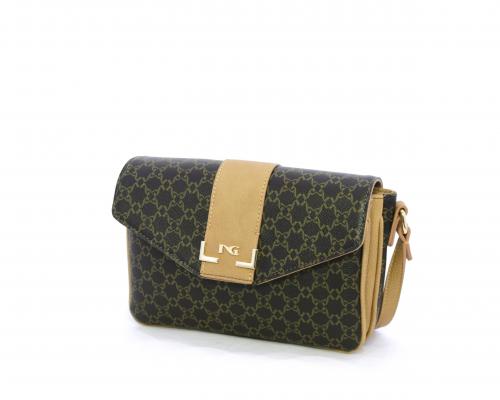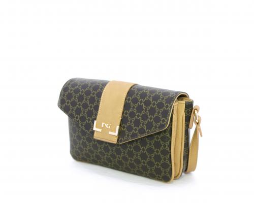 Borsa di forma rettangolare, in pelle stampata con logo NG e banda centrale in tinta unita sulla ribaltina, ribaltina chiusa con clip, doppio scomparto separato, tracolla lunga in pelle regolabile,rifiture color oro, fodera interna in tessuto e taschino interno.