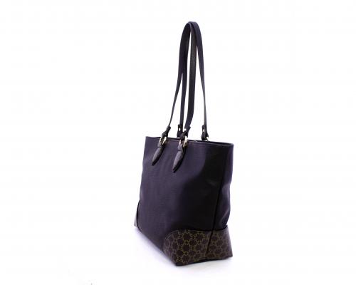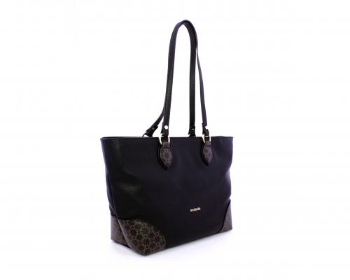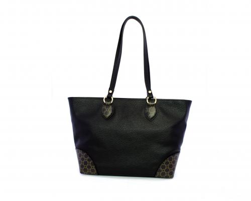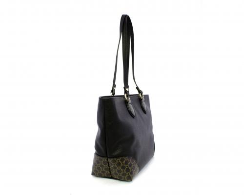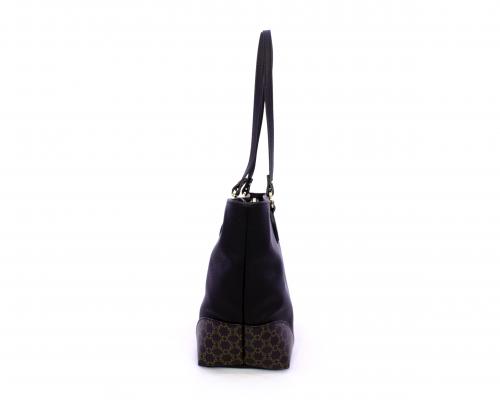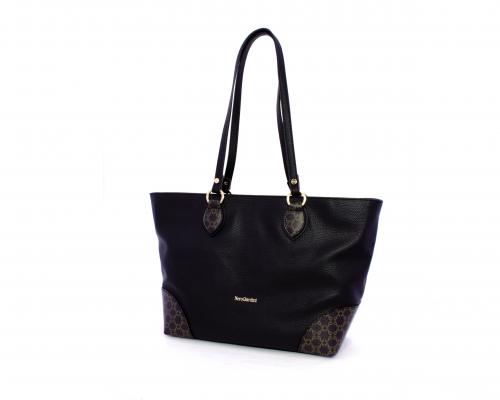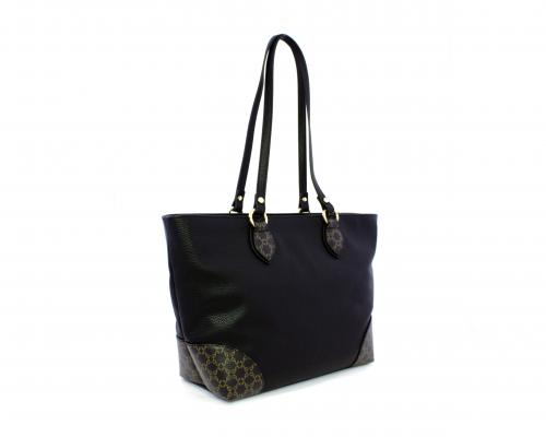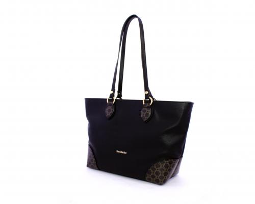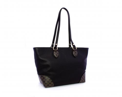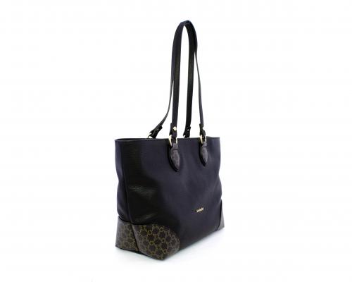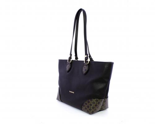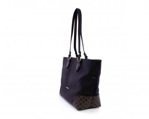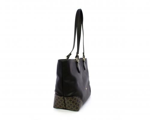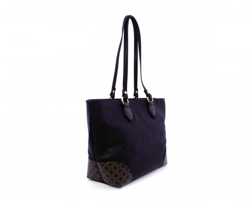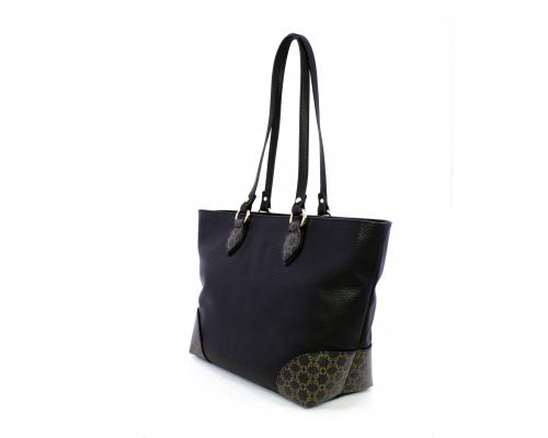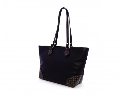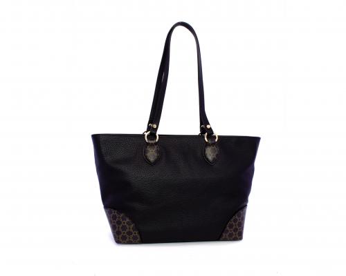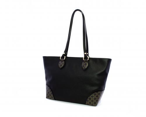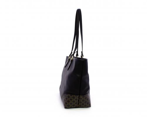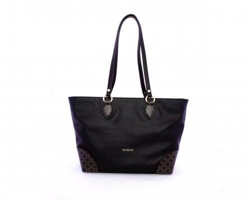 Borsa in vera pelle monospalla con doppio manico in pelle, con inserti color oro, ribaltina in pelle con clip, chiusura generale della borsa con zip, fodera in tessuto con due taschini uno aperto e uno chiuso con zip.