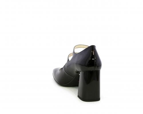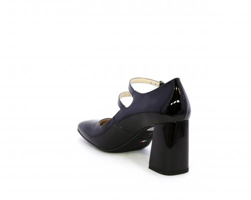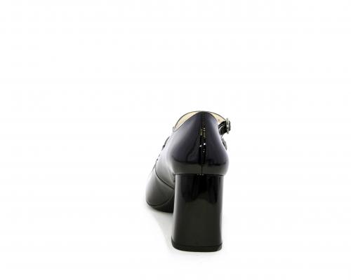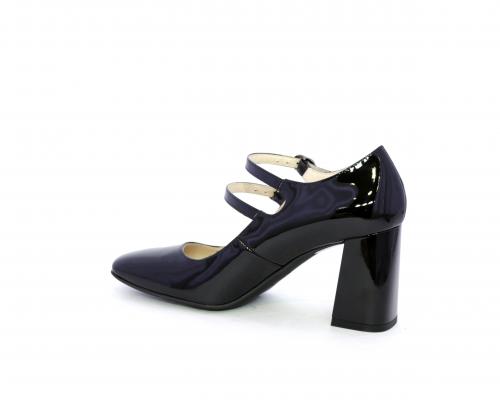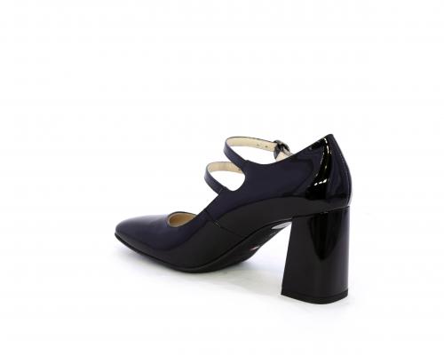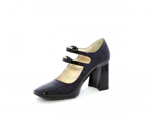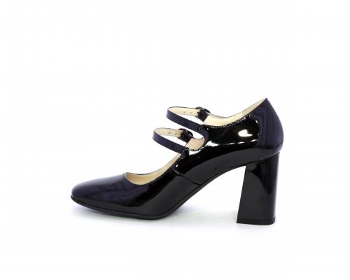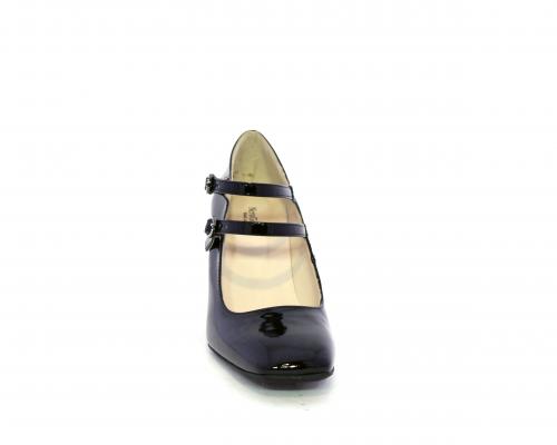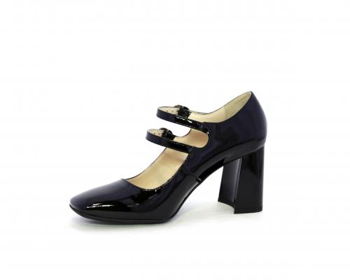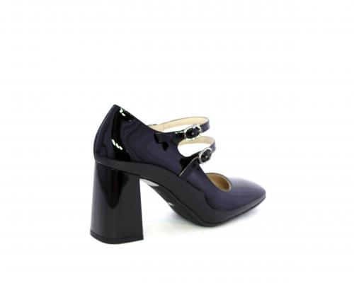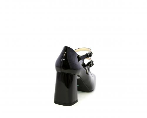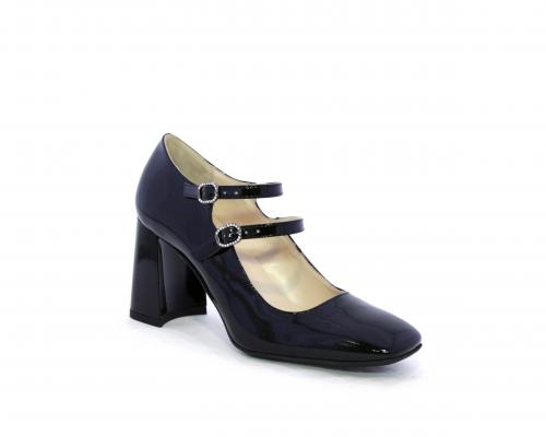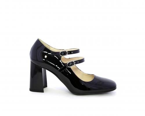 Decollettè con fondo in gommae tacco in vernice, tomaia in vernice con doppio cinturino con chiusura con brillantini, punta quandrata, sottopiede e fodera interna in pelle, fusbet anatomico.