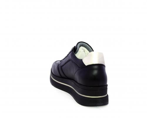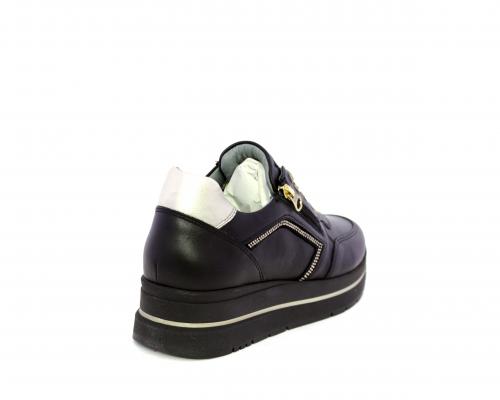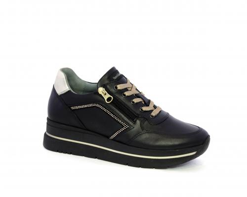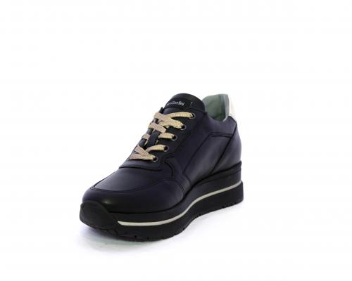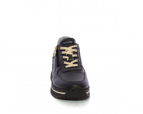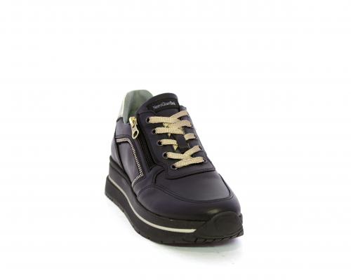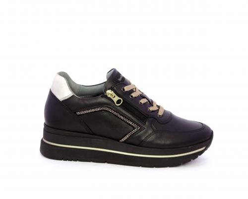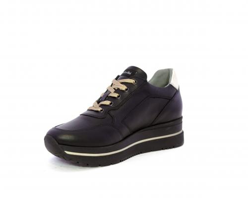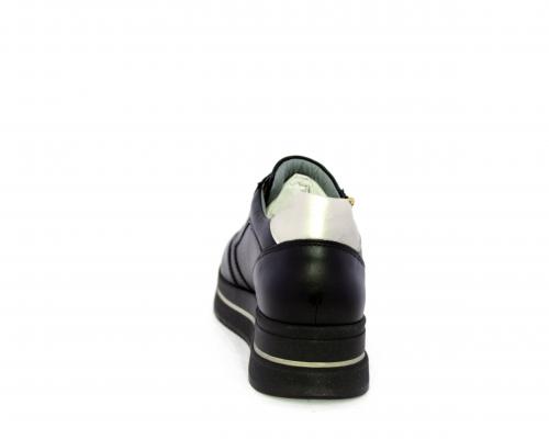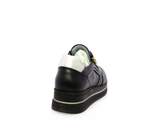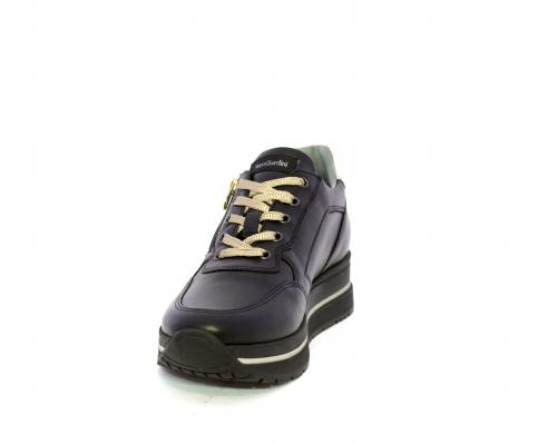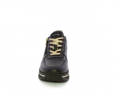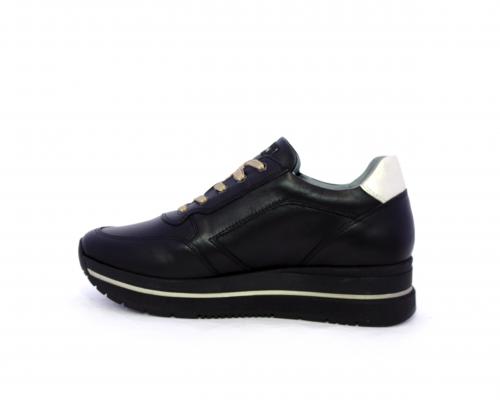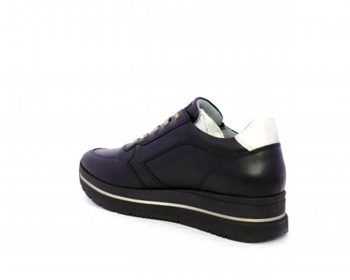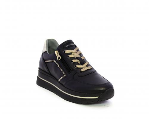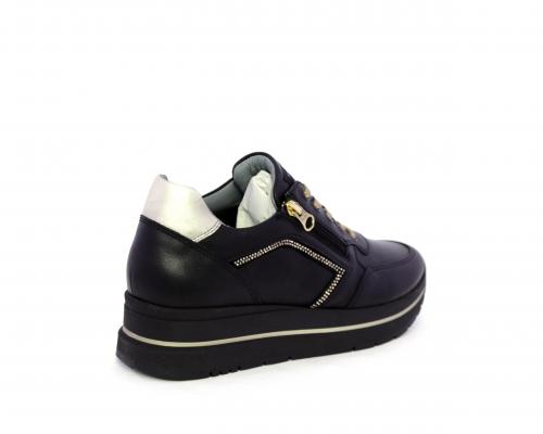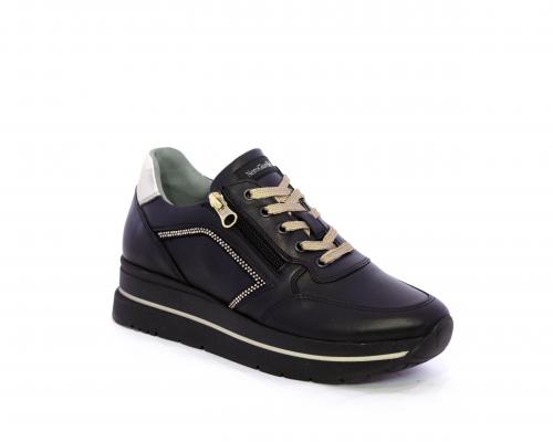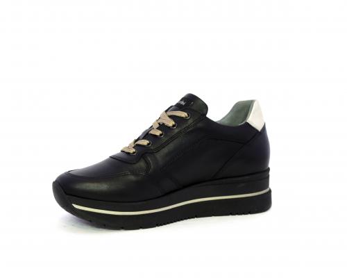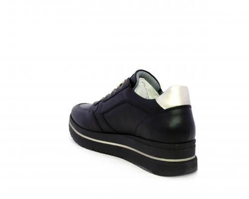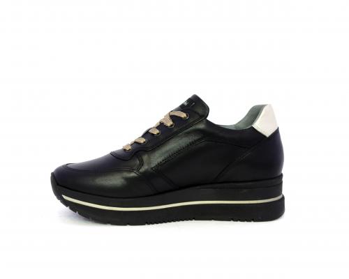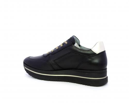 Sneakers con lacci e chiusura laterale per facilitare la calzata, platfoarm in gomma nera e riga dorata, tomaia in pelle con rifiniture dorate, sottopiede e fodera interna in pelle, fusbet anatomico estraibile, con sistema DryGo che svolge una doppia azione assorbe l'aumidità quando la scarpa è indossata e si asciuga rapidamente quando si togli la calzatura.