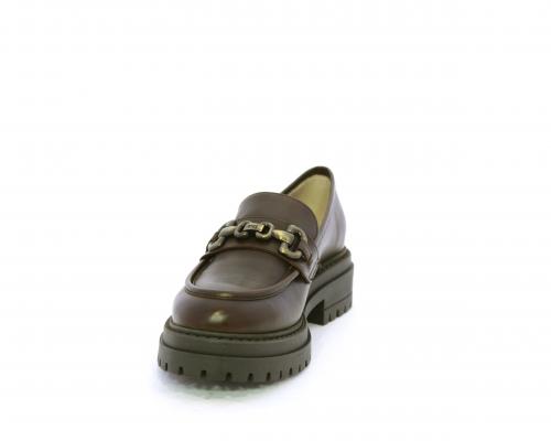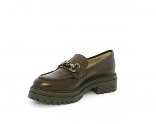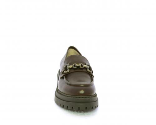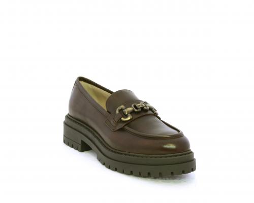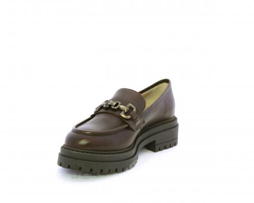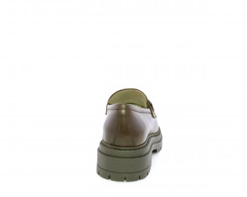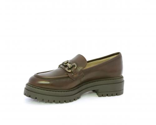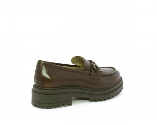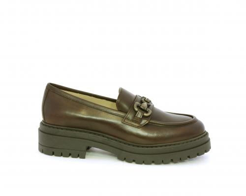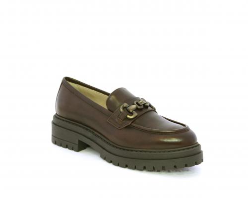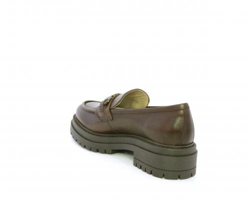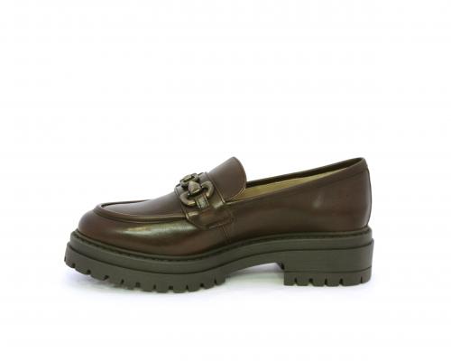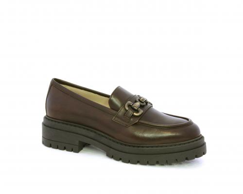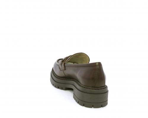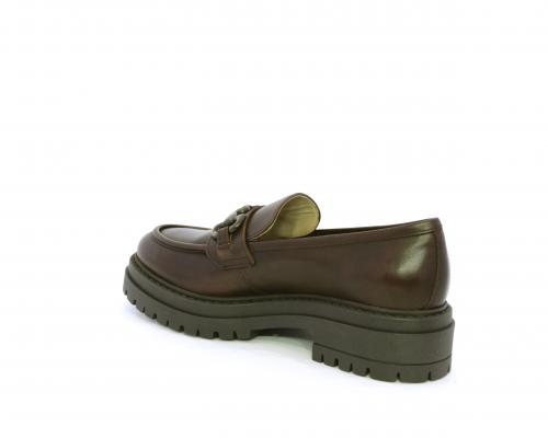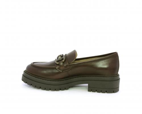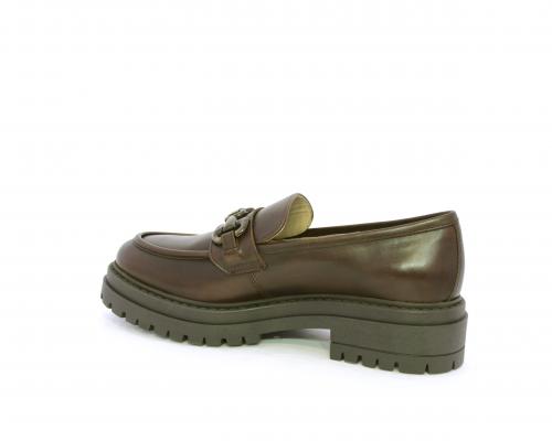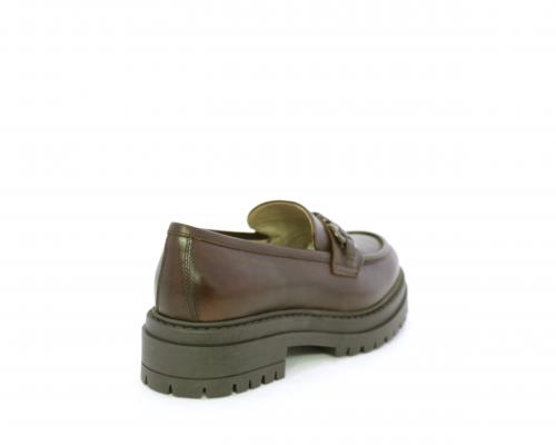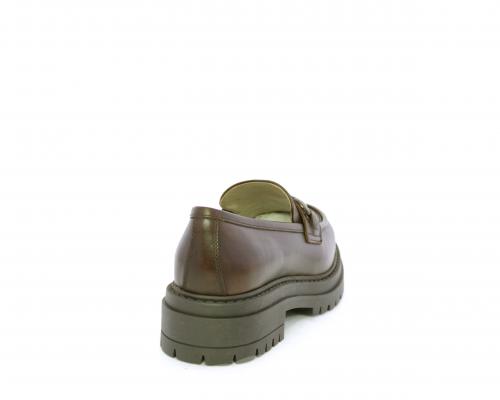 Mocassino con tacco e fondo in gomma, tomaia in pelle, sottopiede e fodera interna in pelle, fusbet anatomico.