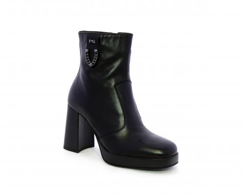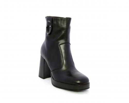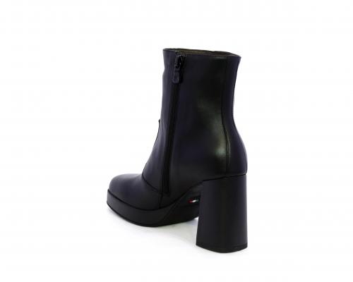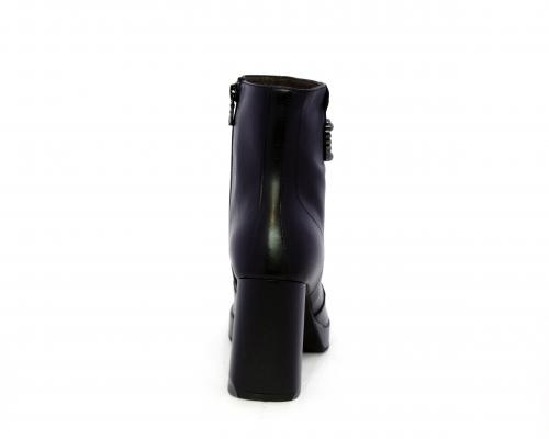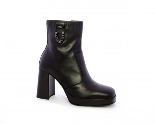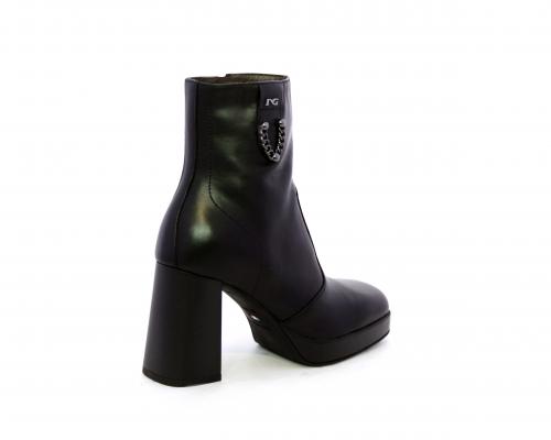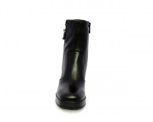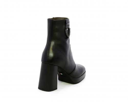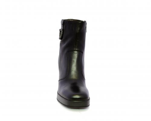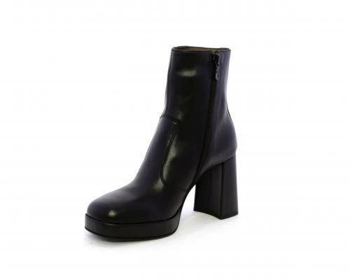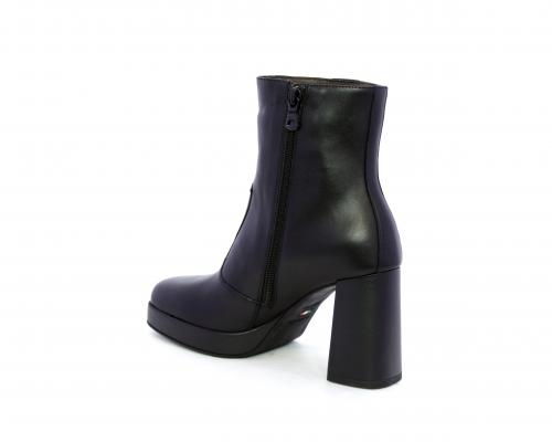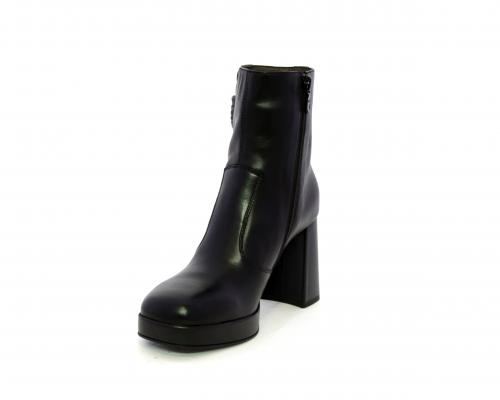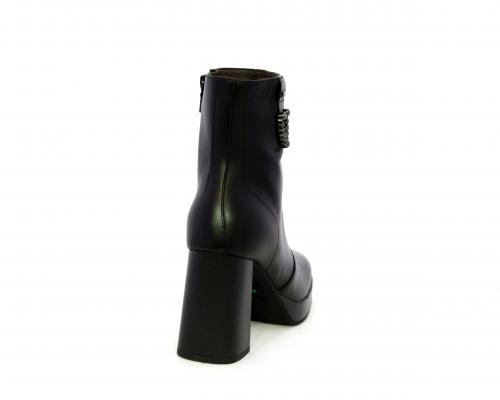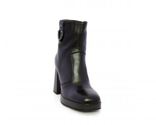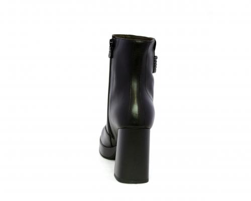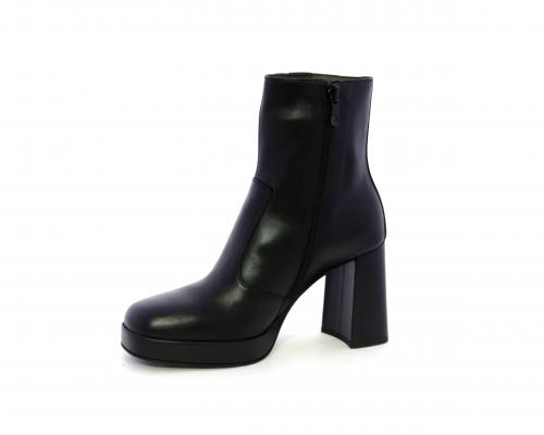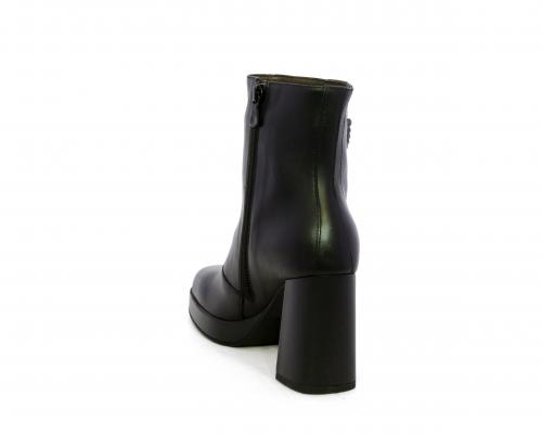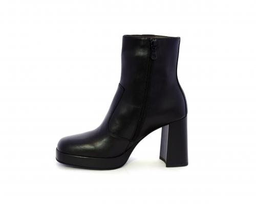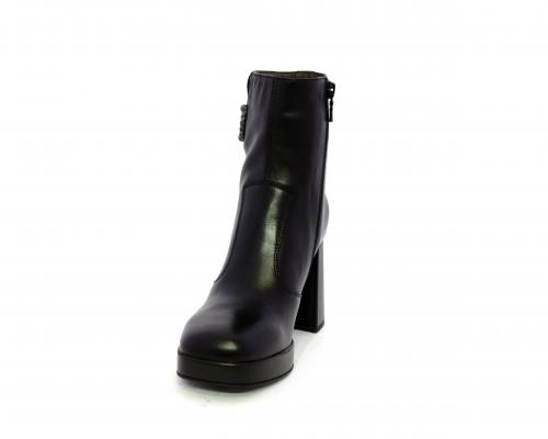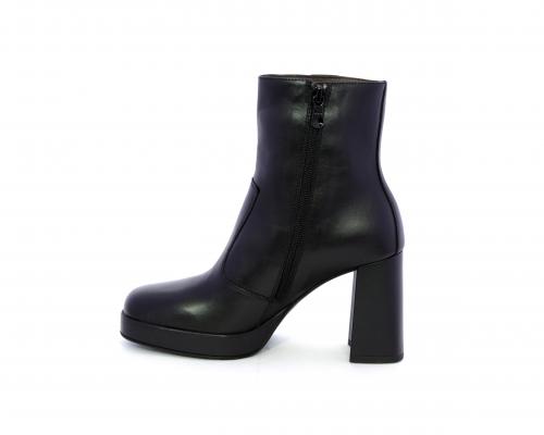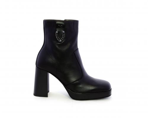 Tronchetto con chiusura laterale, tacco largo e plateaux rivestiti in pelle, tomaia in pelle con accessorio laterale in acciaio, punta quadrata, sottopiede e fodera interna in pelle, fusbet anatomico.