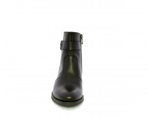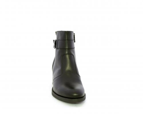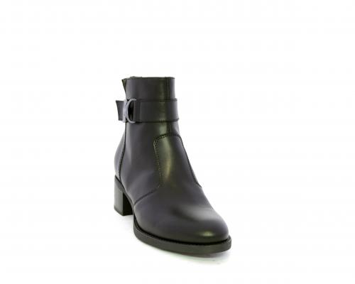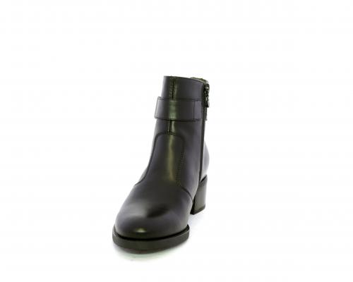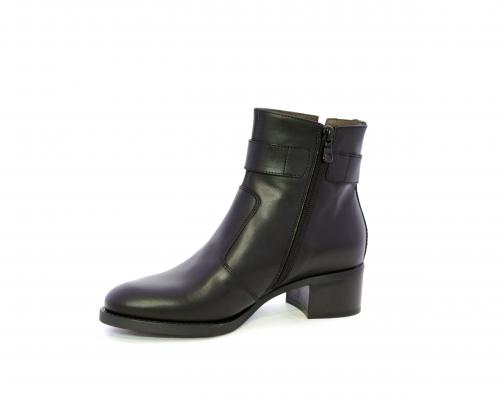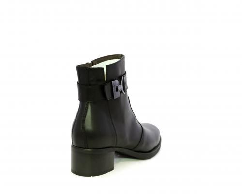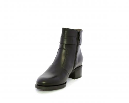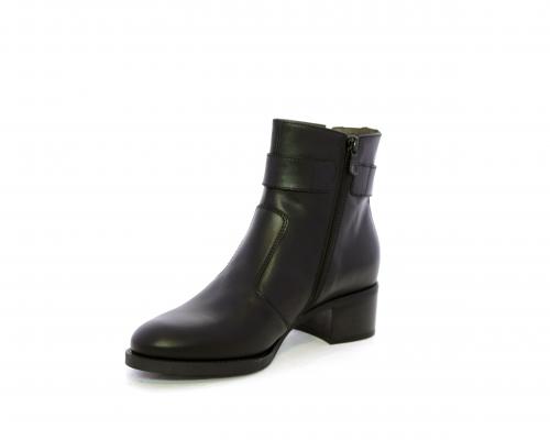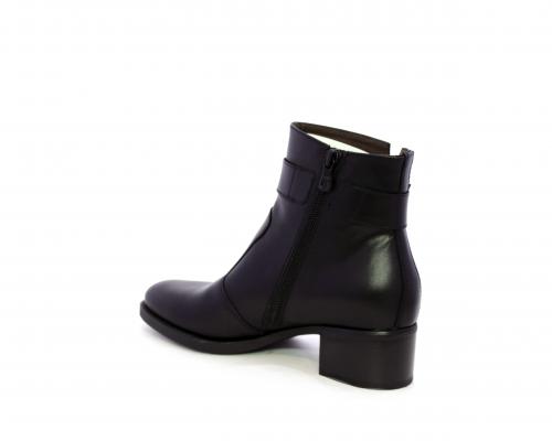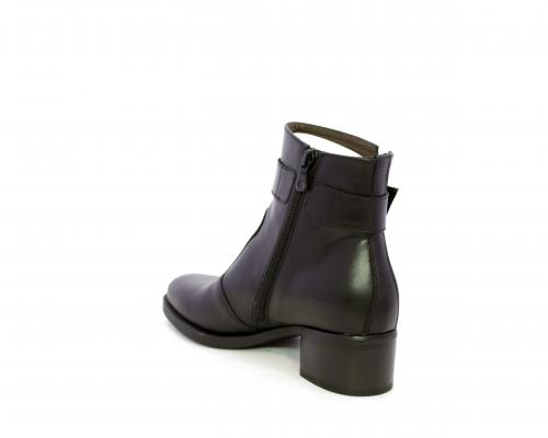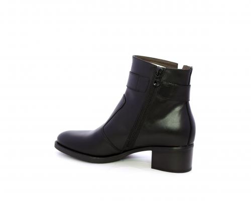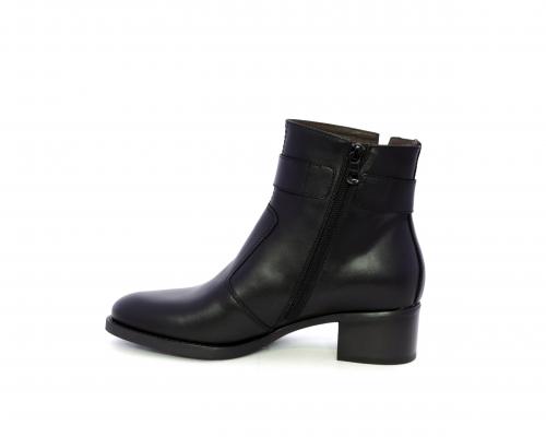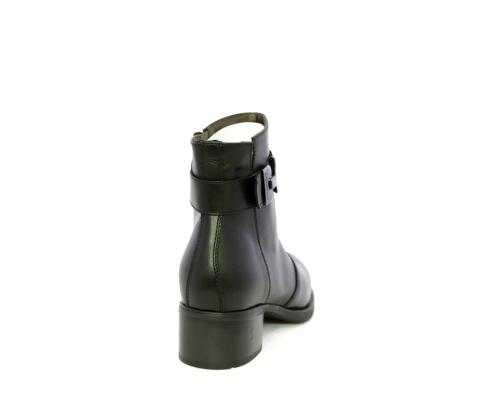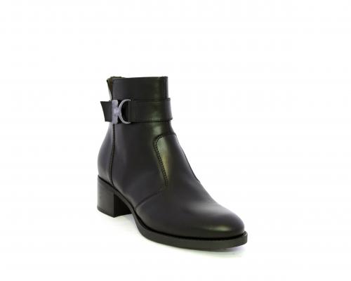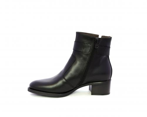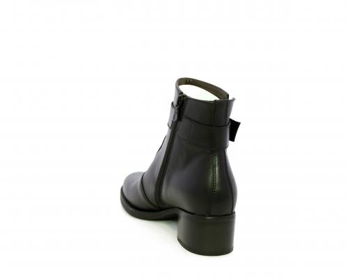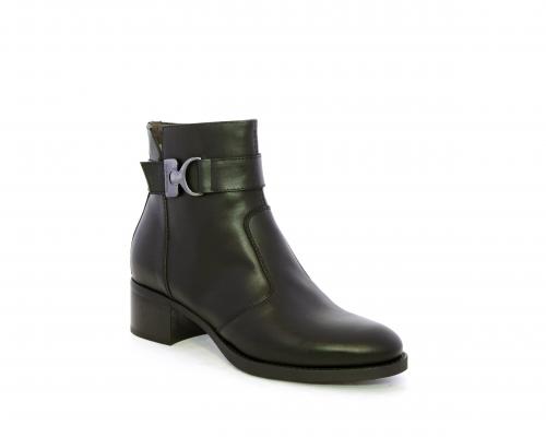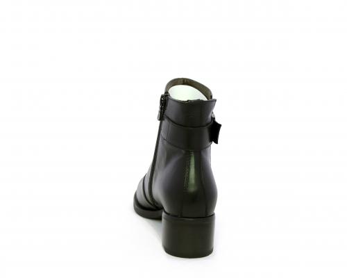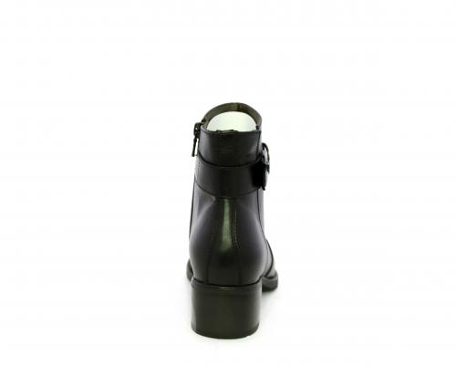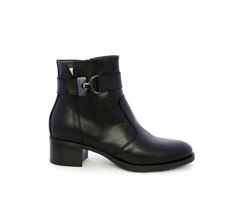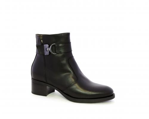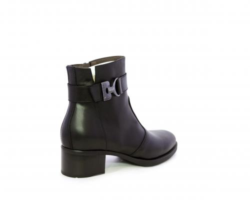 Tronchetto con chiusura laterale, tacco largo effetto legno, tomaia in pelle con accessorio laterale in acciaio, sottopiede e fodera interna in pelle, fusbet anatomico estraibile con sistema DryGo, che svolge una doppia azione assorbe l'umidità quando si indossa la calzatura e si asciuga rapidamente quando si toglie lo stivaletto.