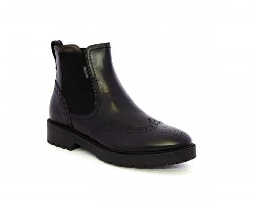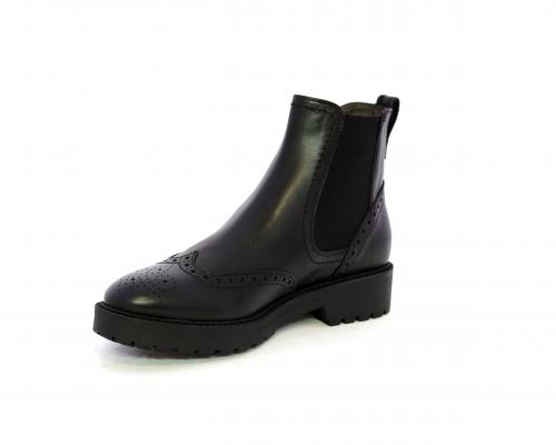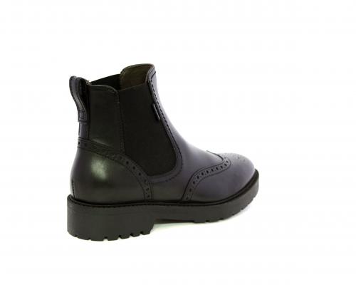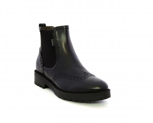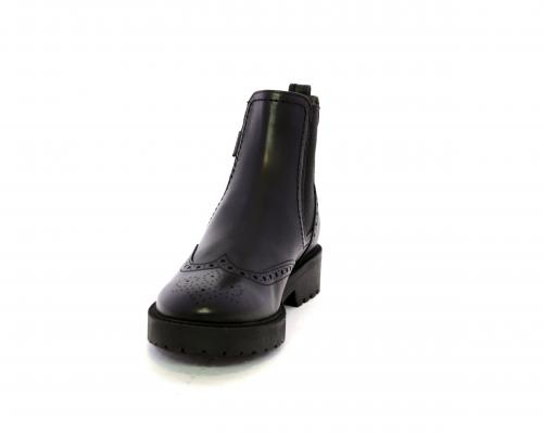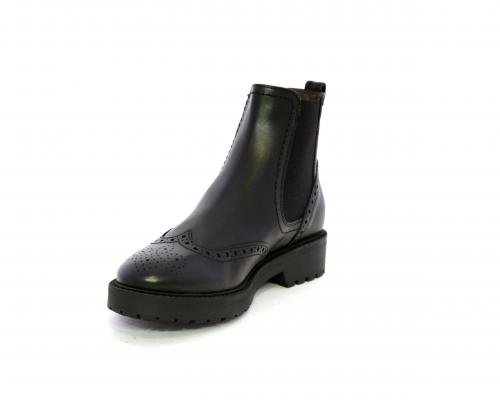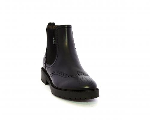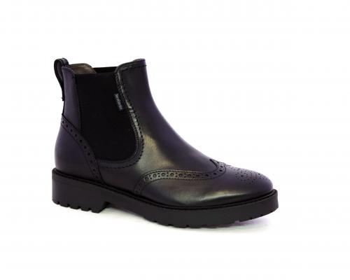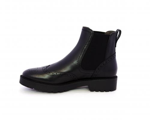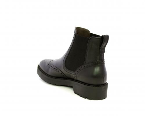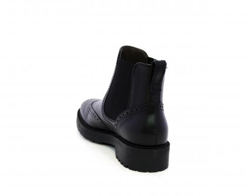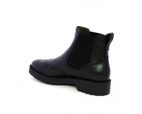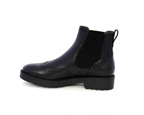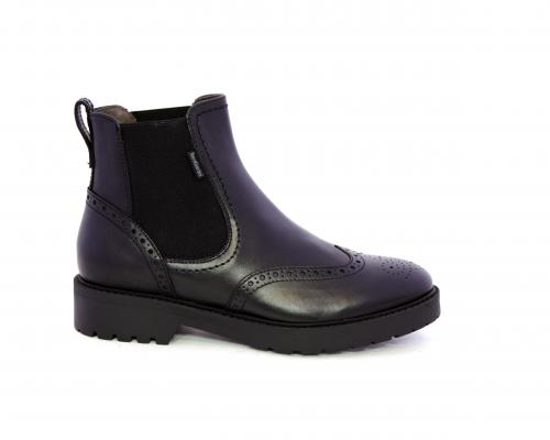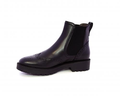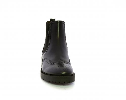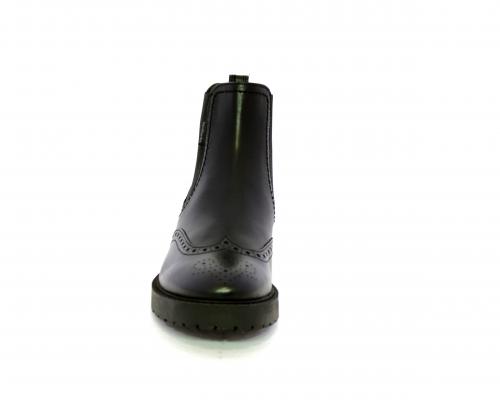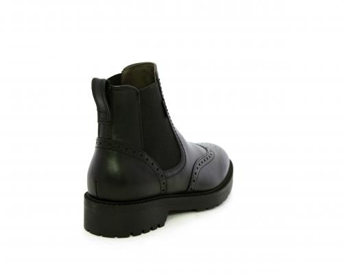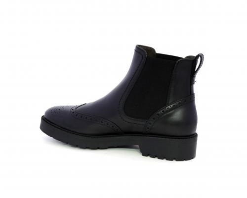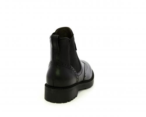 Tronchetto con doppio elastico laterale, tacco e fondo in gomma, tomaia in pelle con disegno stile inglish, sottopiede e fodera interna in pelle, fusbet anatomico.