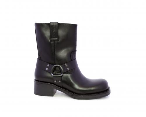Tronchetto modello biker con chiusura laterale, fondo in gomma, tomaia in pelle con accessori in metallo, punta quandrata, sottopiede e fodera interna in pelle, fusbet anatomico.