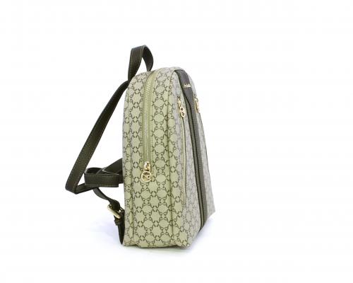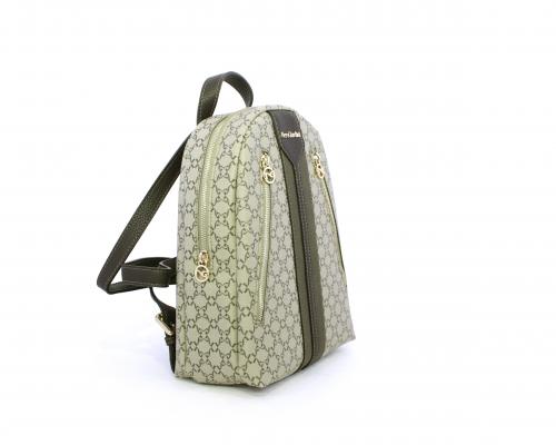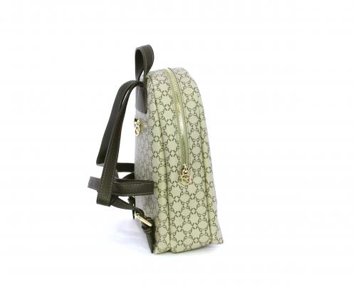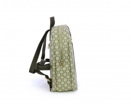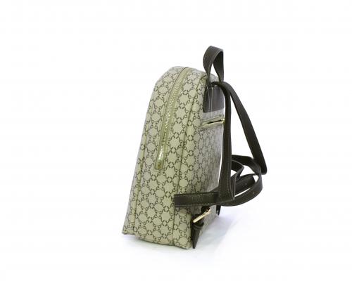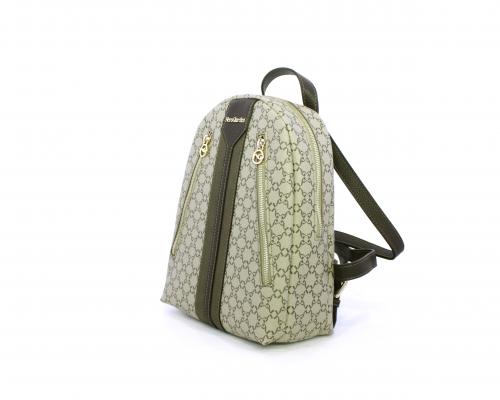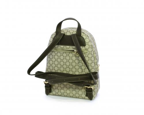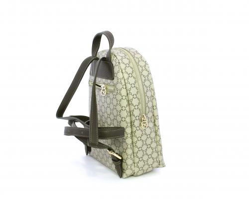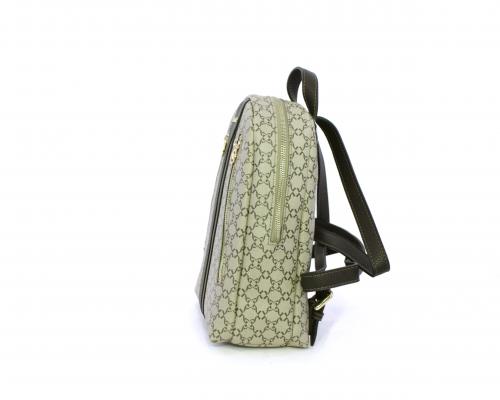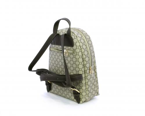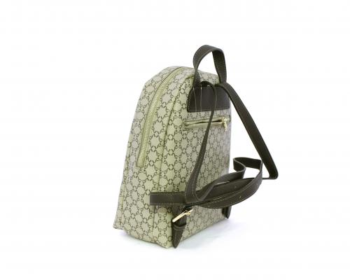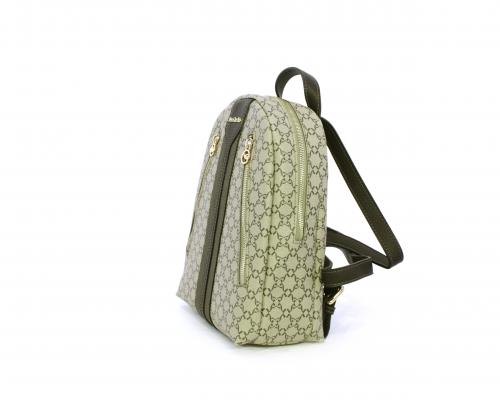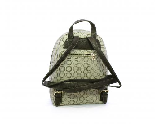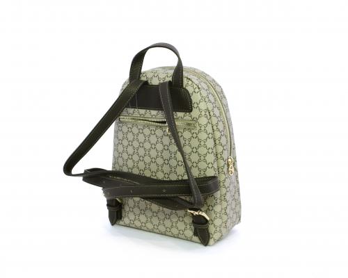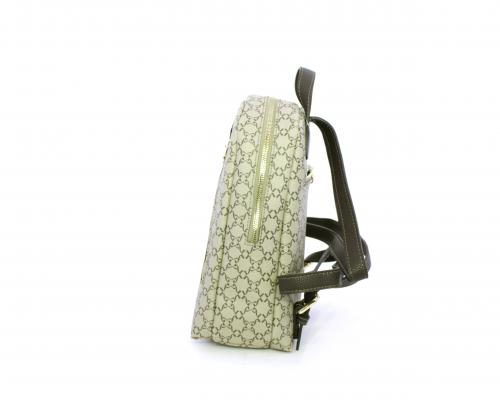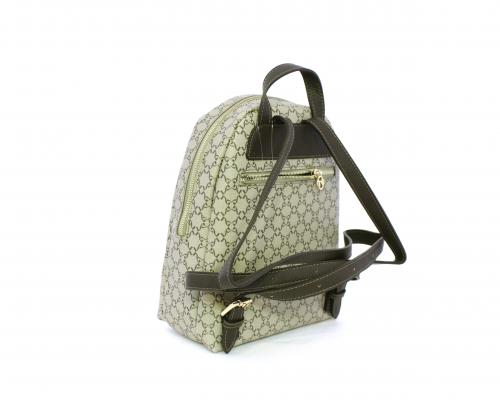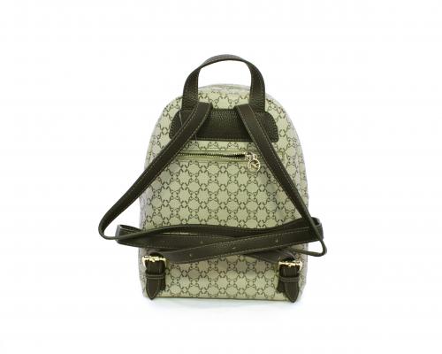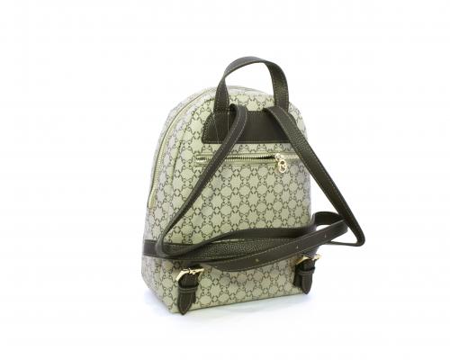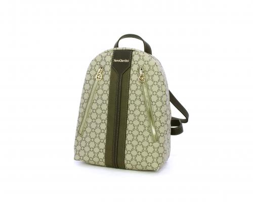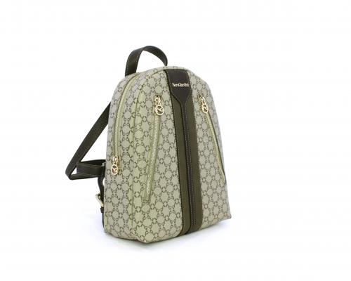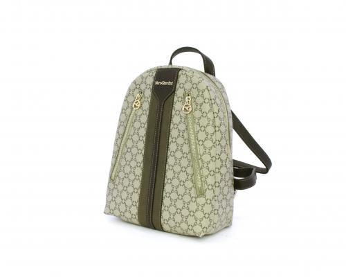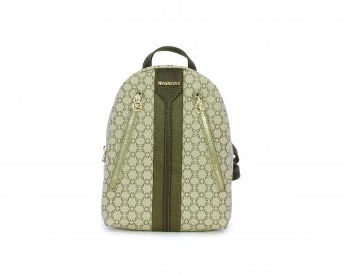 Zainetto in pelle stampata con logo NG e banda centrale in tinta unita, chiuso superiormente dalla cerniera e due taschini anteriori chiusi sempre con zip,rifiniture color oro, tracolle in pelle regolabili, fodera interna in tessuto con taschino interno.