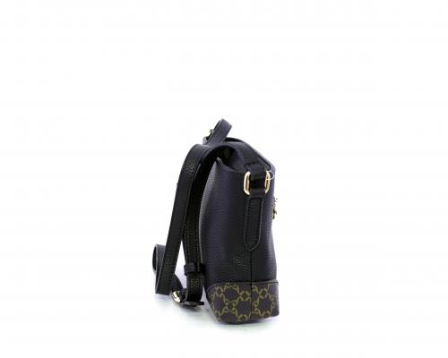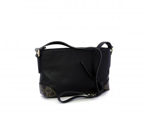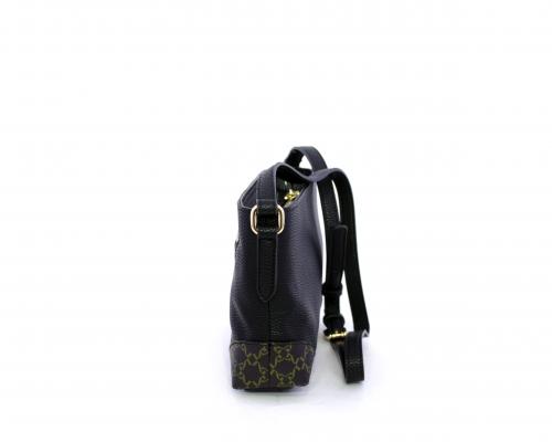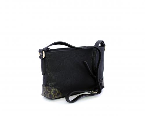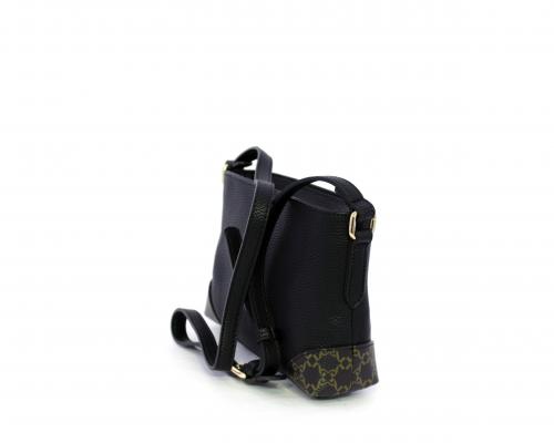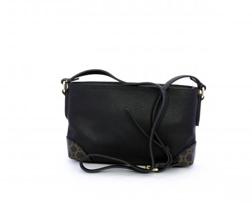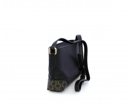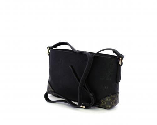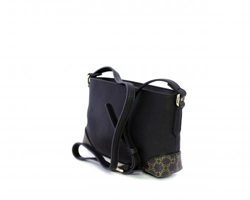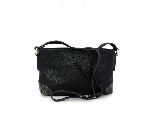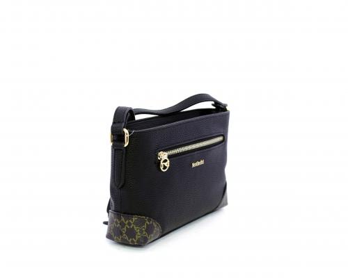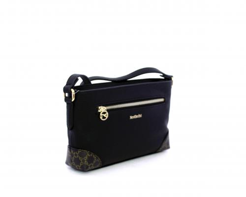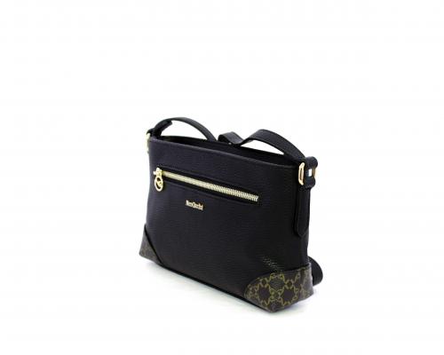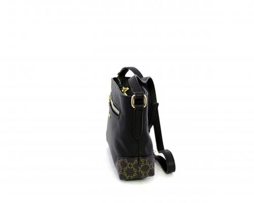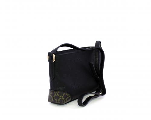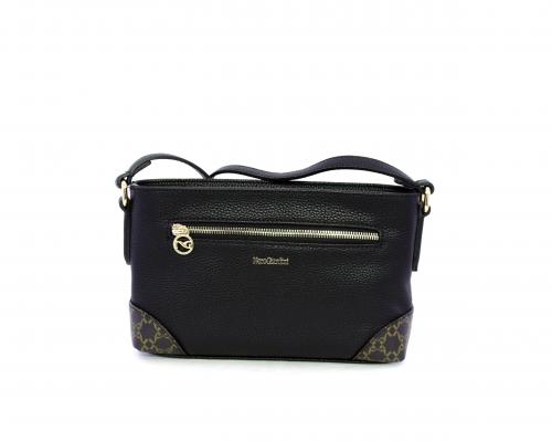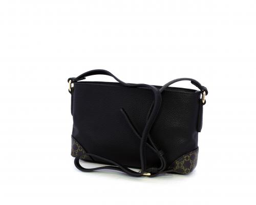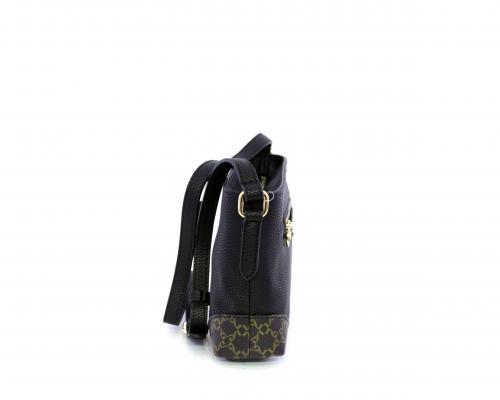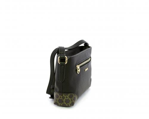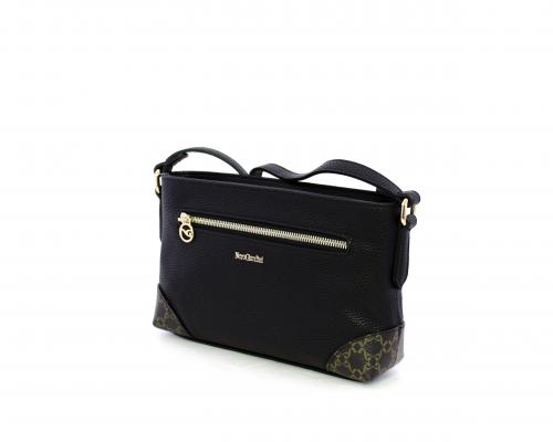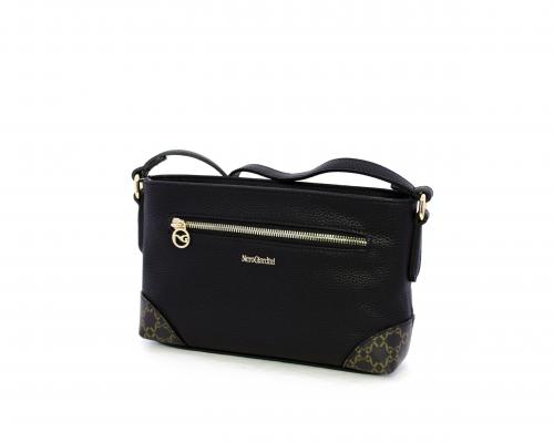Tracolla in pelle, forma rettangolare con chiusura superiore con cerniera, rifiture color oro, nelle parti laterali inferiori bande stampate con logo, fodera interna in tessuto e taschino interno.