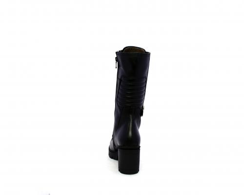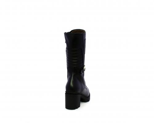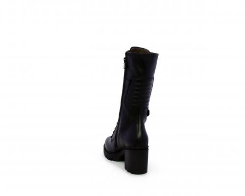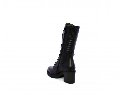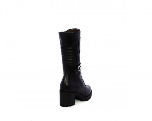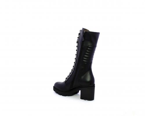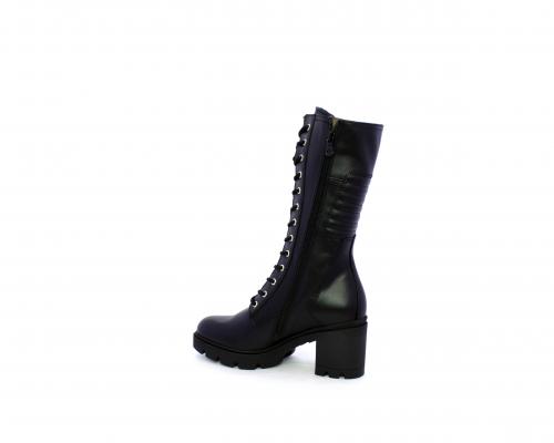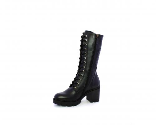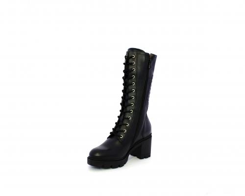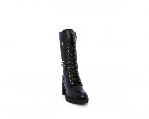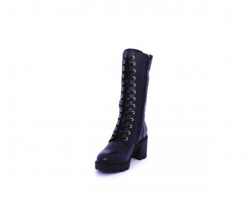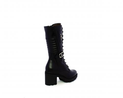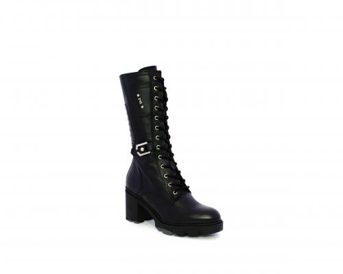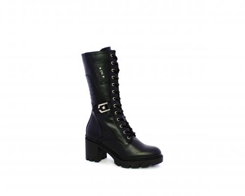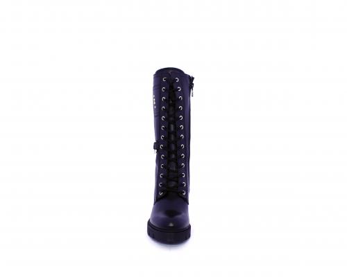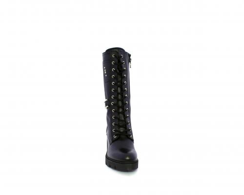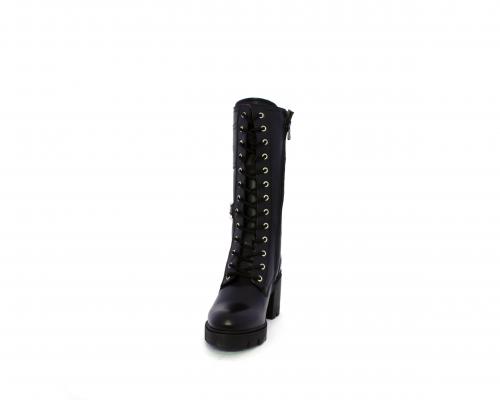 Stivale lungo con lacci e chisura laterale, tacco e fondo in gomma, tomaia in pelle e accessori color oro, sottopiede e fodera interna in pelle, fusbet anatomico.