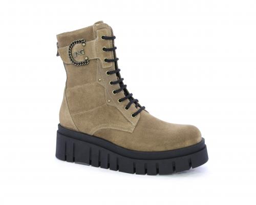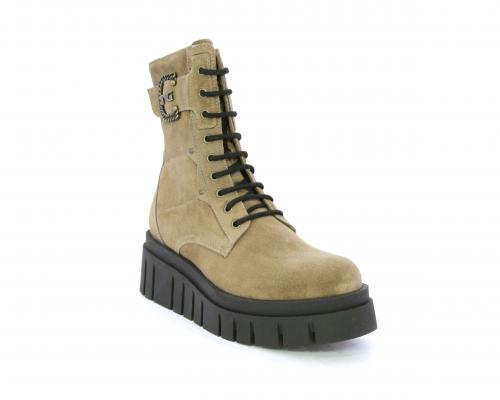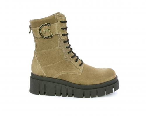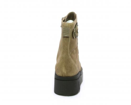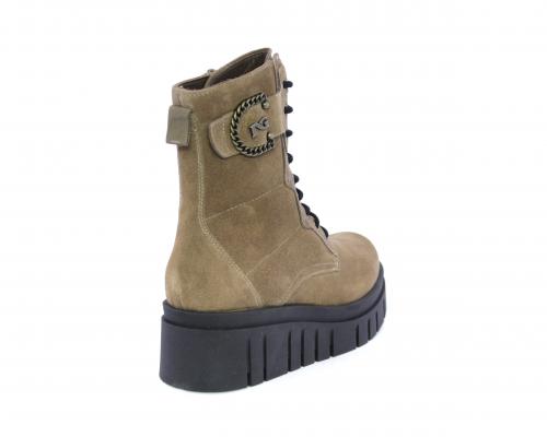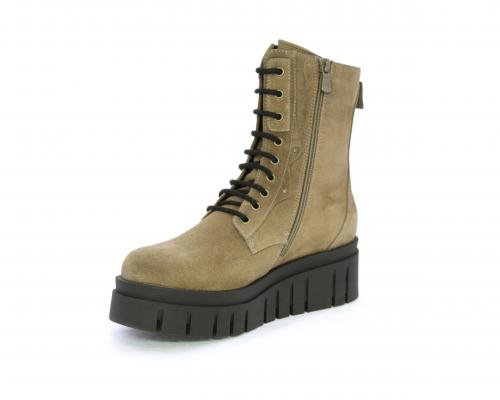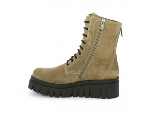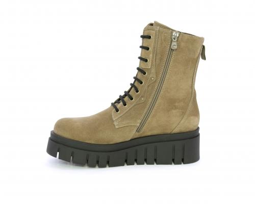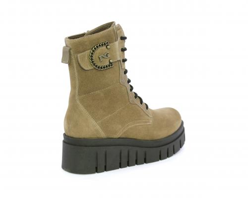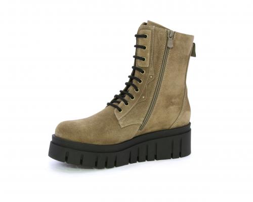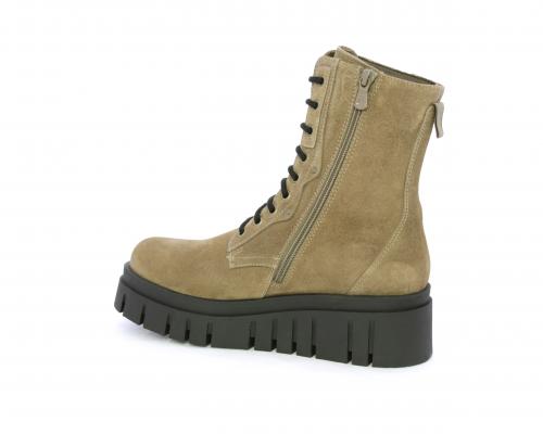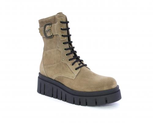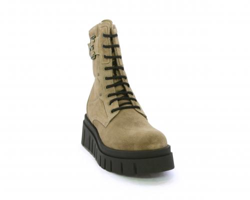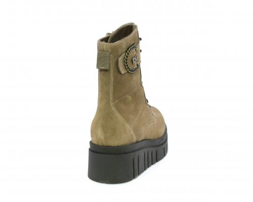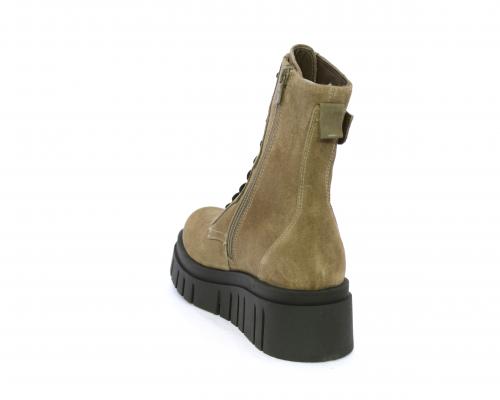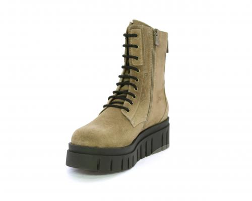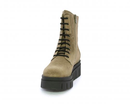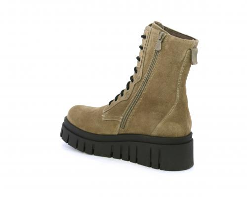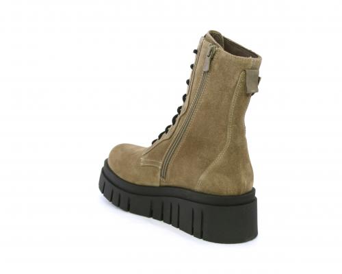 Anfibio con lacci e chiusura laterale per facilitare la calzata, tomaia in camoscio, sottopiede e fodera interna in pelle, fusbet anatomico.