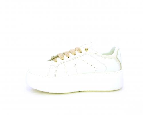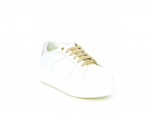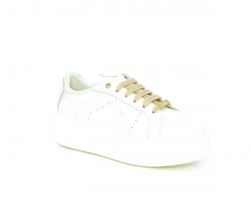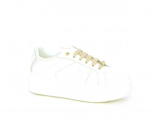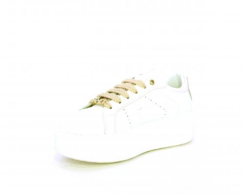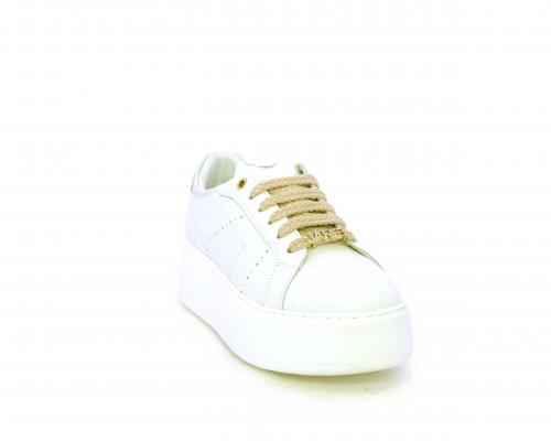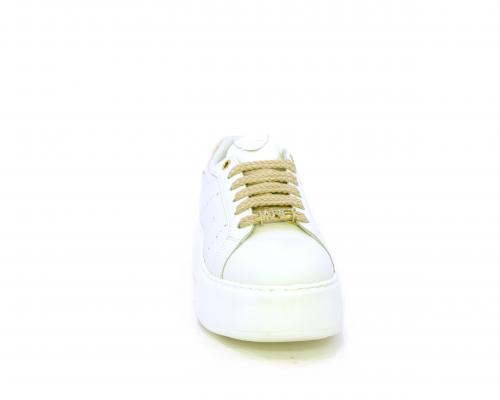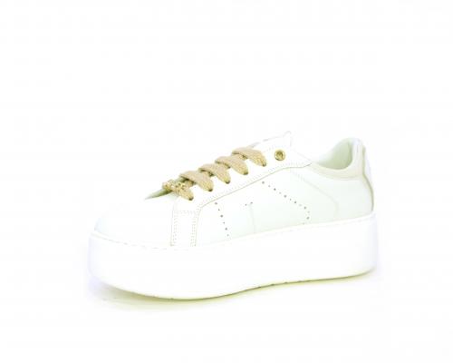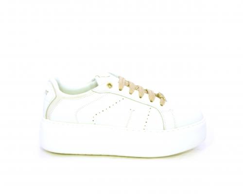 Sneakers allacciata con accessorio in acciaio e brillantini e laccio di ricambio bianco, platfoarm in gomma, tomaia in pelle con rifiniture in vernice rosa, sottopiede in pelle, fodera interna in pelle e tessuto, fusbet anatomico estraibile.