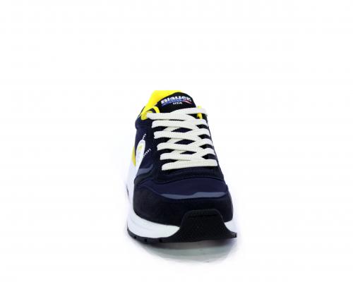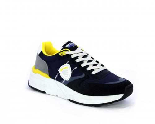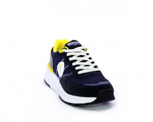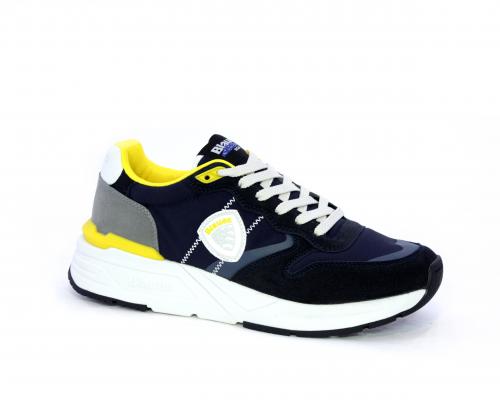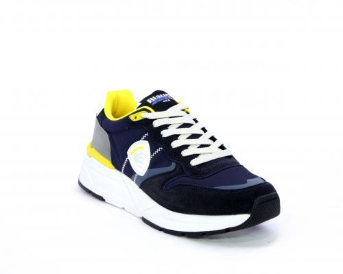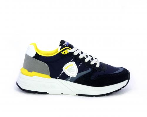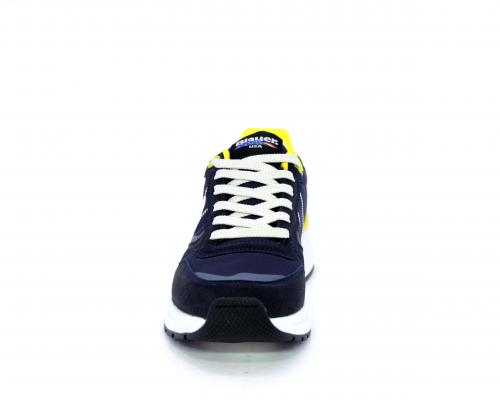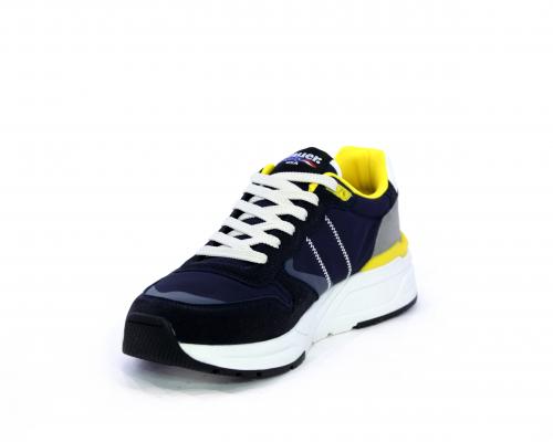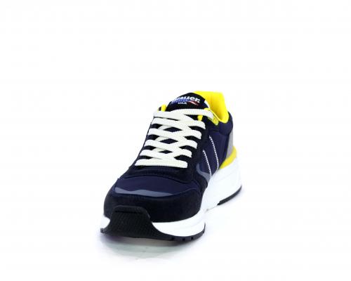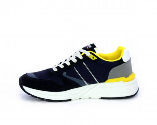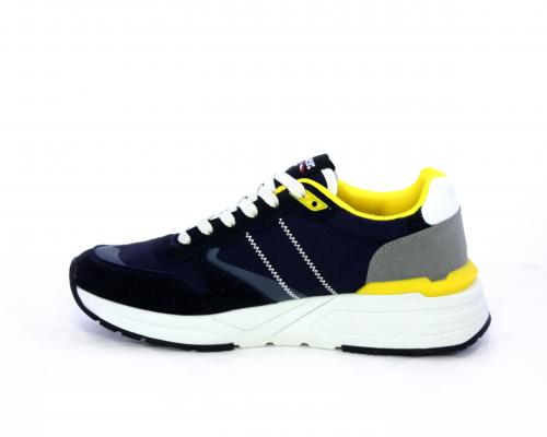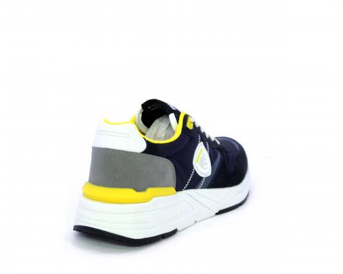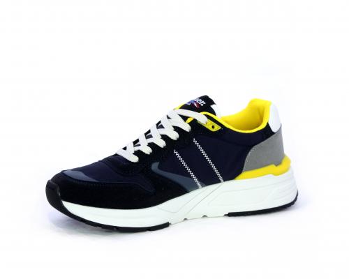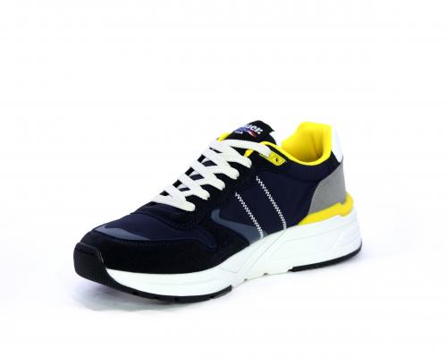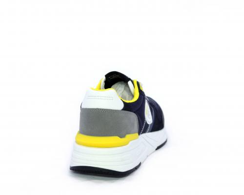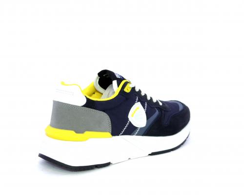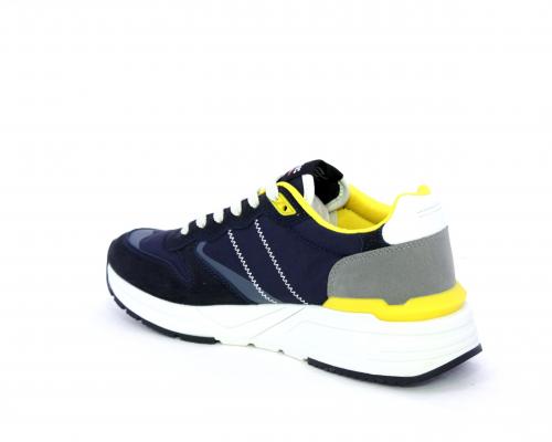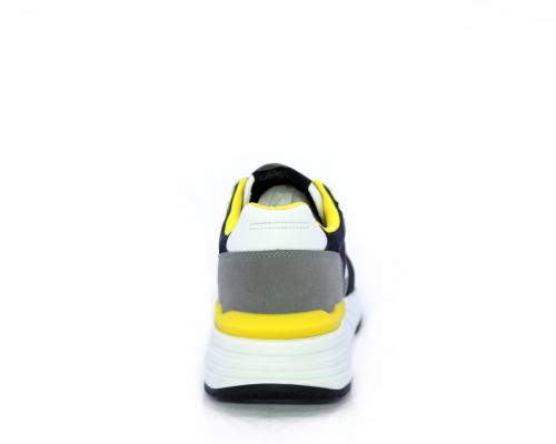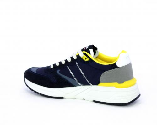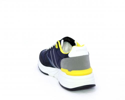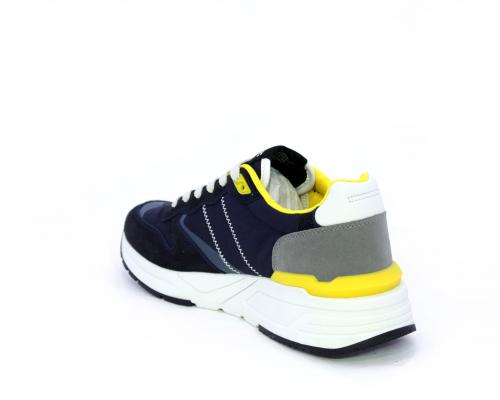 Sneakers allacciata, fondo in gomma bianco, tomaia in suede e tessuto, sottopiede in pelle, fodera interna in tessuto, fusbet anatomico estraibile.