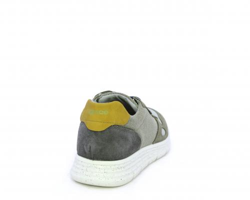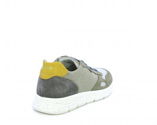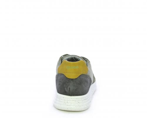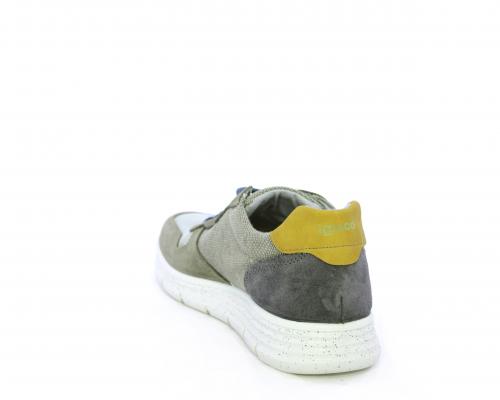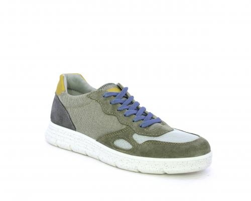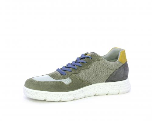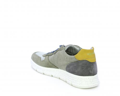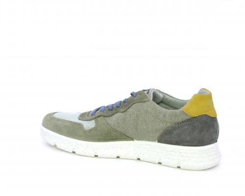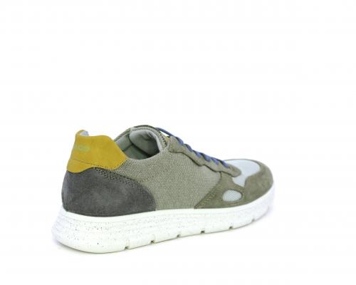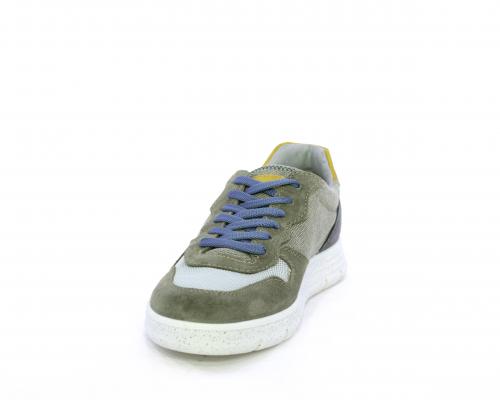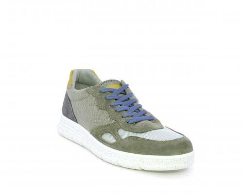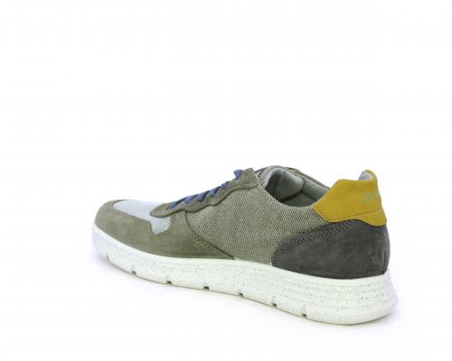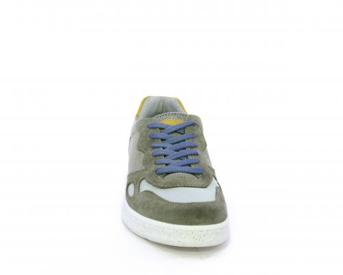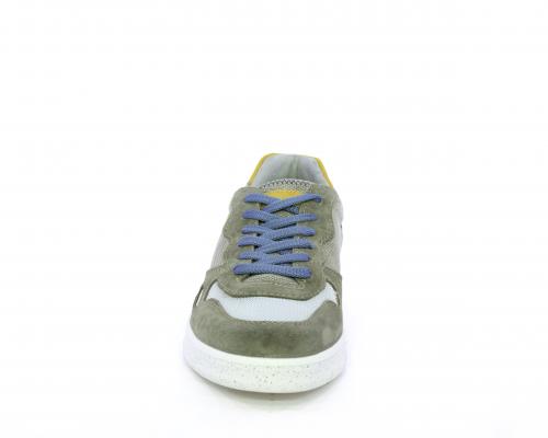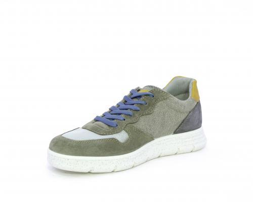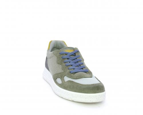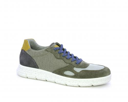 Sneakers con doppio laccio celeste e grigio, fondo in gomma, tomaia in suede e parti in tessuto, sottopiede in pelle, fodera interna in tessuto, fusbet estraibile con memory foam che attenua i micro-impatti durante la camminata.