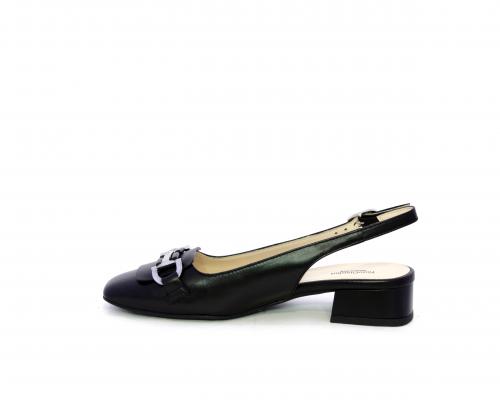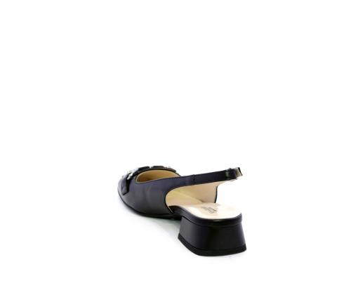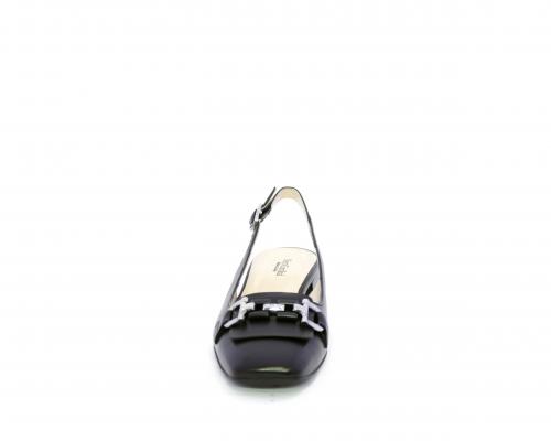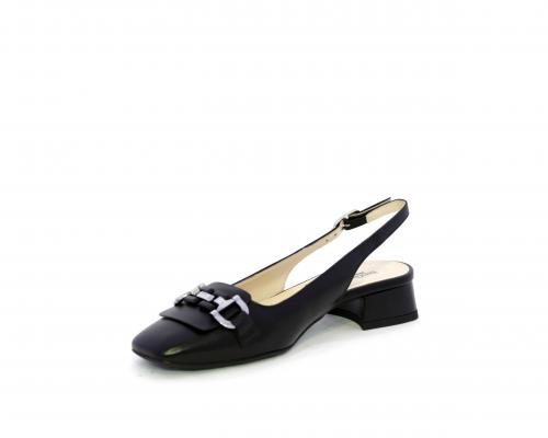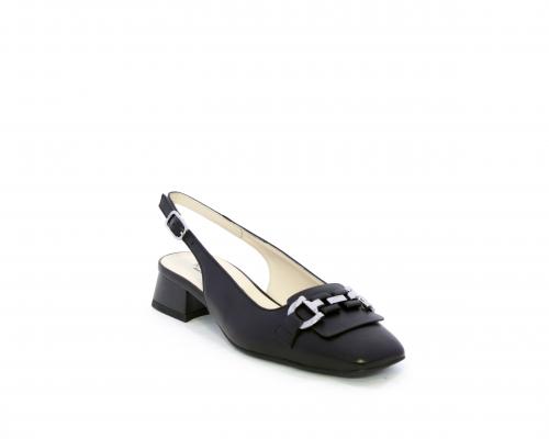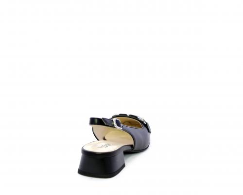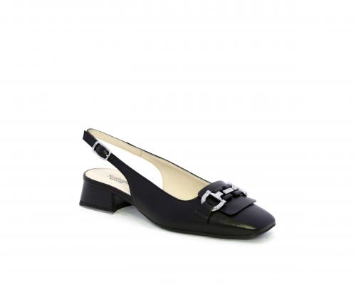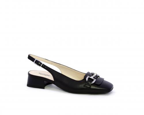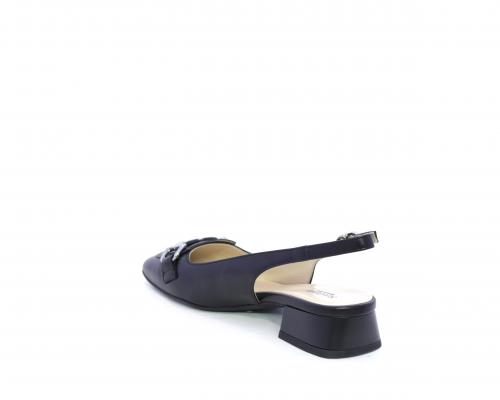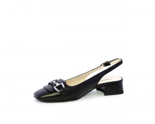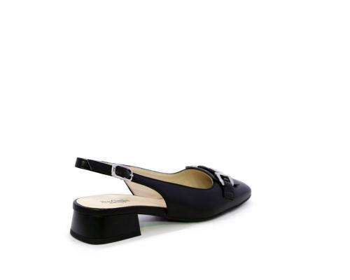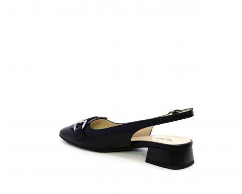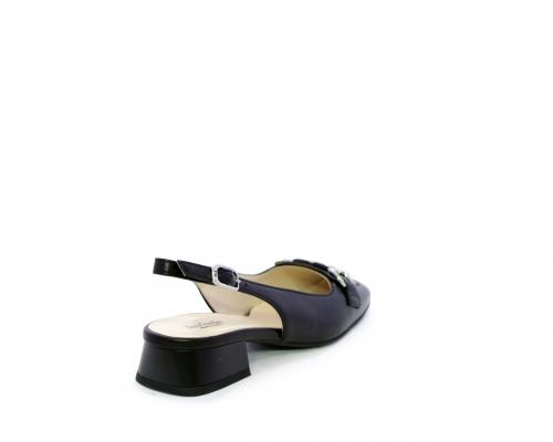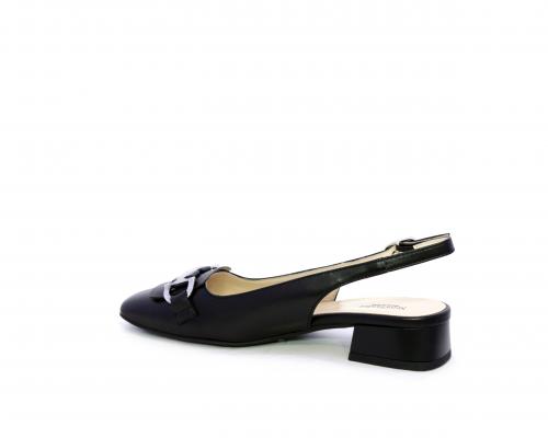 Slingback con fondo in gomma, tomaia in pelle con fibbia in acciaio sulla pianta, cinturino in pelle regolabile dietro la caviglia, sottopiede e fodera interna in pelle, fusbet anatomico.