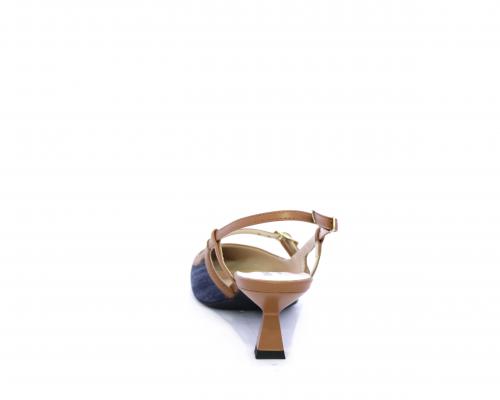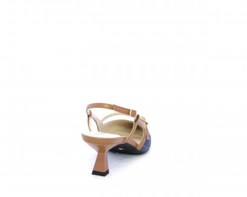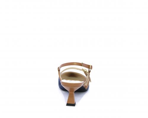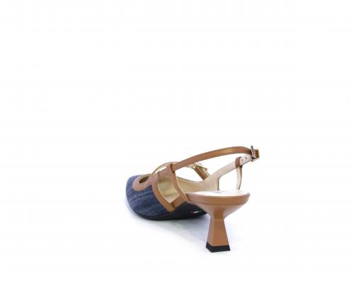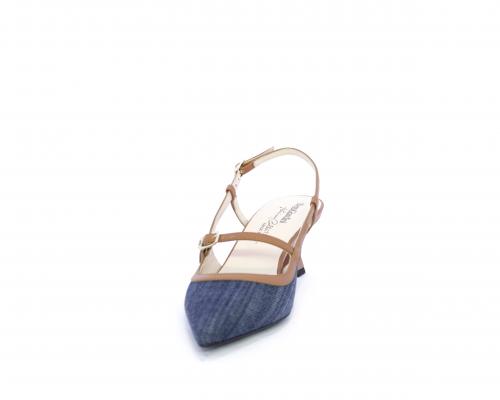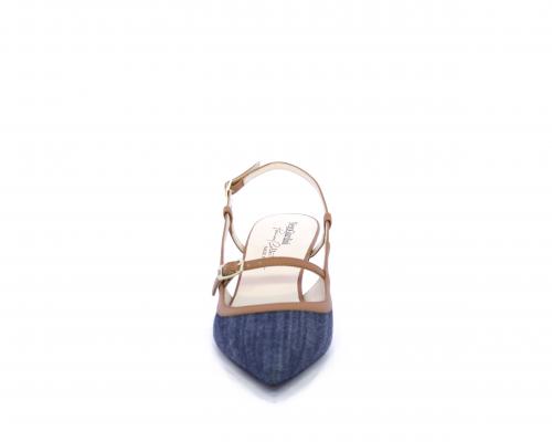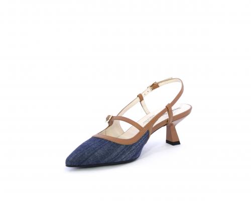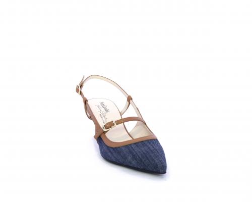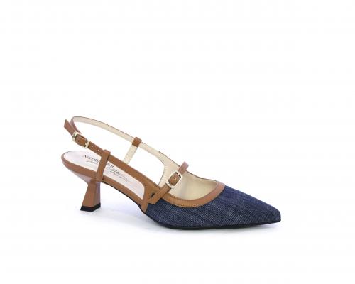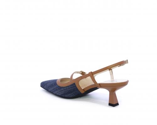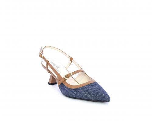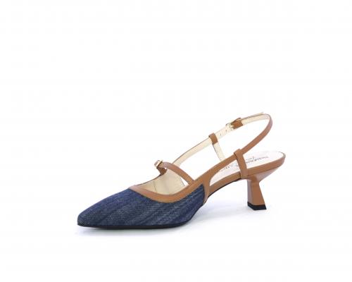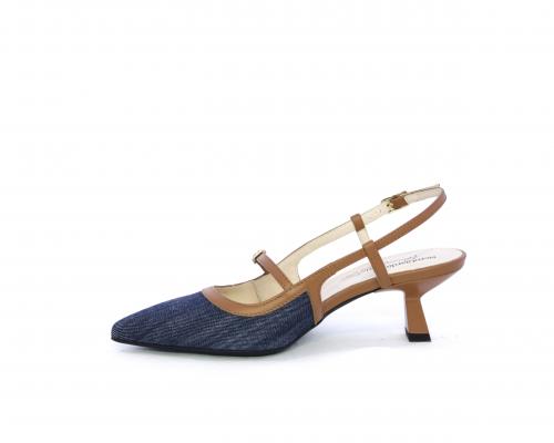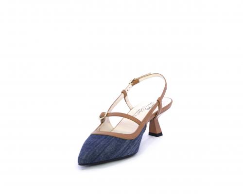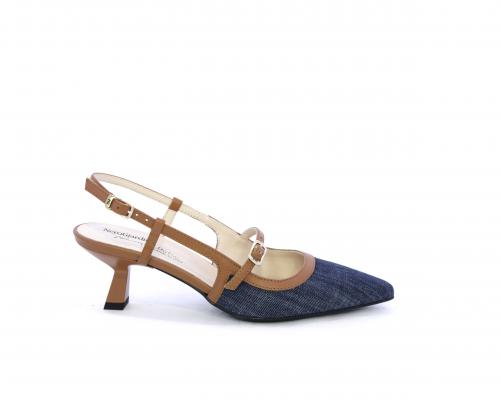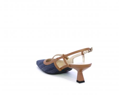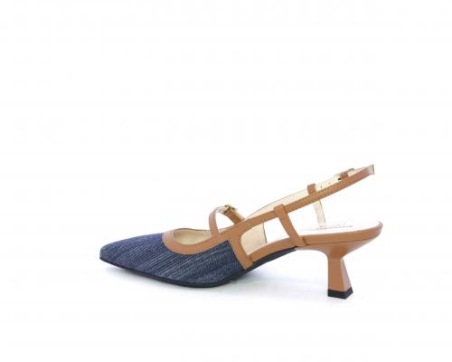 Slingback con fondo in gomma, tomaia in tessuto con rifiniture in pelle, cinturino in pelle con fibbia regolabile, sottopiede e fodera interna in pelle, fusbet anatomico.