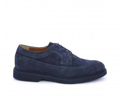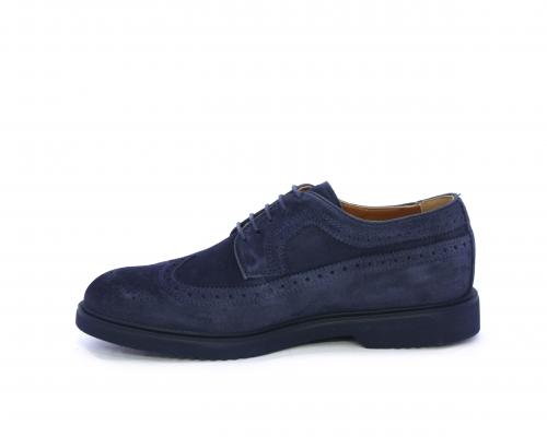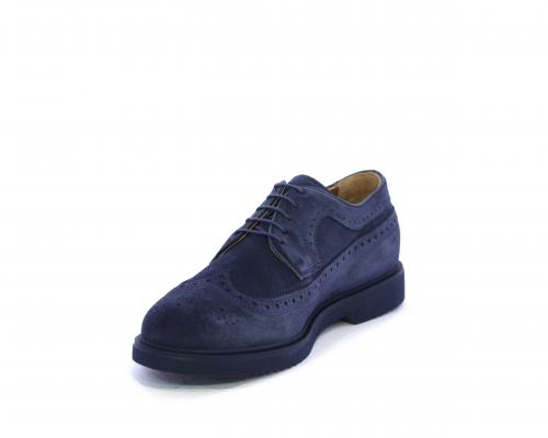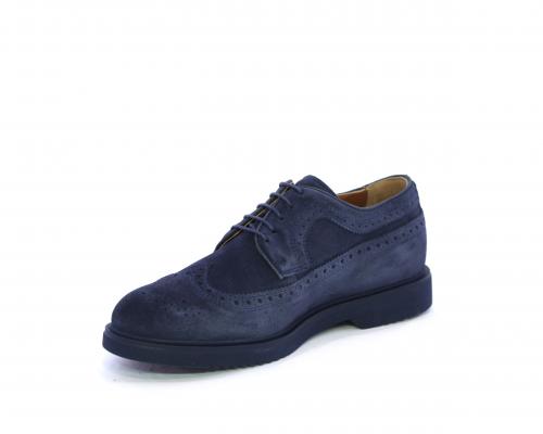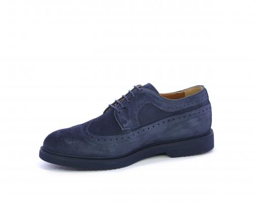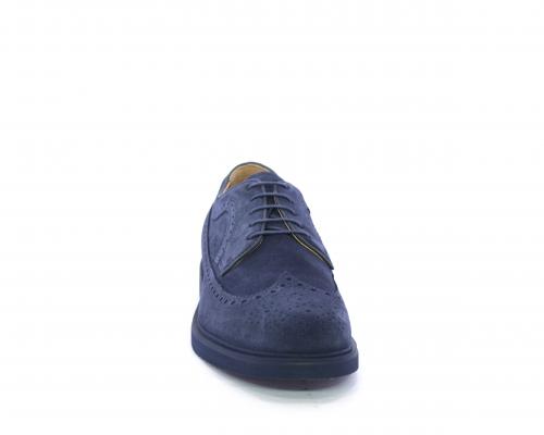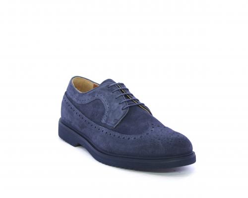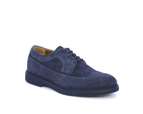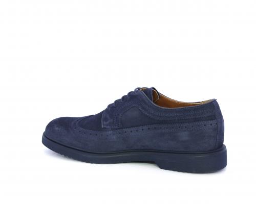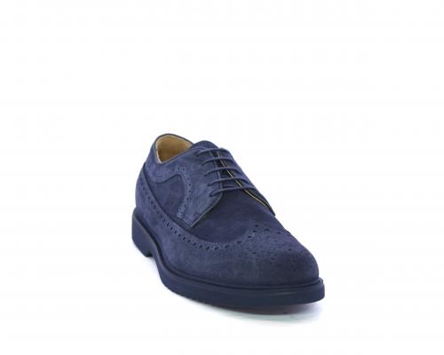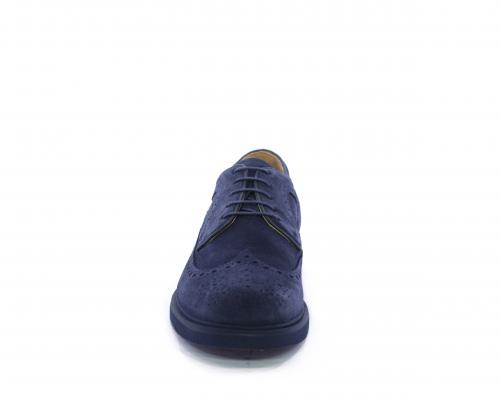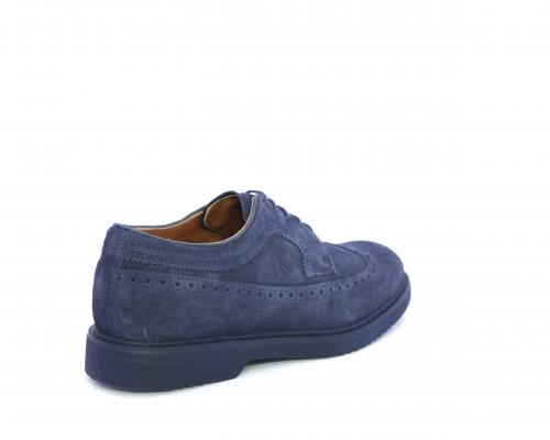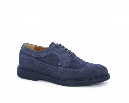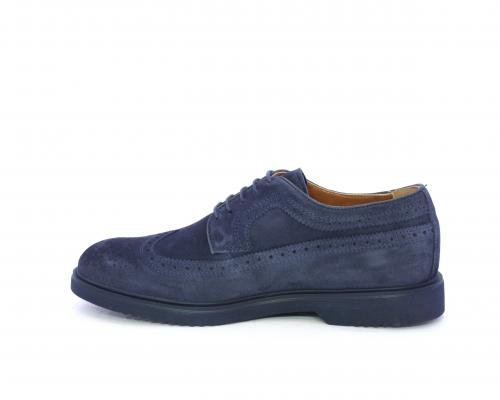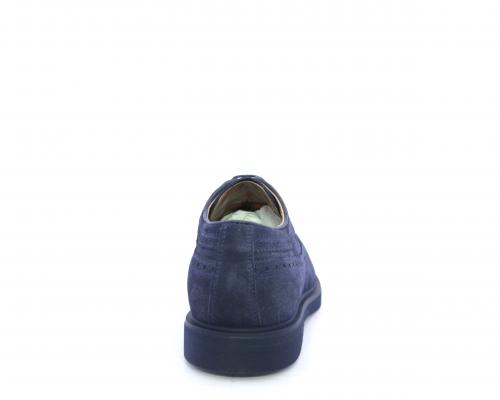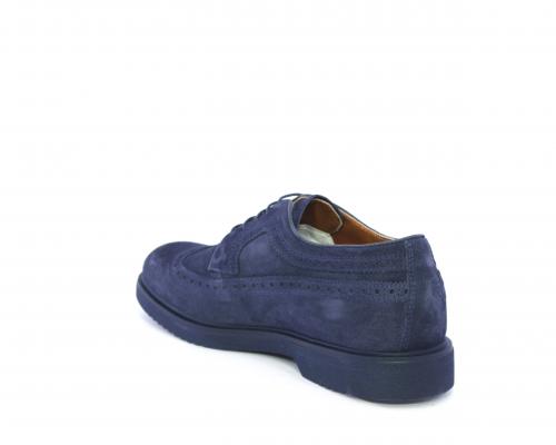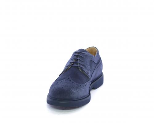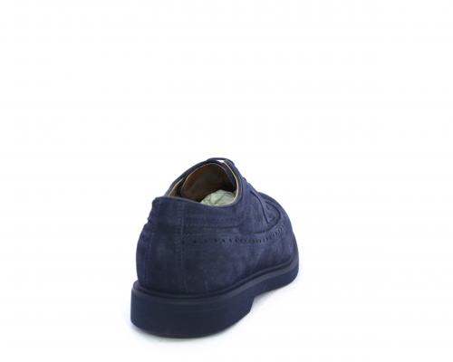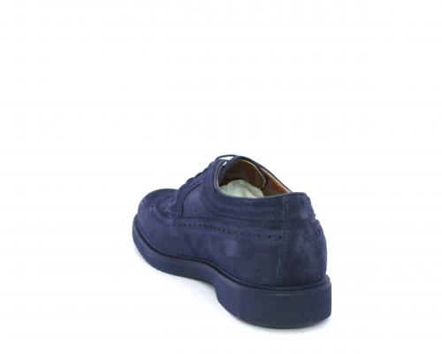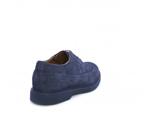 Scarpa con lacci, fondo con gomma in micro blu, tomaia in suede con lavorazione all'inglese, sottopiede e fodera interna in pelle, fusbet con memory.