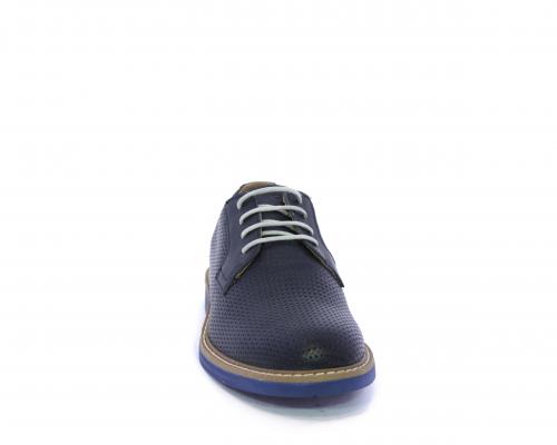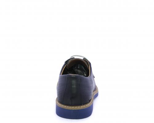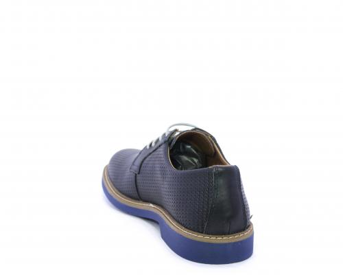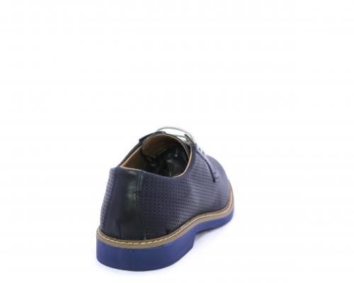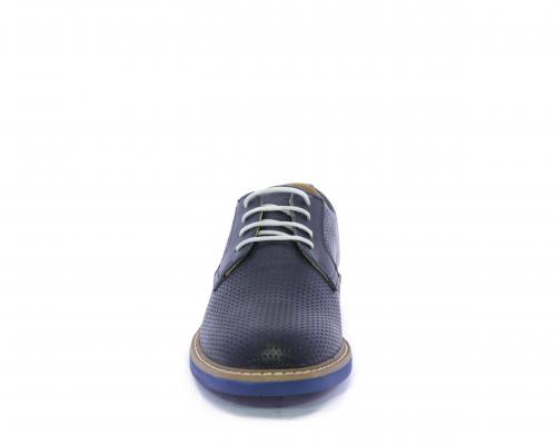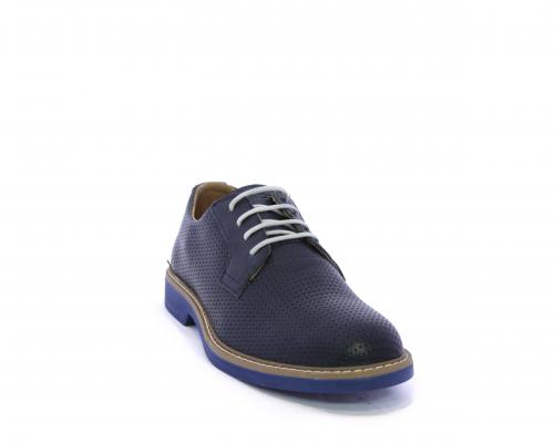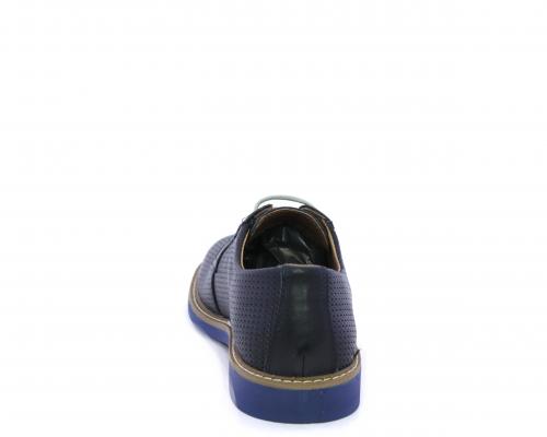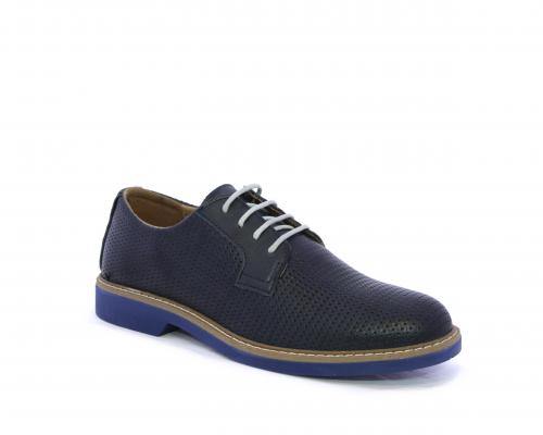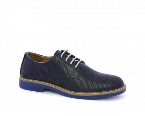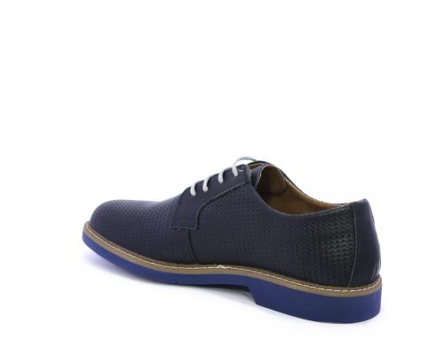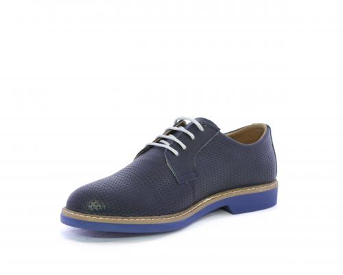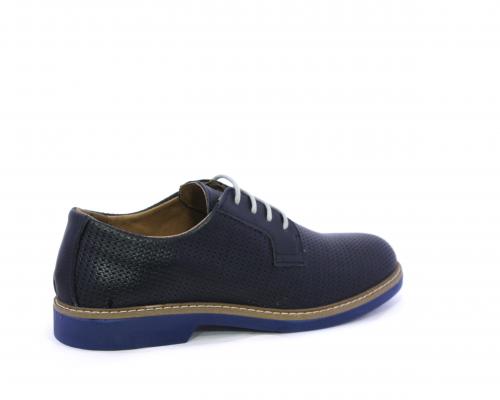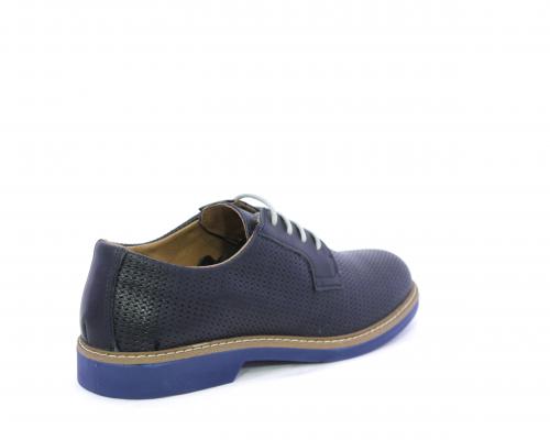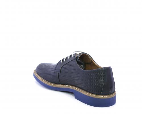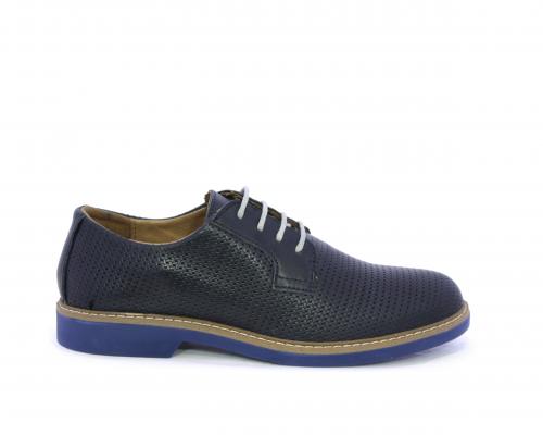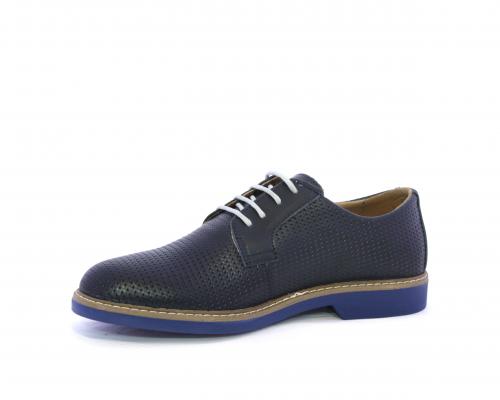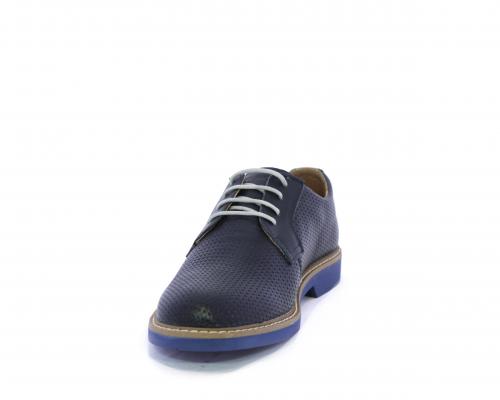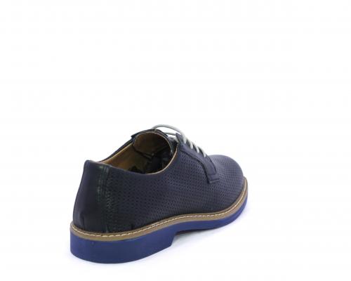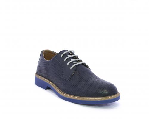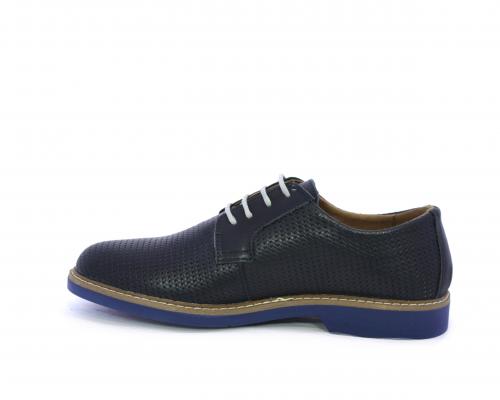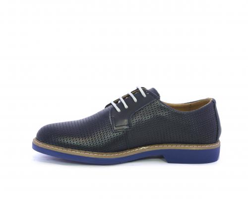 Scarpa con i lacci, fondo in gomma azzurra, tomaia in pelle con lavorazione intrecciata, sottopiede e fodera interna in pelle, fusbet estraibile.