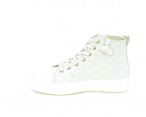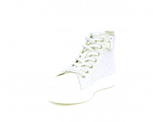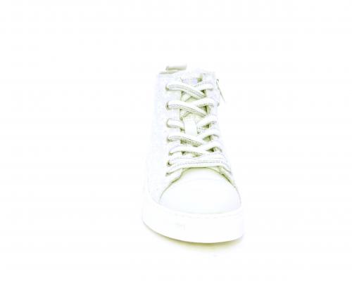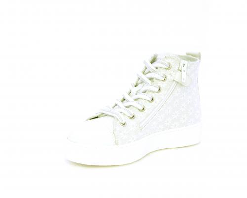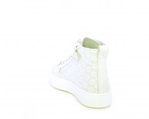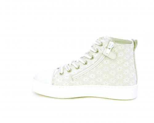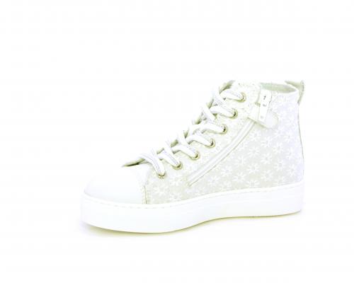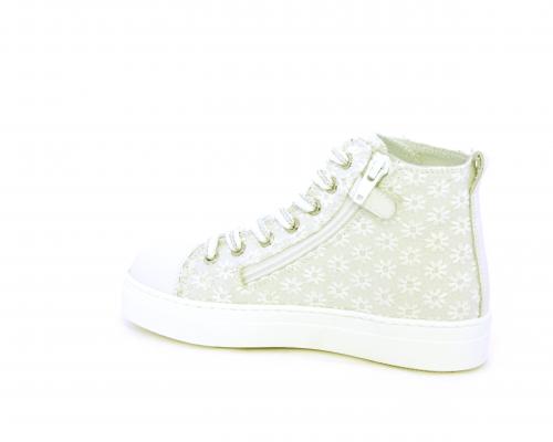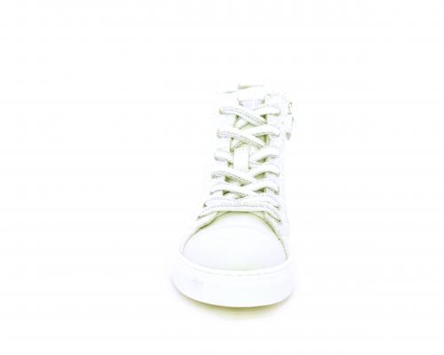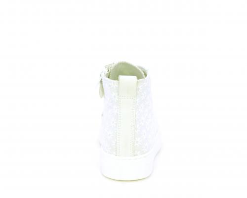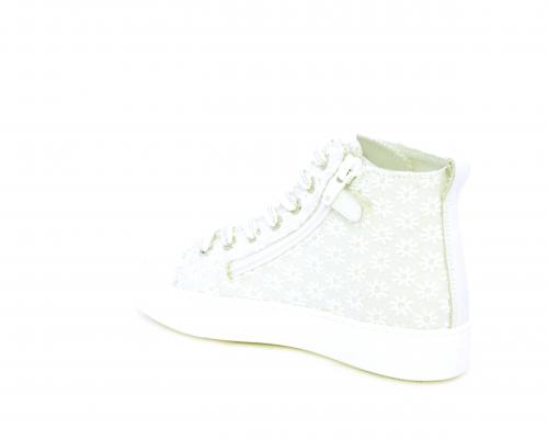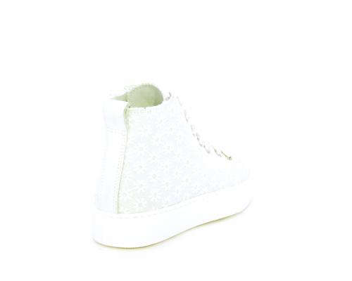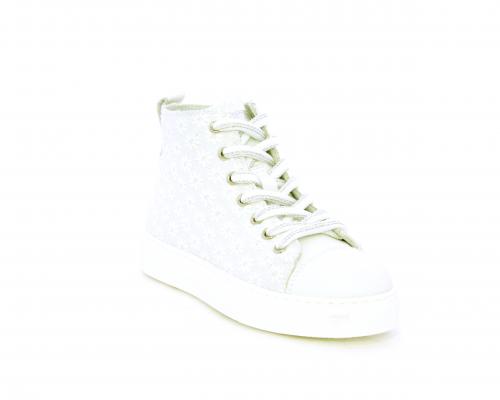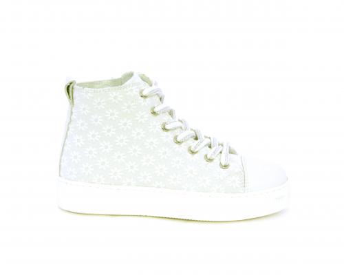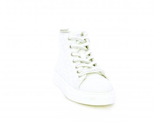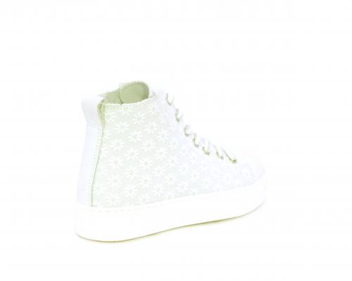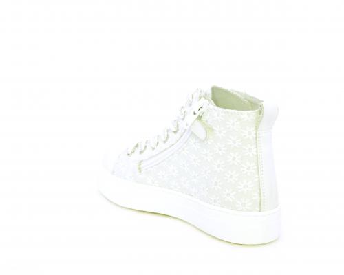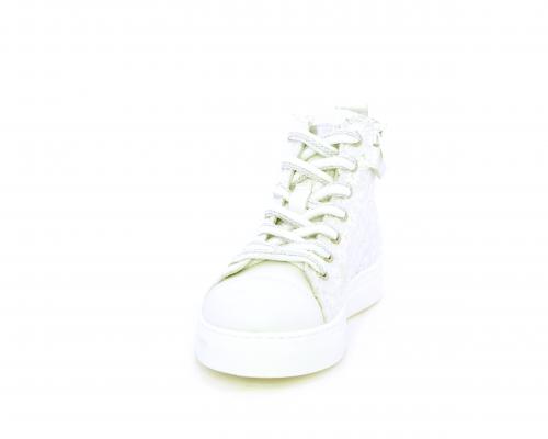 Sneakers con lacci e chiusura laterale, tomaia in tessuto lavorato e punta in pelle bianca, sottopiede e fodera interna in pelle, fusbet estraibile.