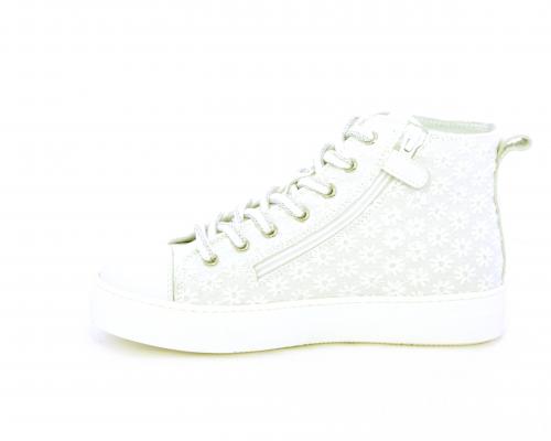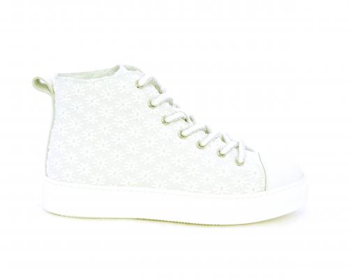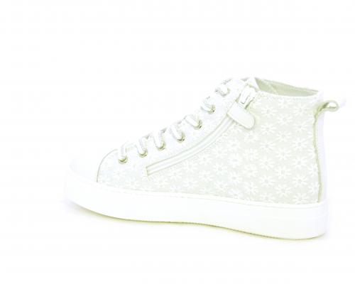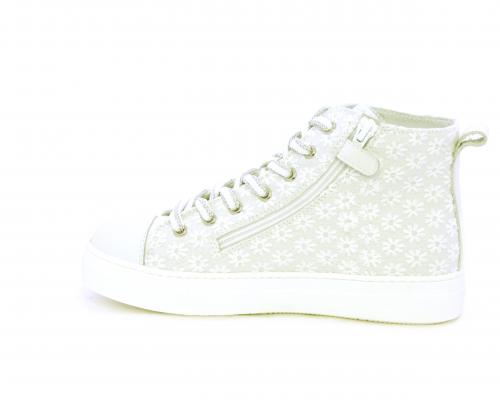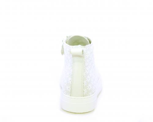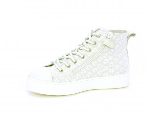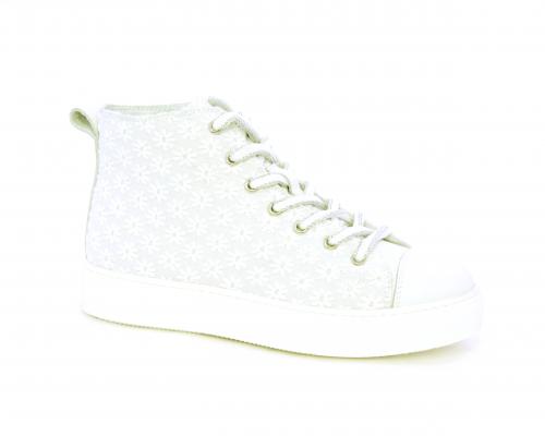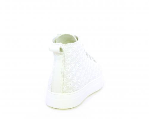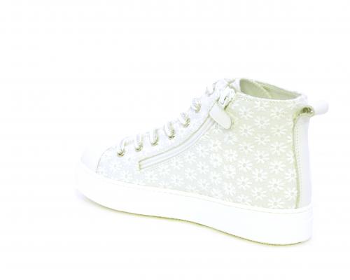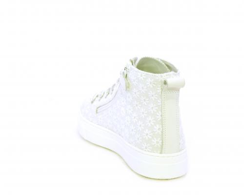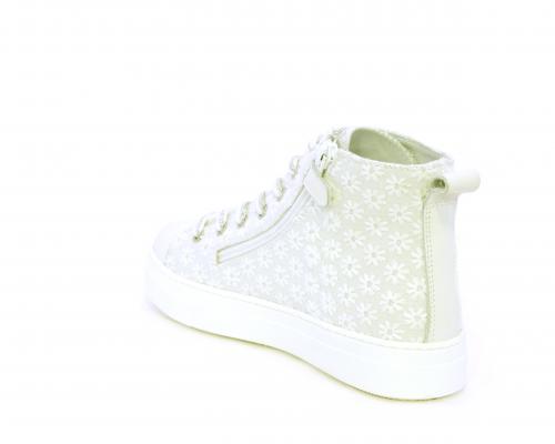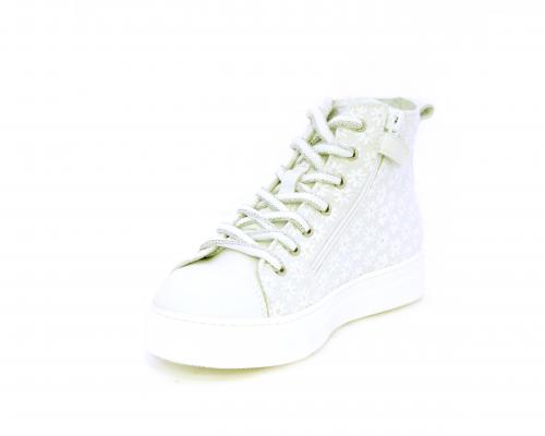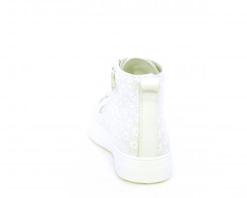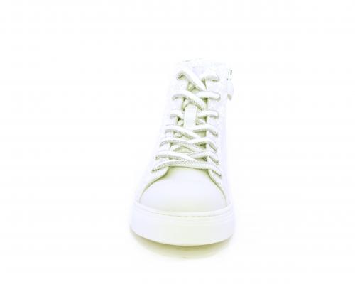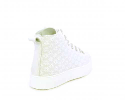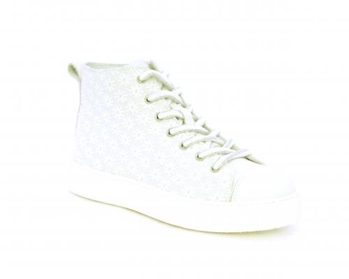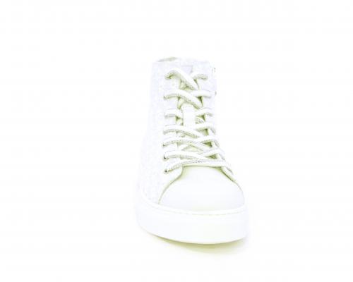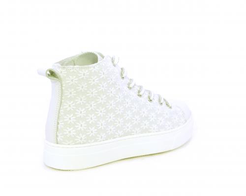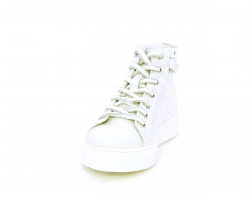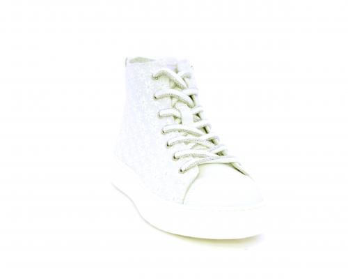 Sneakers con lacci e chiusura laterale, tomaia in tessuto lavorato e punta in pelle bianca, sottopiede e fodera interna in pelle, fusbet estraibile.