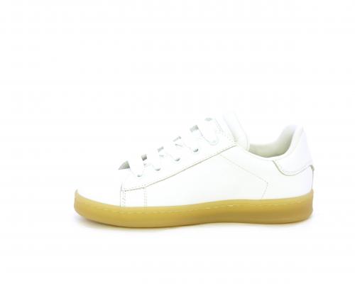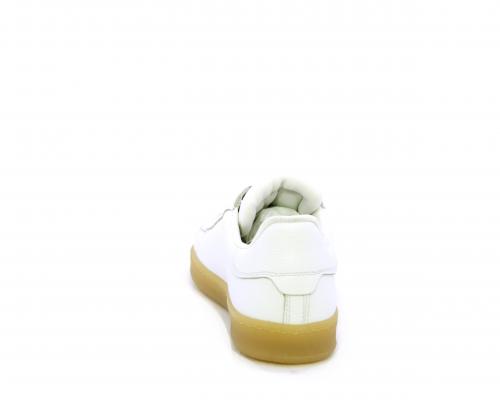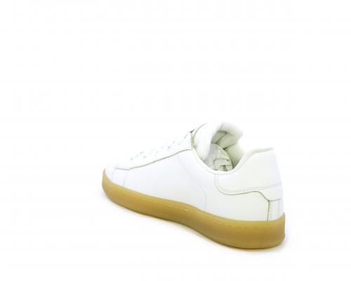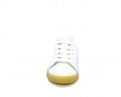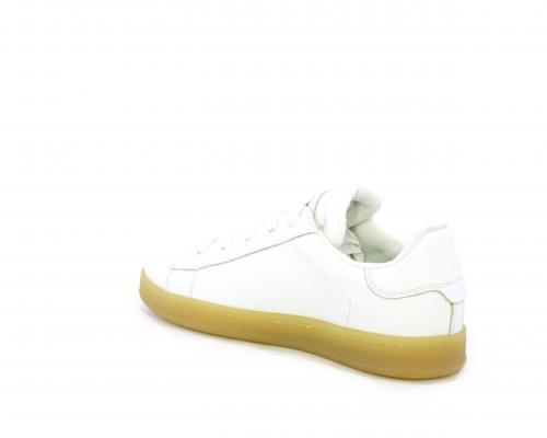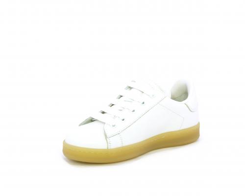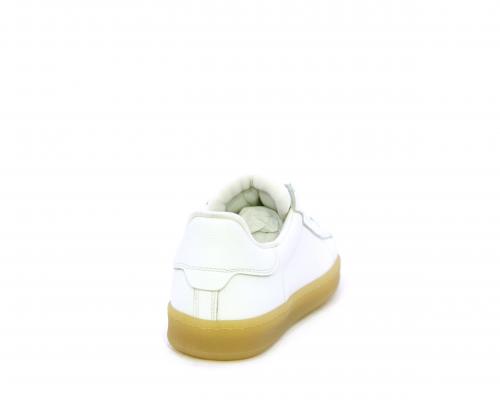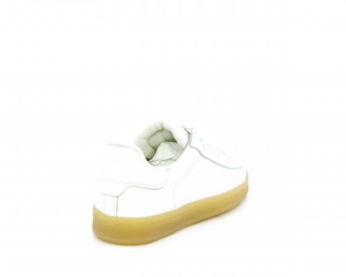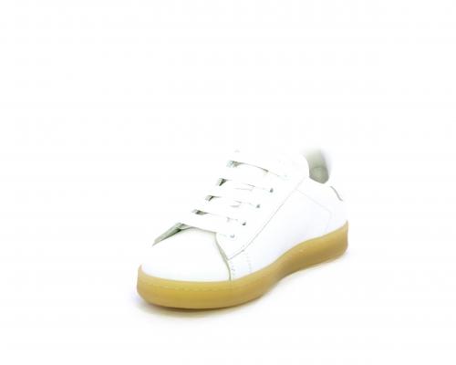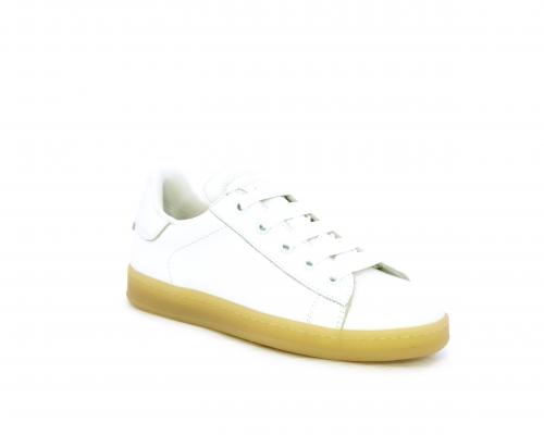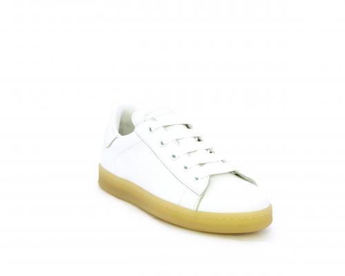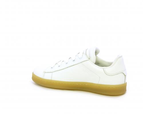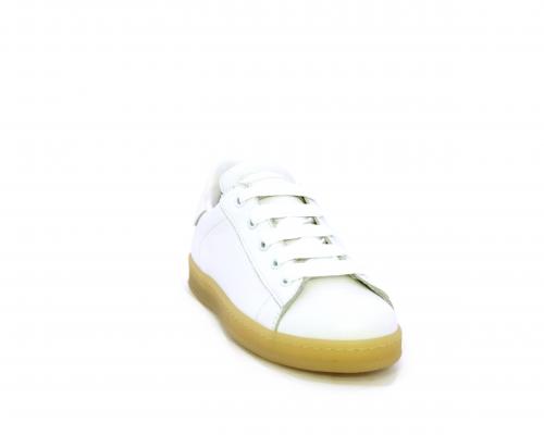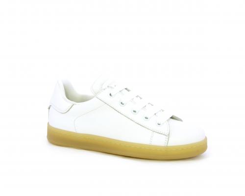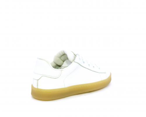 Sneakers con lacci, fondo in gomma beige, tomaia in pelle martellata, cuscinetto intorno alla caviglia, sottopiede e fodera interna in pelle, fusbet estraibile.