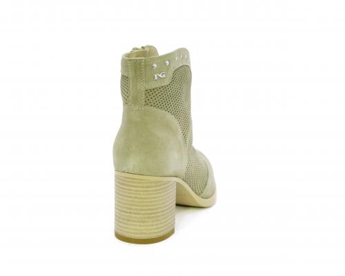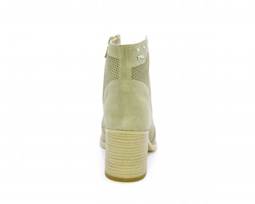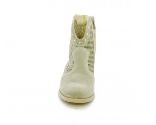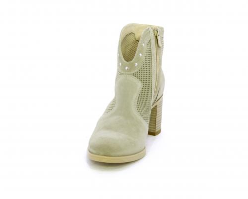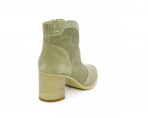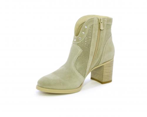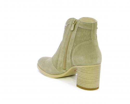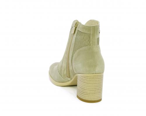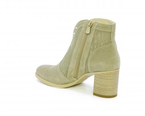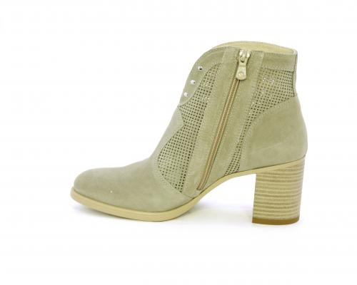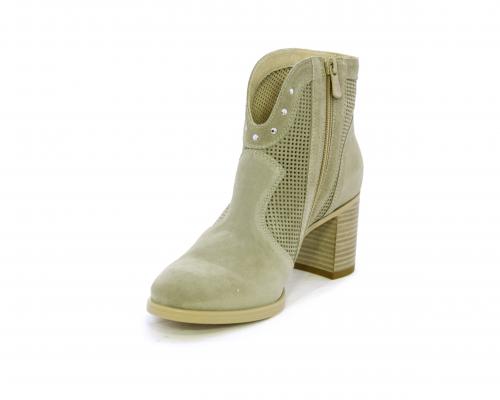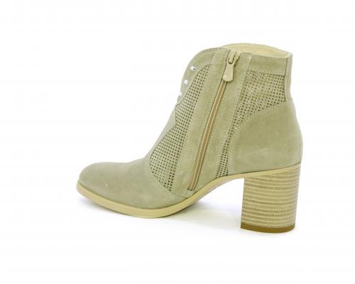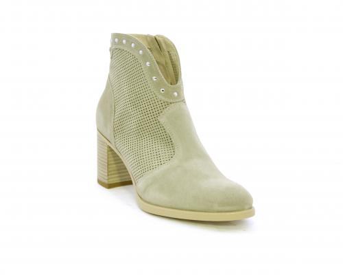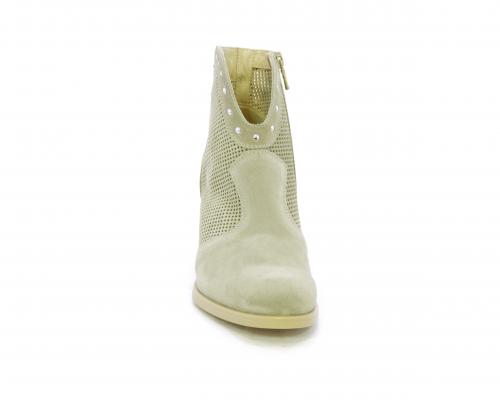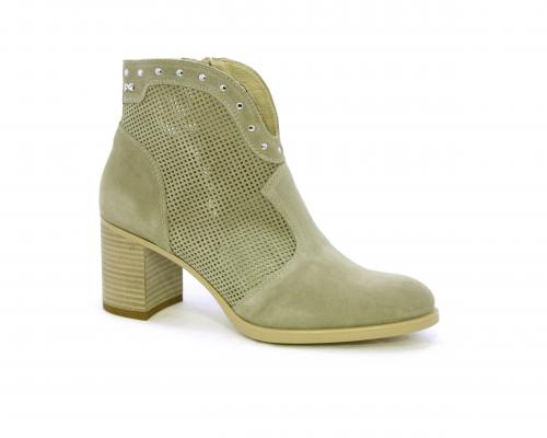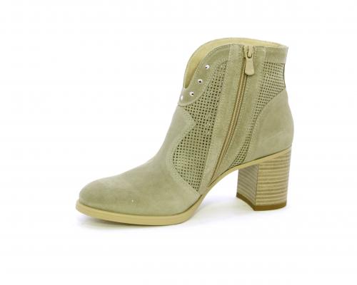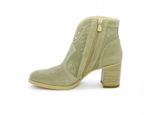 Tronchetto con fondo in gomma, tomaia in suede con parti forate e chiusura laterale, rifiniture in acciaio, sottopiede e fodera interna in pelle, fusbet con memory.