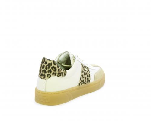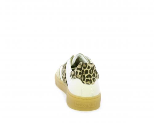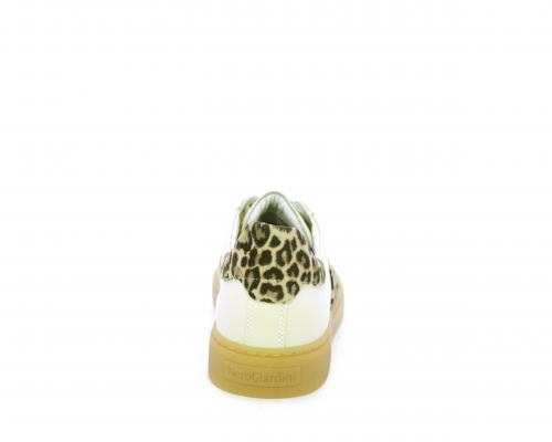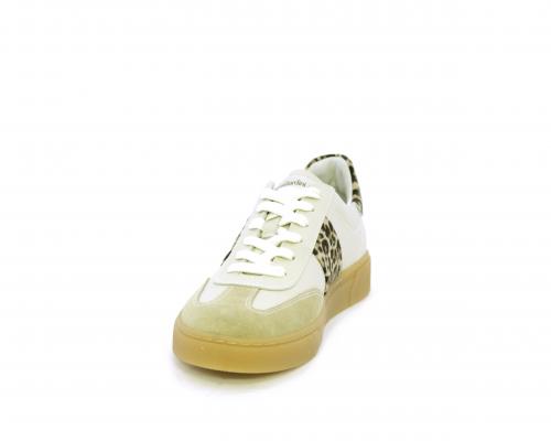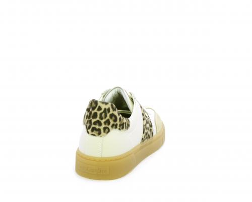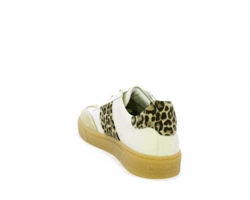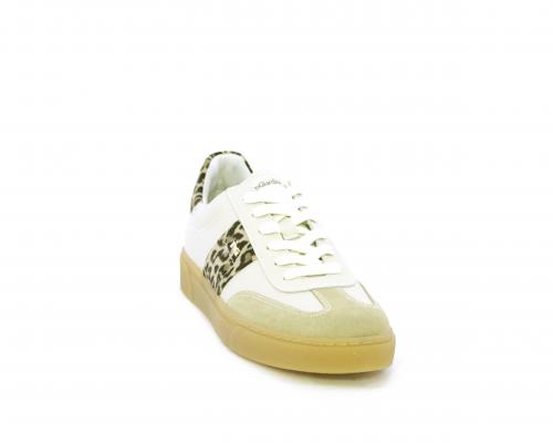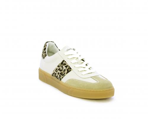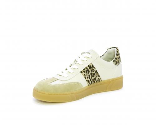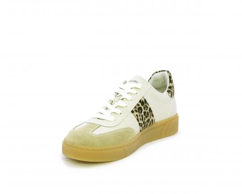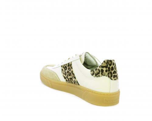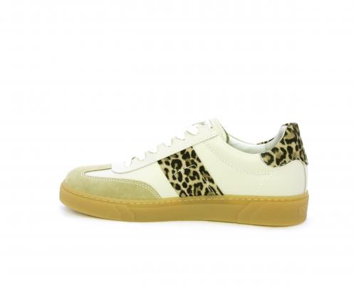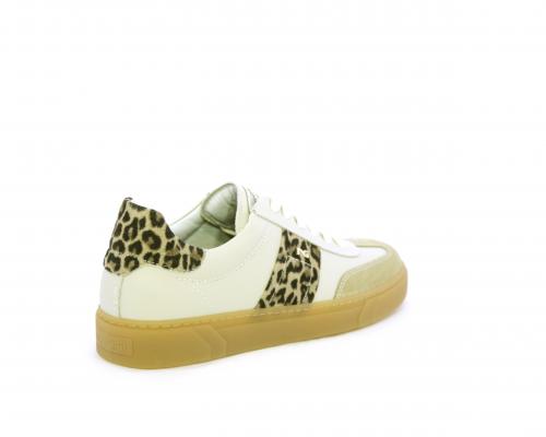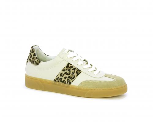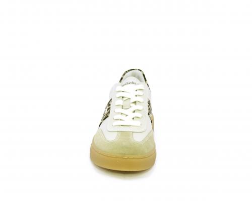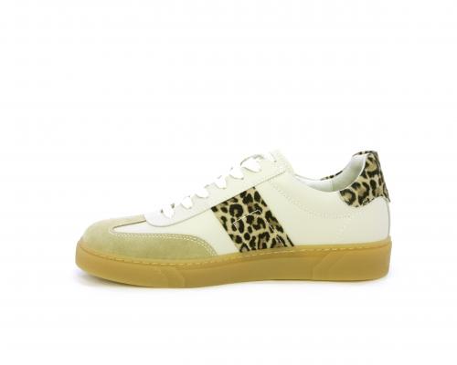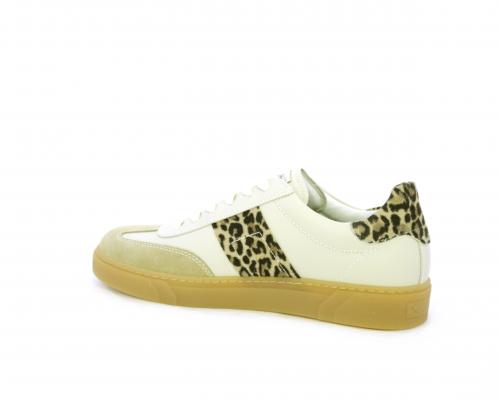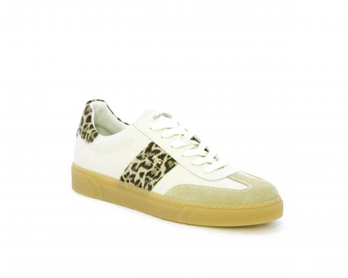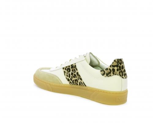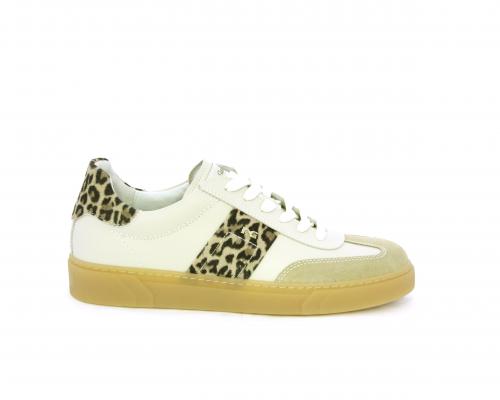 Sneakers con lacci, fondo in gomma beige, tomaia in pelle con inserti in suede e bande maculate sia lateralmente e sia dietro al tallone, sottopiede e fodera interna in pelle, fusbet estraibile con sistema DryGo, che svolge una doppia azione assorbe l'umidità quando si indossa la scarpe e si asciuga rapidamente quando si toglie la calzatura.