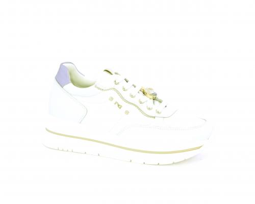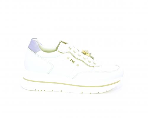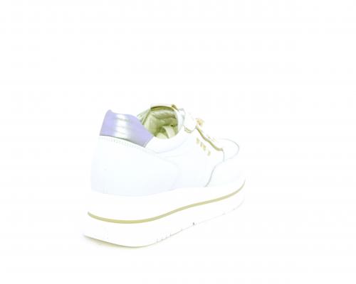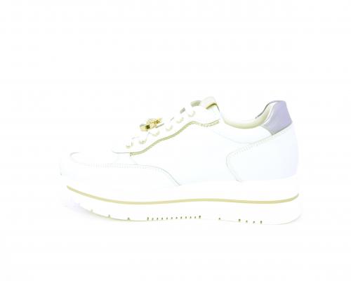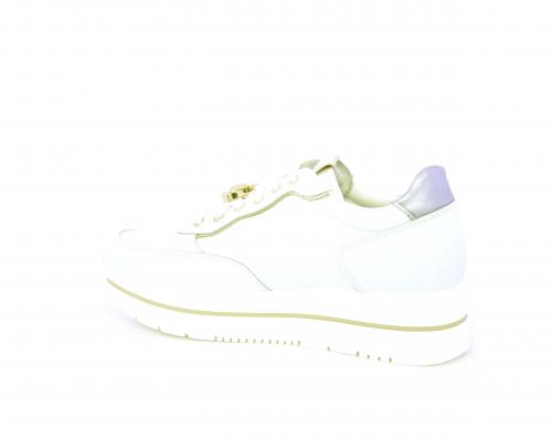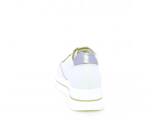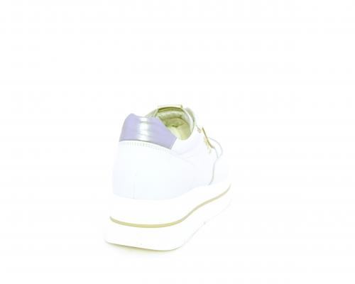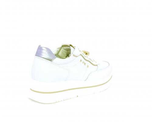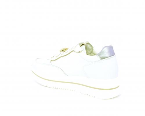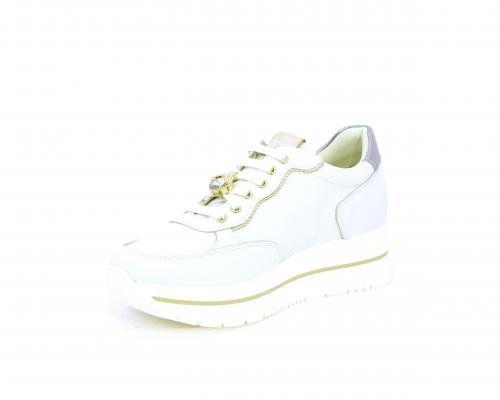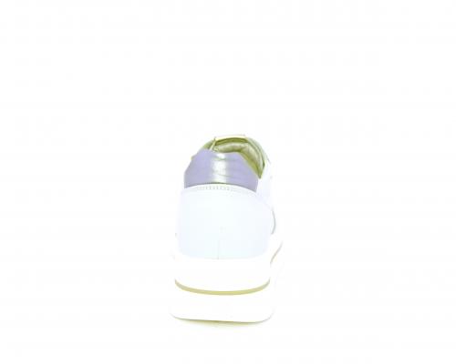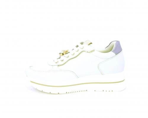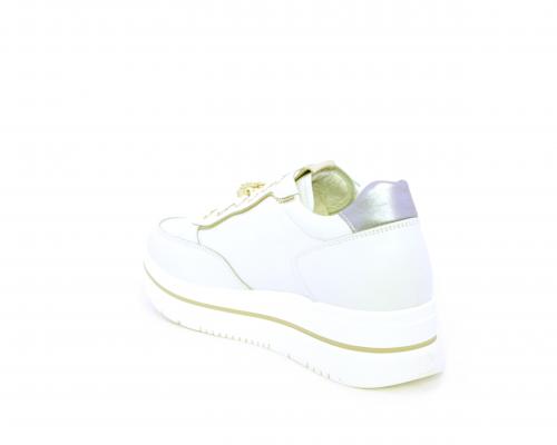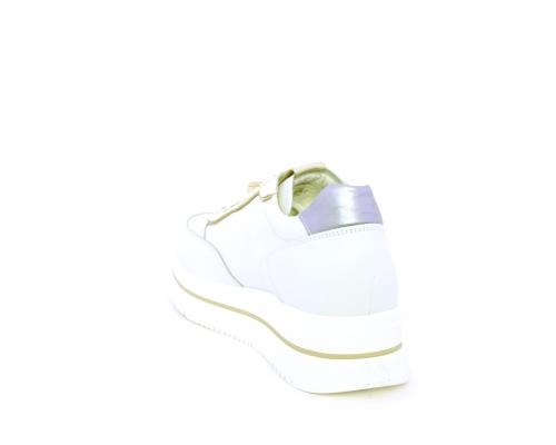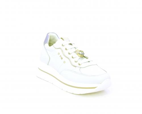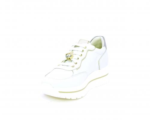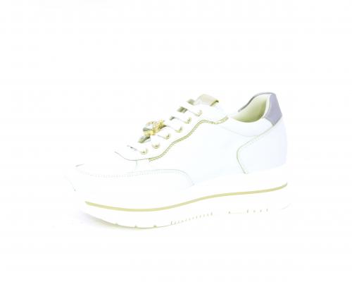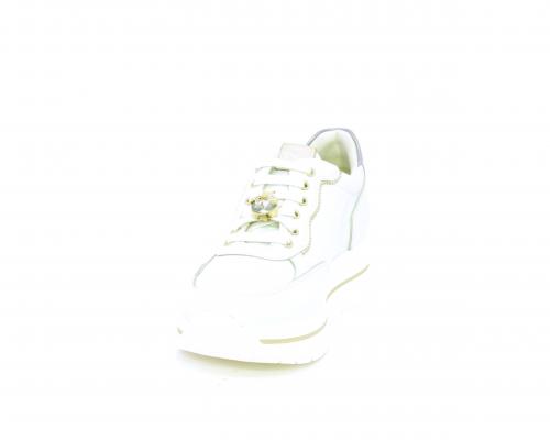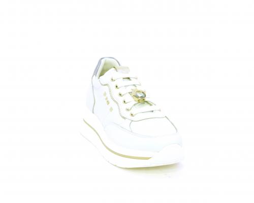 Sneakers con lacci, zeppa e plateaux in gomma bianco, tomaia in pelle e sui lacci accessori con brillanti removibili, sottopiede e fodera interna in pelle, fusbet estraibile con sistema DryGo, che svolge una doppia azione assorbe l'umidità quando si indossa la scarpe e si asciuga rapidamente quando si toglie la calzatura.