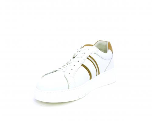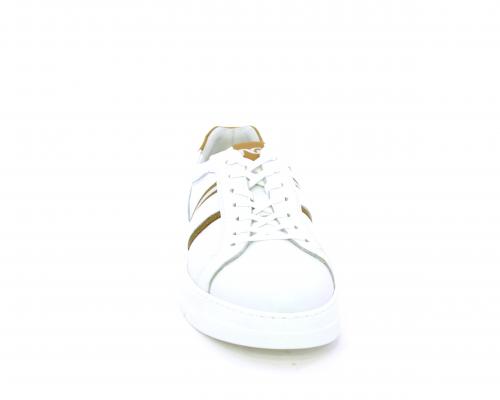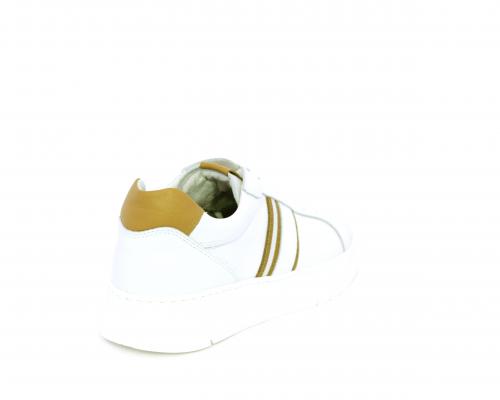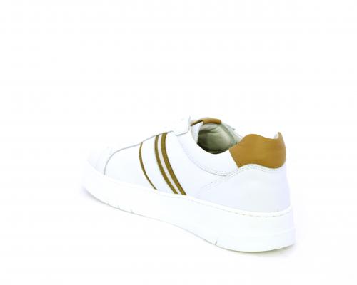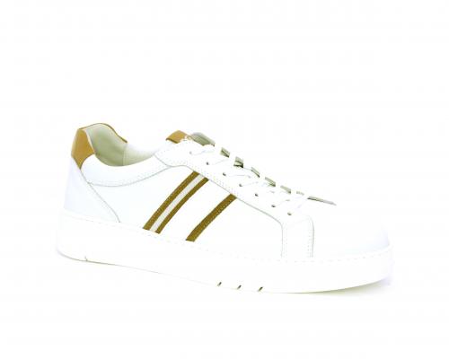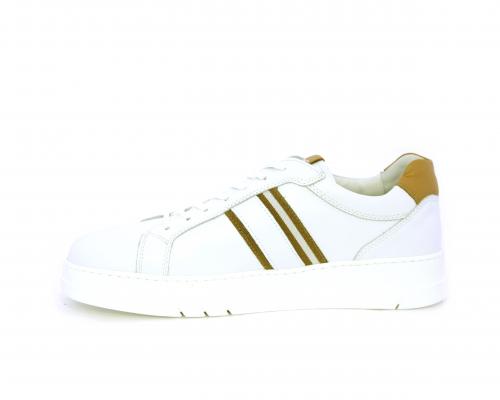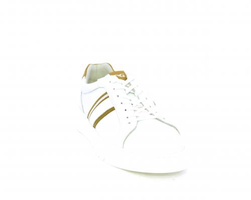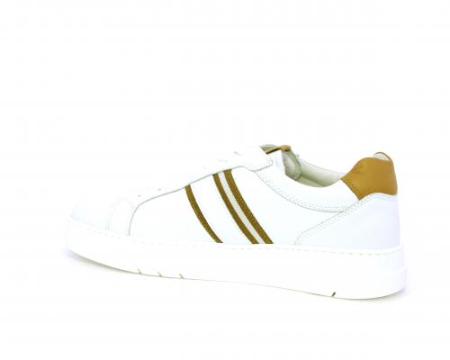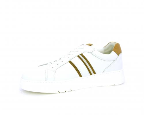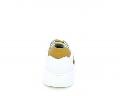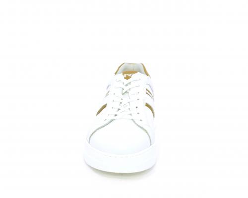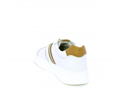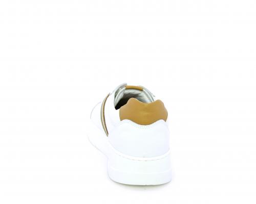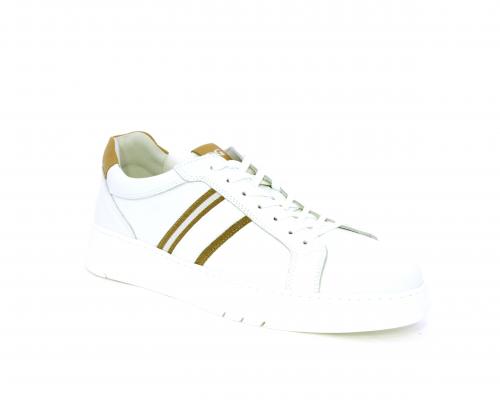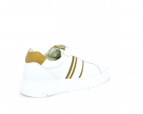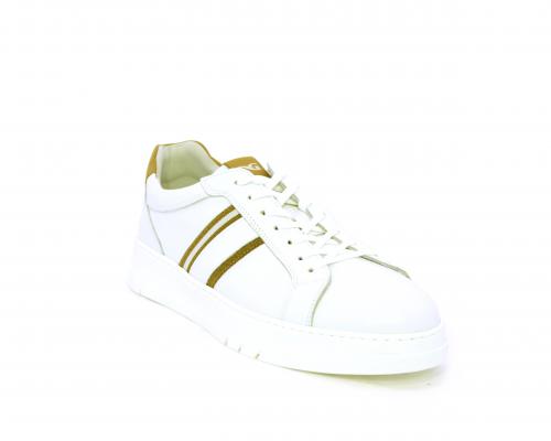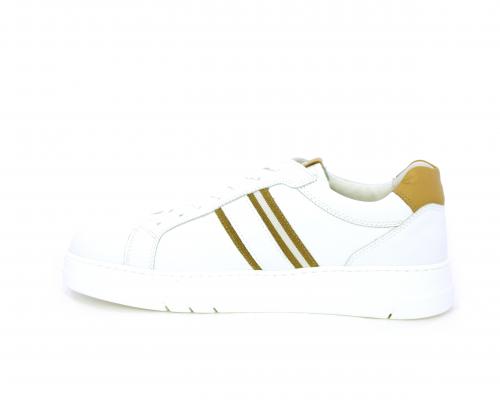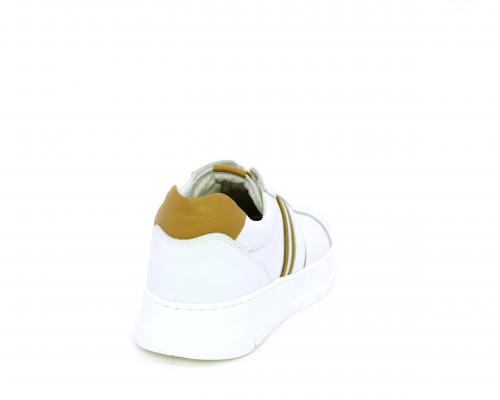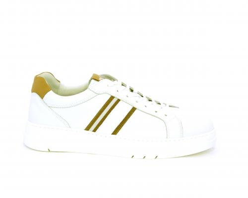 Sneakers con lacci, fondo in gomma bianca ultraflessibile, tomaia in pelle con bande laterali in pelle e tessuto, sottopiede e fodera interna in pelle, fusbet estraibile con sistema DryGo, che svolge una doppia azione assorbel'umidità quando si indossa la scarpa e si asciuga rapidamente quando si la calzatura viene tolta.