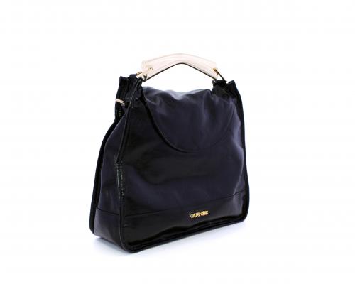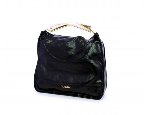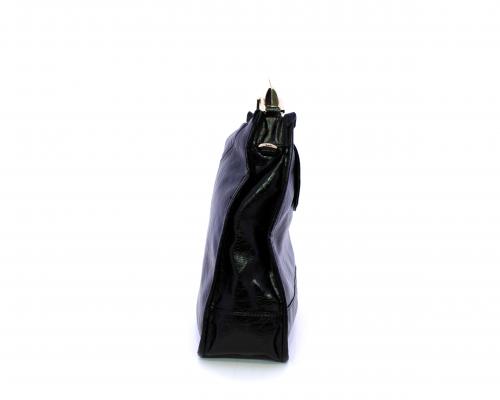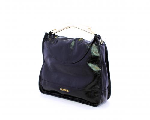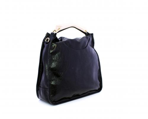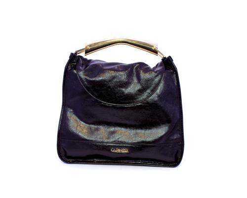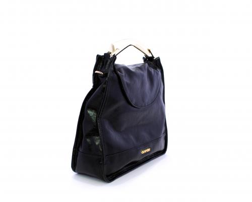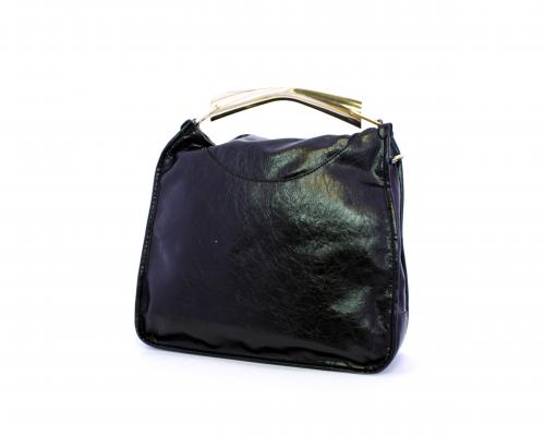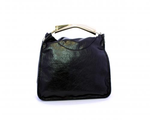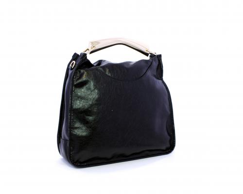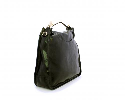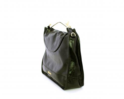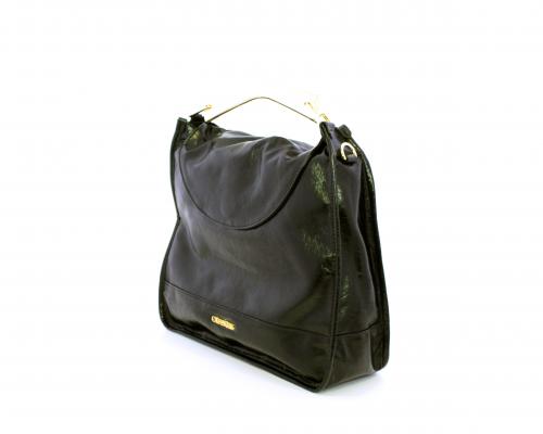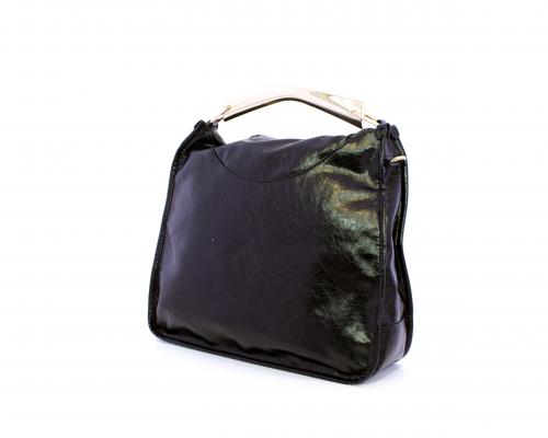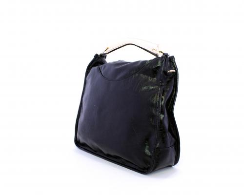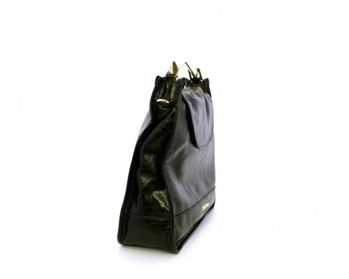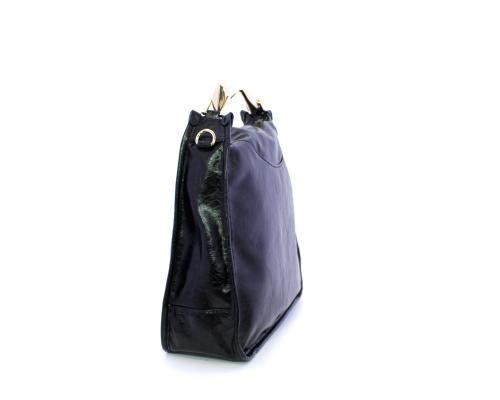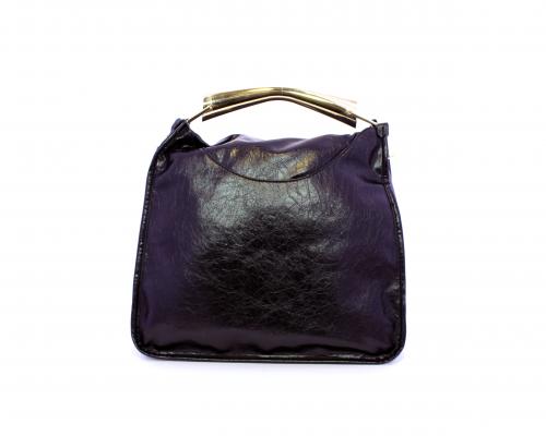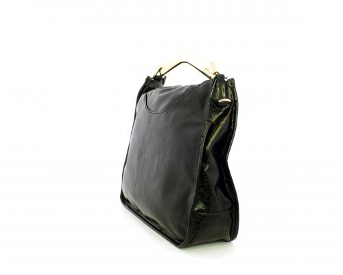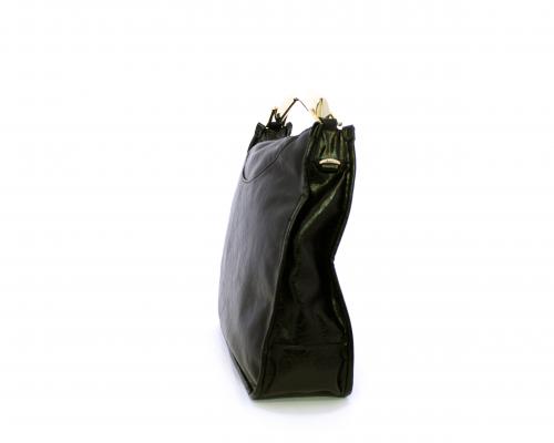 Borsa di forma rettangolare in pelle martellata, manico in acciaio color oro e possibilità di aggiungere la tracolla regolabile in pelle martellata, chiusura della borsa con clip magnetica, fodera interna in tessuto e all'interno doppio taschino uno aperto e uno chiuso con zip.