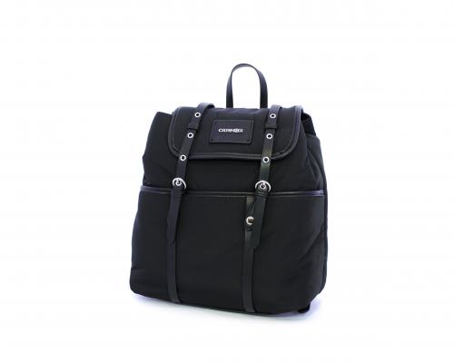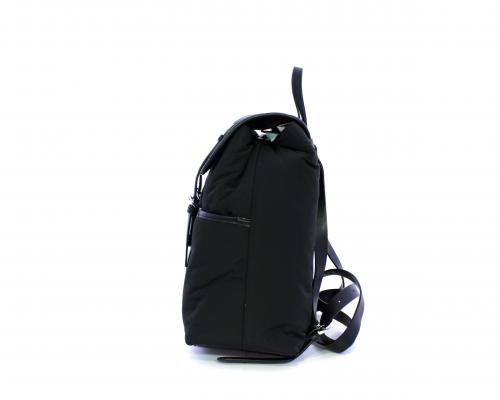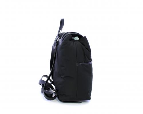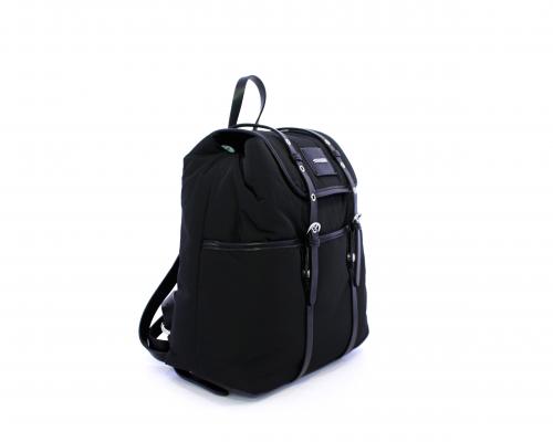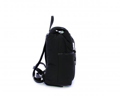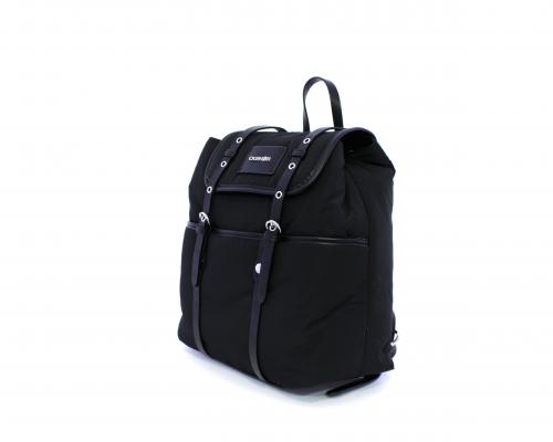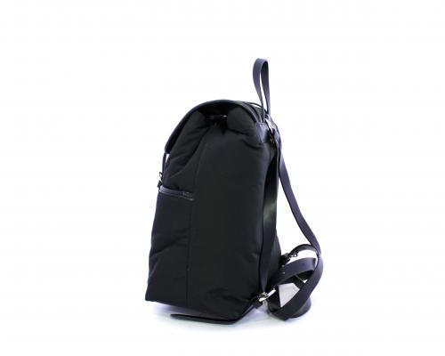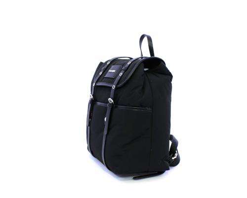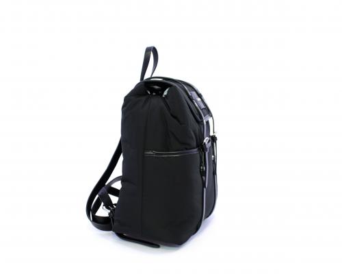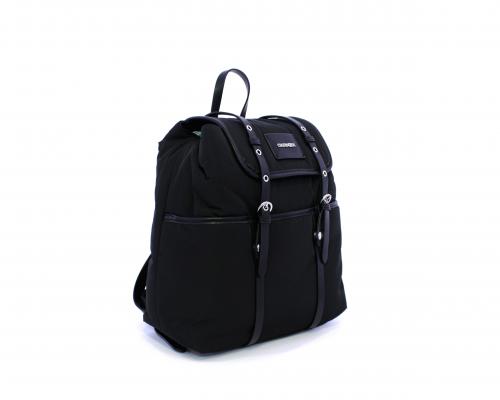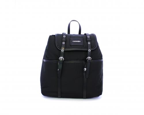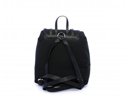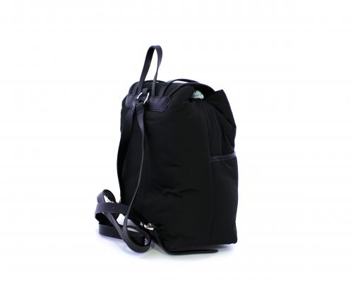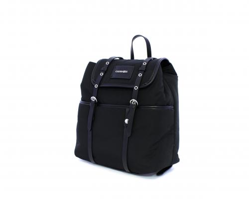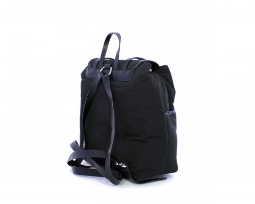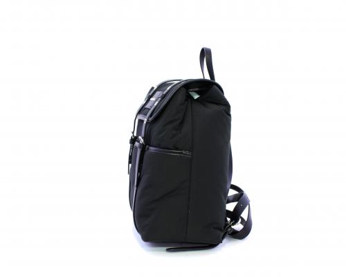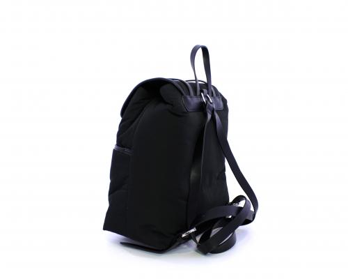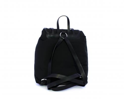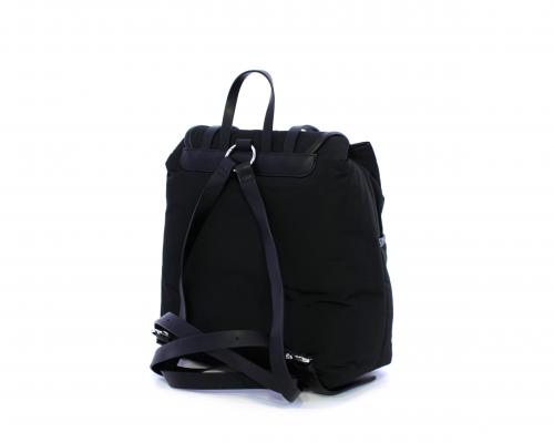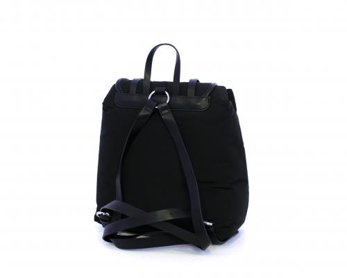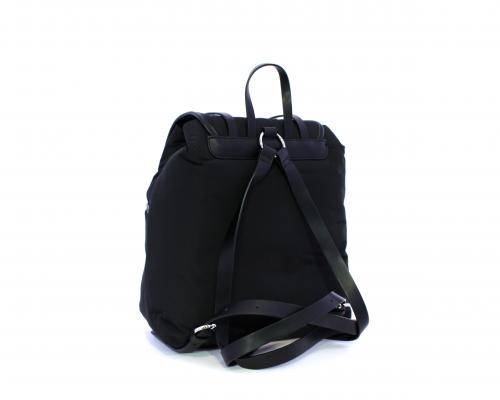 Zainetto in tessuto e tracolle regolabili in pelle, rifiniture in pelle e acciaio, taschino nella parte anteriore chiuso con clip, zaino con ribaltina chiusa con doppia clip in corrispondenza delle fibbie, fodera interna in tessuto e all'interno doppio taschino uno aperto e uno chiuso con zip.