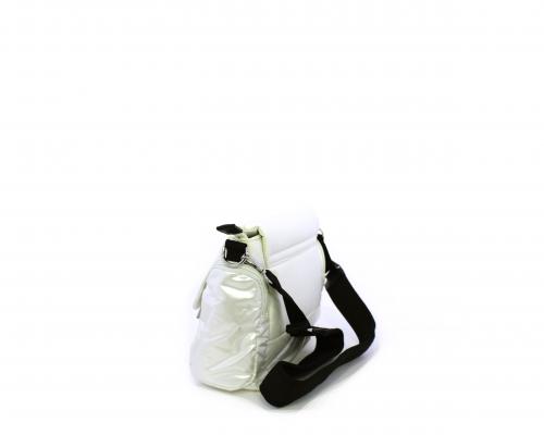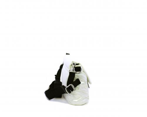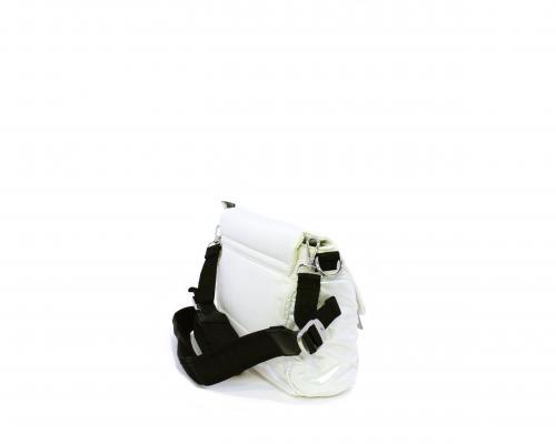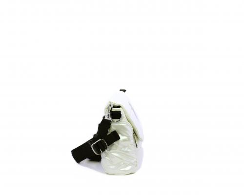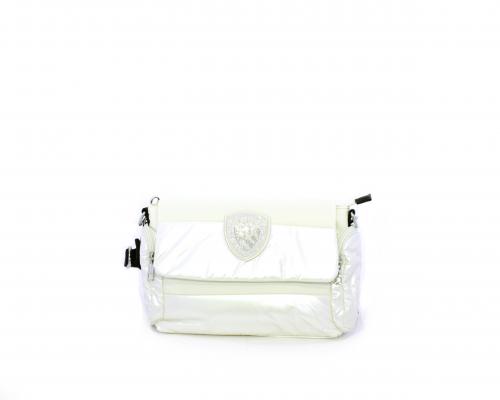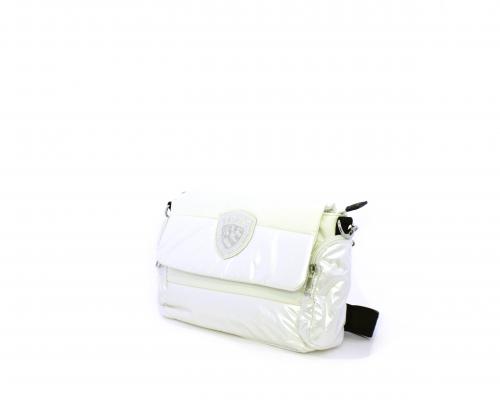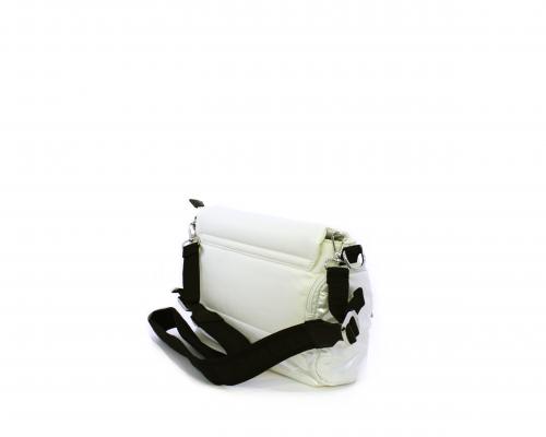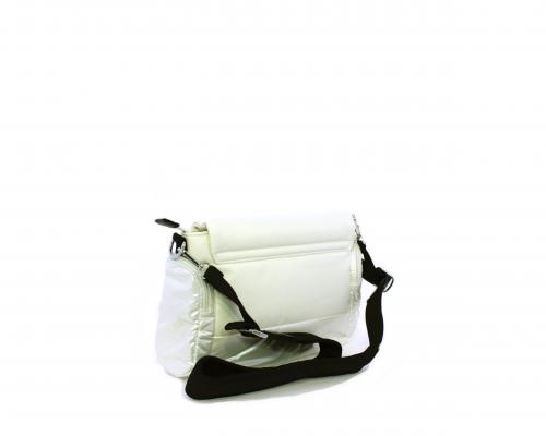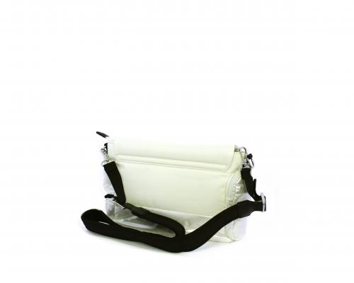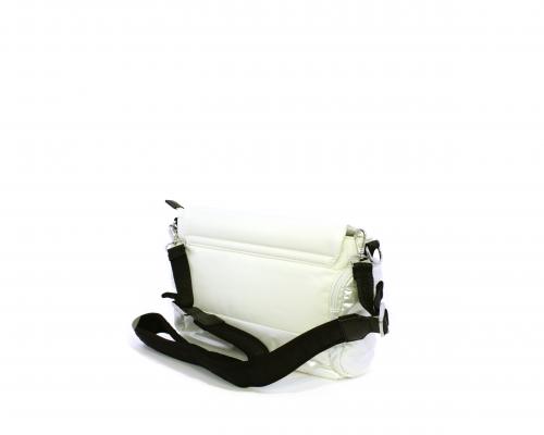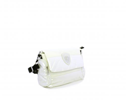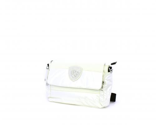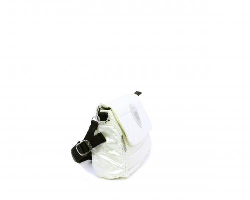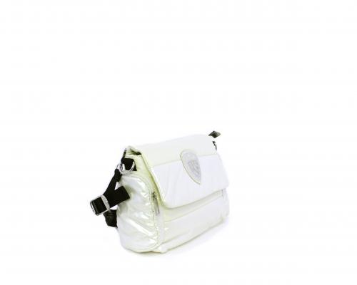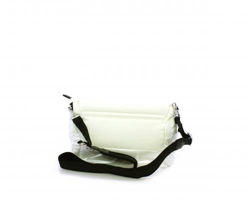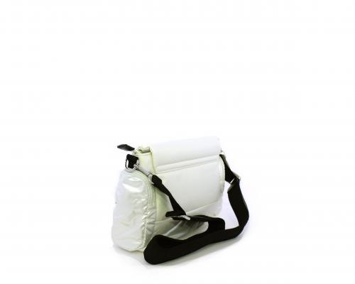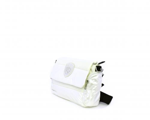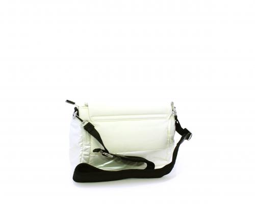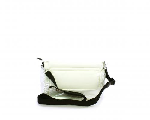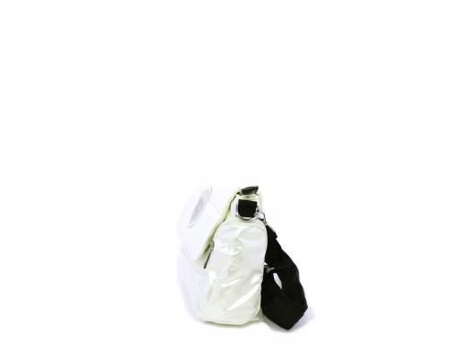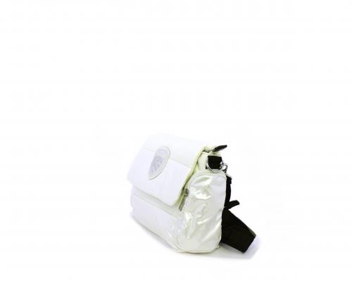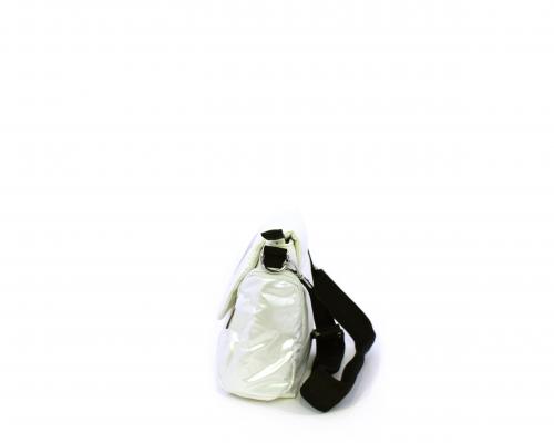 Borsa di forma rettangolare in tessuto tecnico, tracolla in tessuto con logo stampato regolabile, taschini laterali chiusi con zip, chiusura della borsa con doppia clip, fodera interna in tessuto e all'interno doppio taschino uno aperto e uno chiuso con zip.