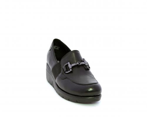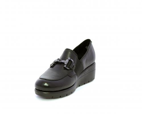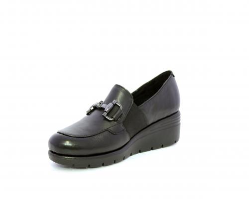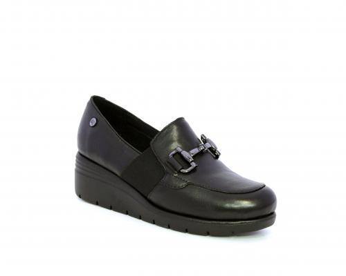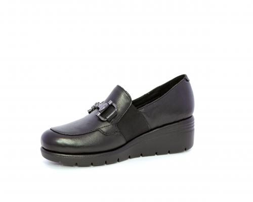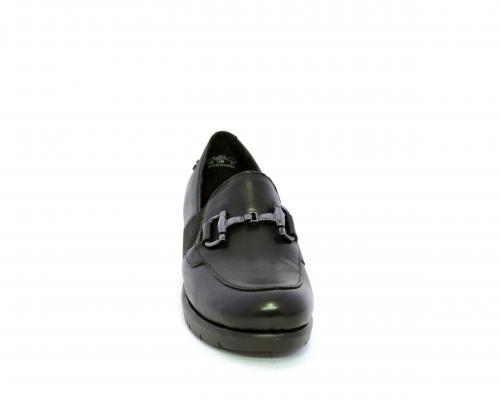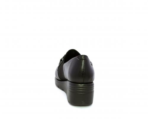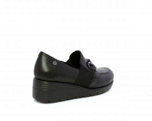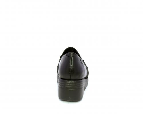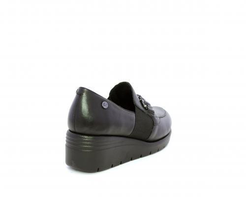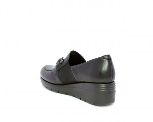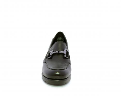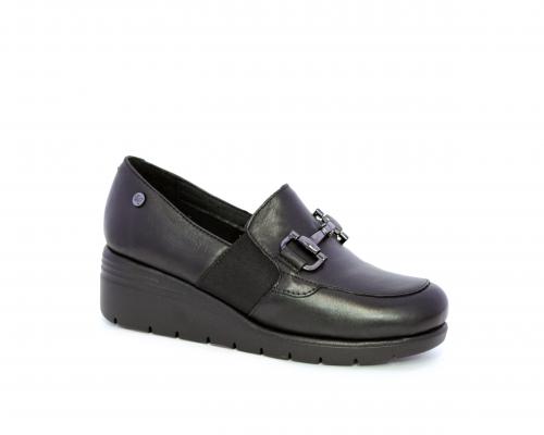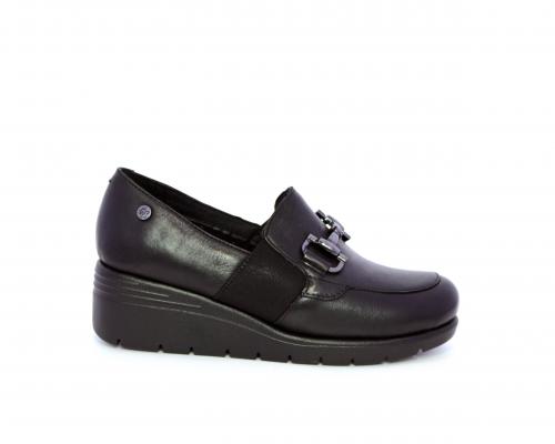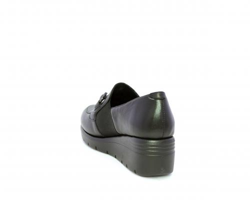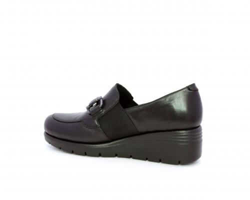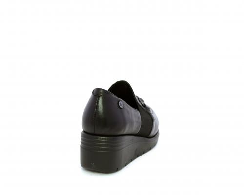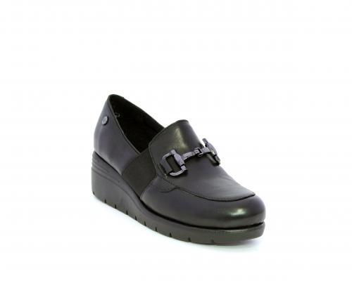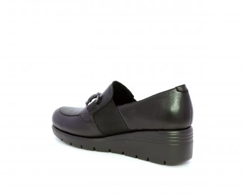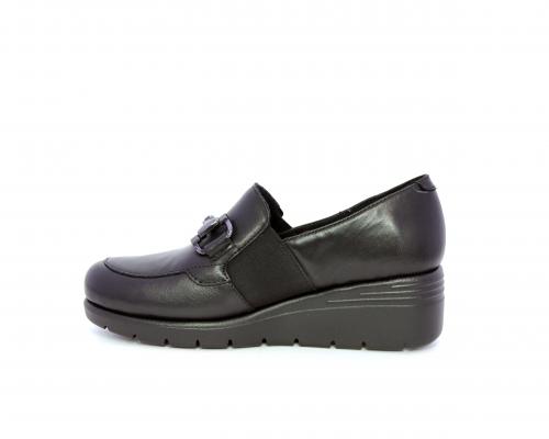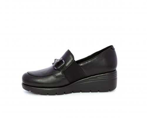 Mocassino con zeppa in gomma, tomaia in pelle con accessorio in acciaio, fascia elastica laterale sul collo del piede, sottopiede in pelle, fodera interna in tessuto, fusbet anatomico estriabile.