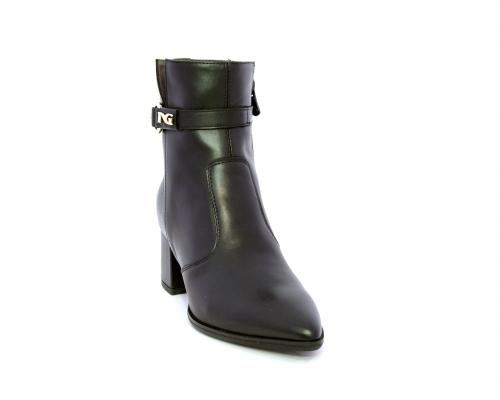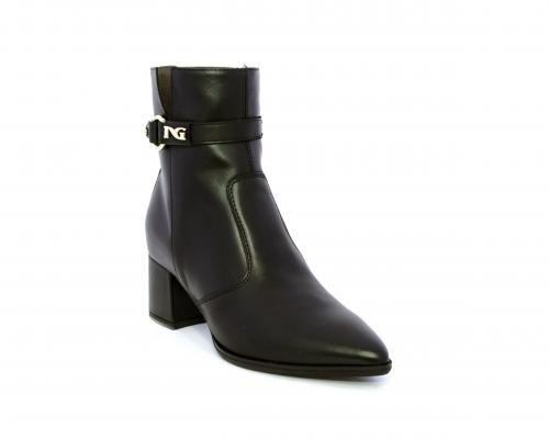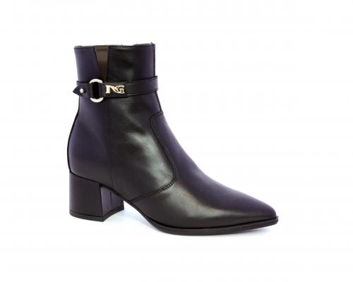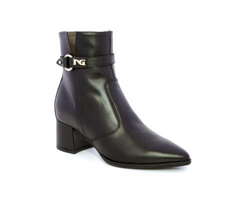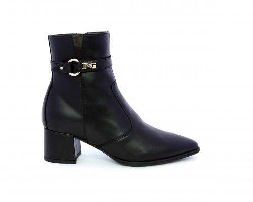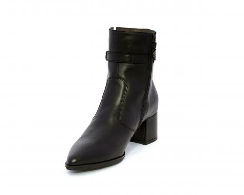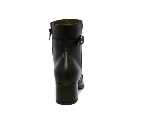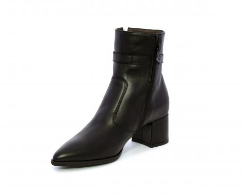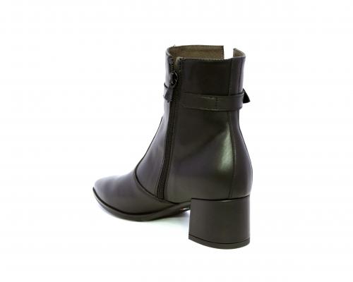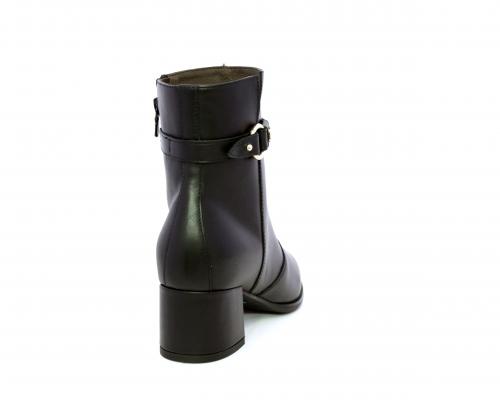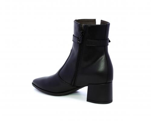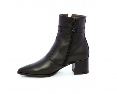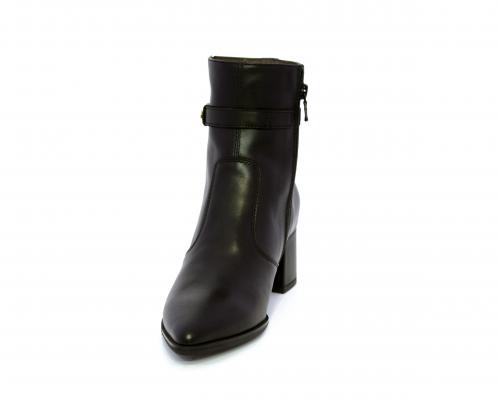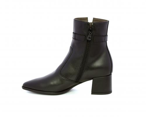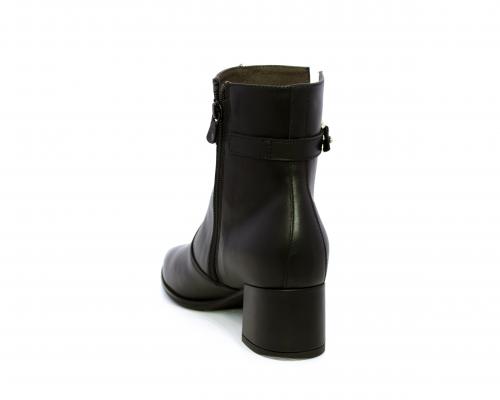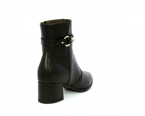 Tronchetto con chiusura laterale, fondo in gomma, tacco largo rivestito in pelle, tomaia in pelle con fibbia laterale color oro, sottopiede e fodera interna in pelle, fusbet anatomico con memory.