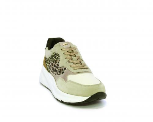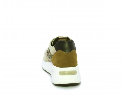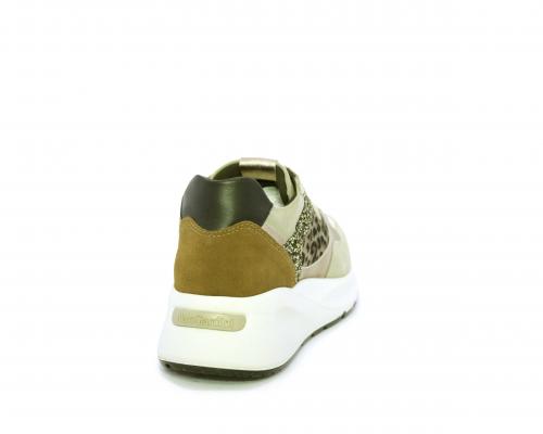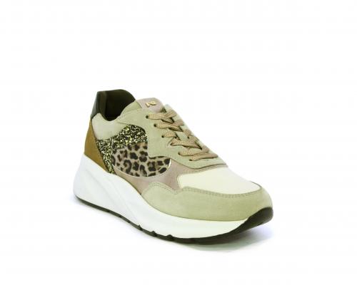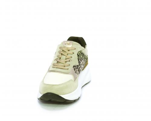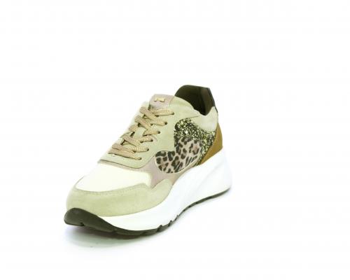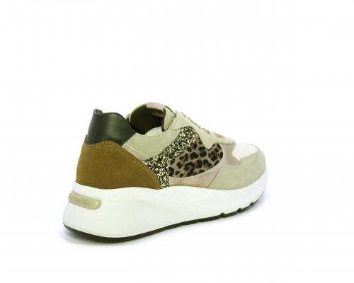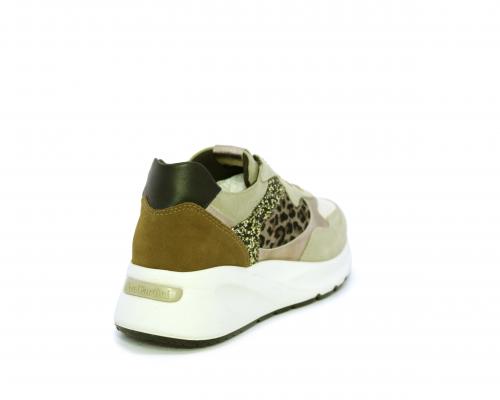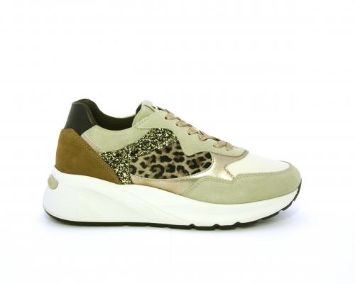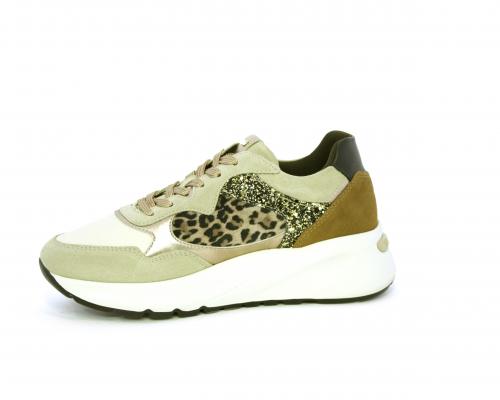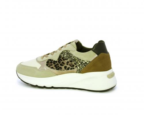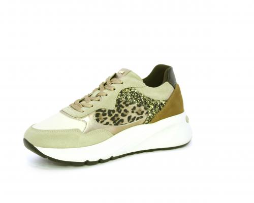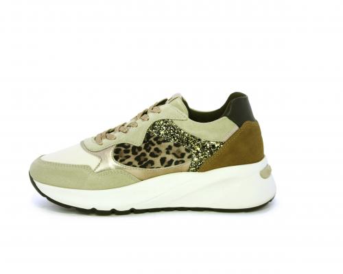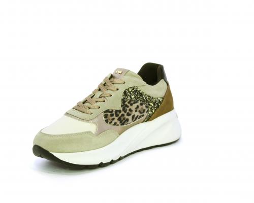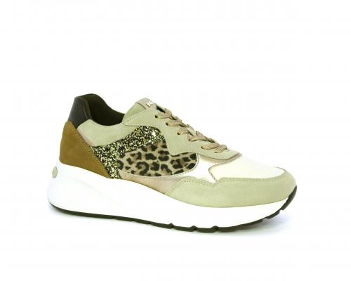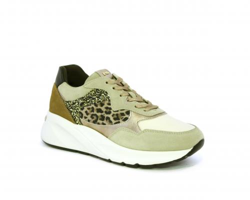 Sneakers con lacci, zeppa e plateaux in gomma, tomaia in camoscio con parti in pelle e banda laterale in camoscio maculato con inserti di lurex, sottopiede in tessuto, fodera interna in pelle, fusbet estraibile con memory e sistema DryGo svolge una doppia azione assorbe l'umidità quando si indossa la scarpa e si asciuga rapidamente quando si toglie la calzatura.
