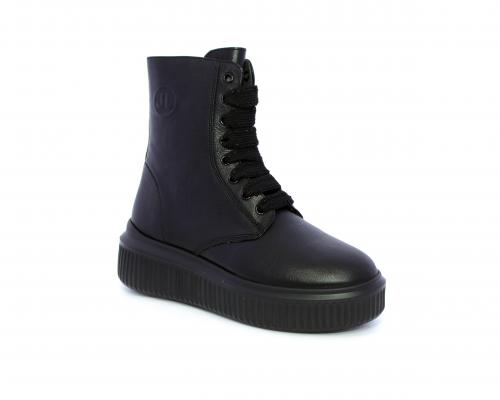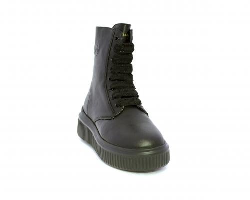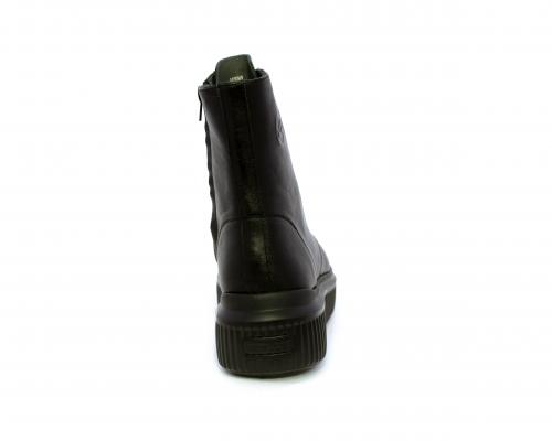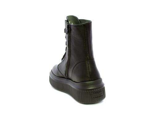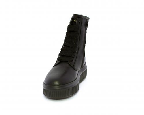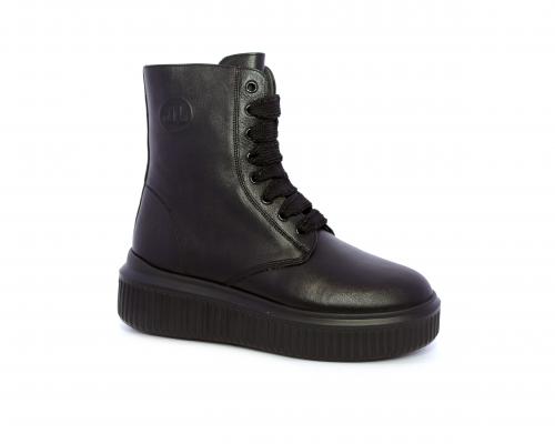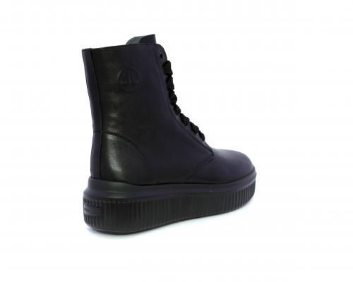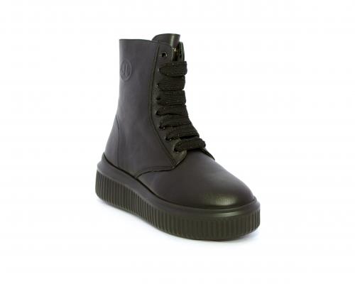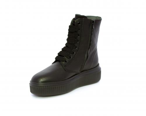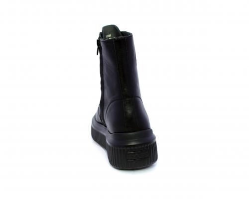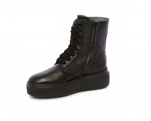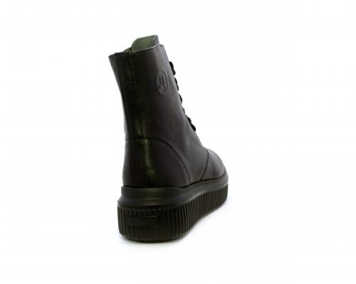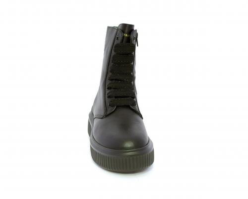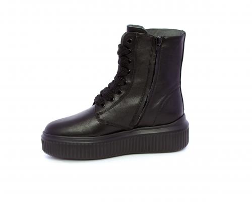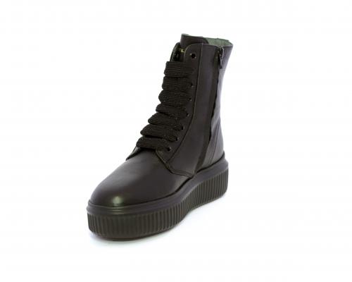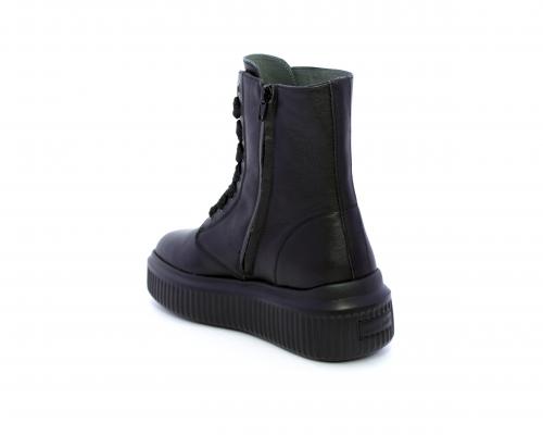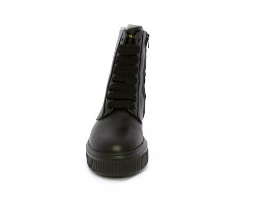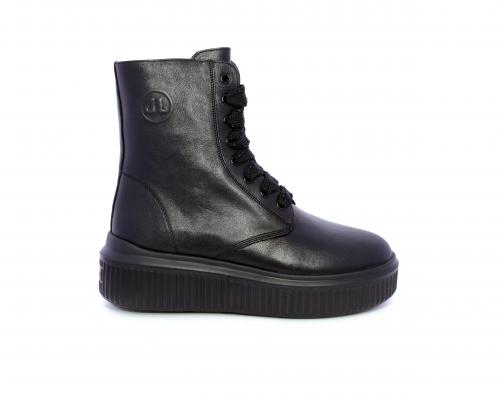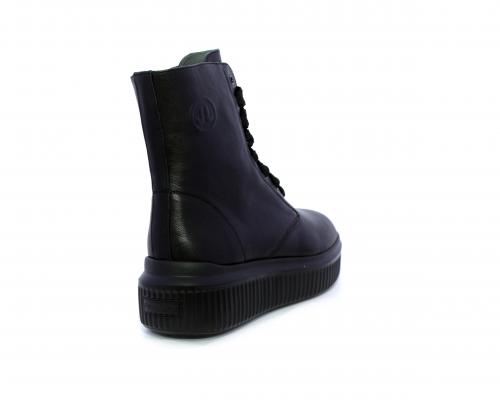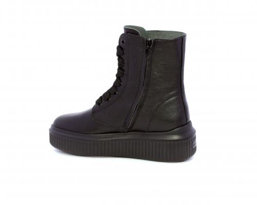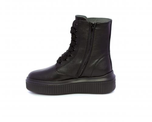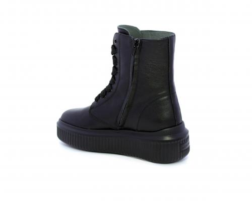Anfibio con lacci e chiusura laterale, platform in gomma nera, tomaia in pelle con logo laterale stampato in rilievo, sottopiede e fodera interna in pelle, fusbet estraibile con merory.