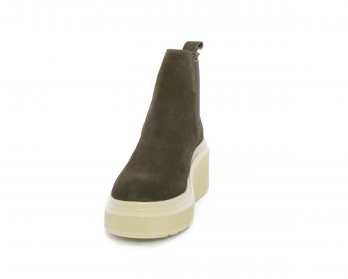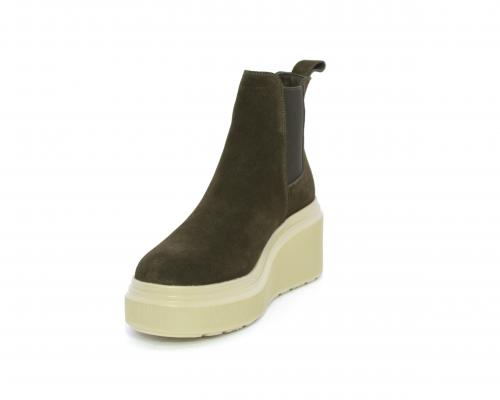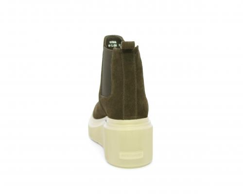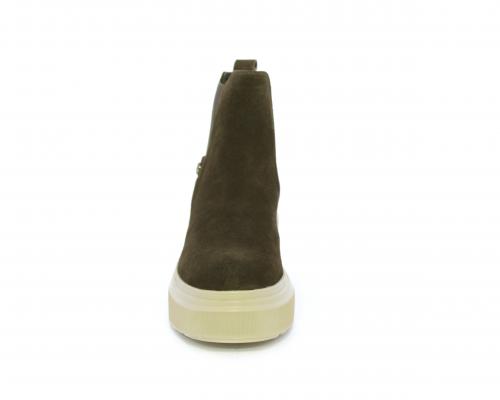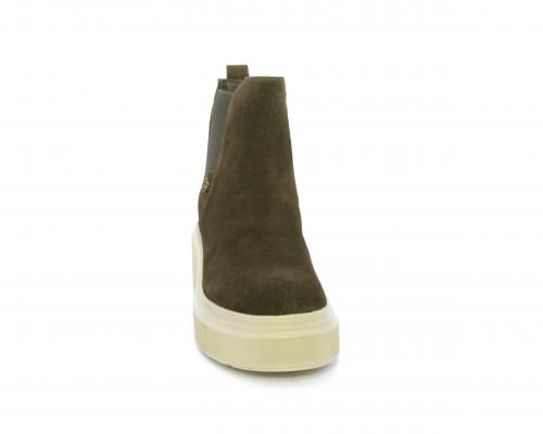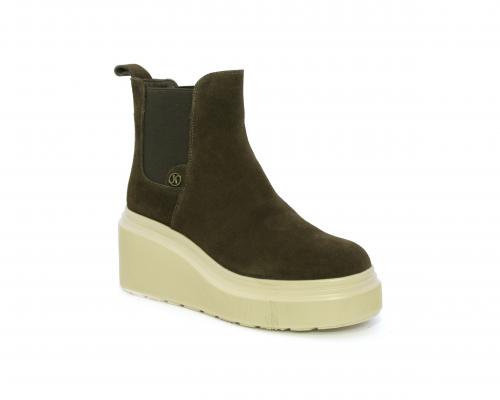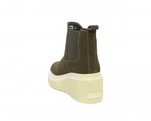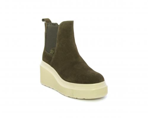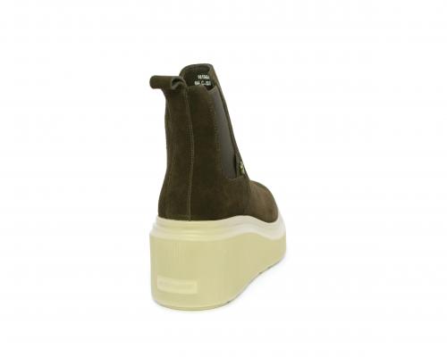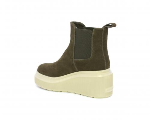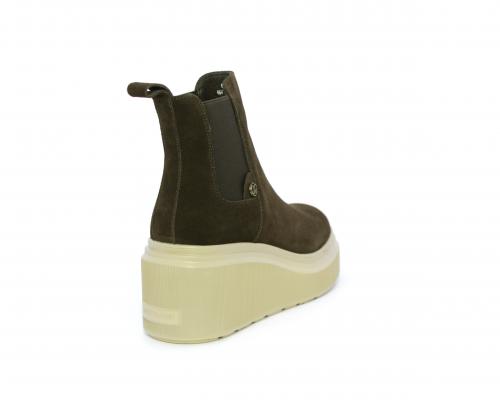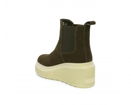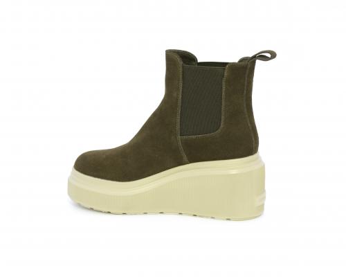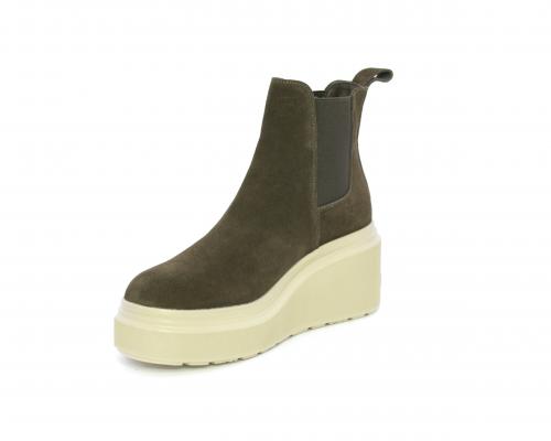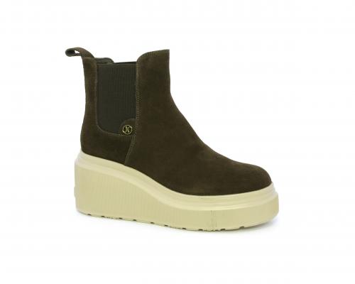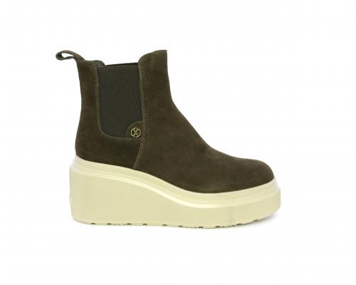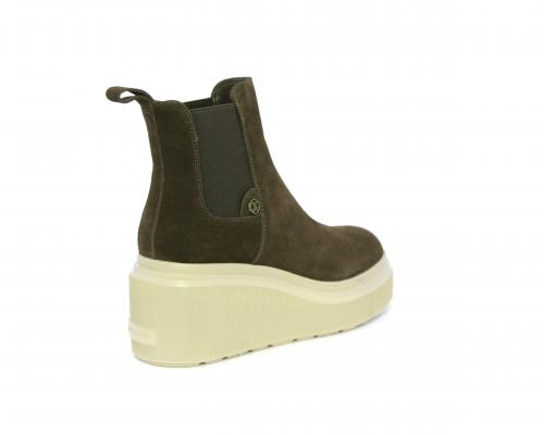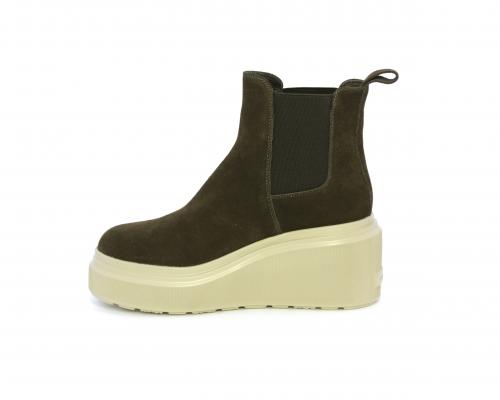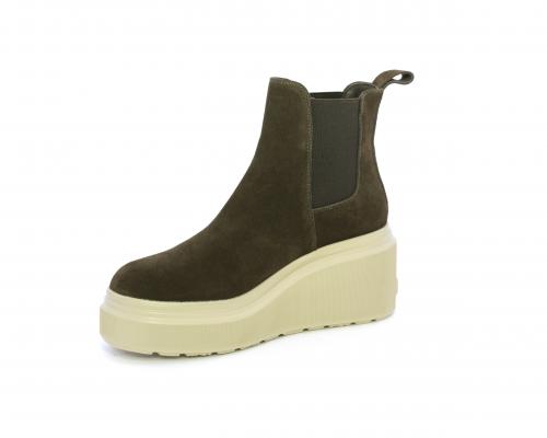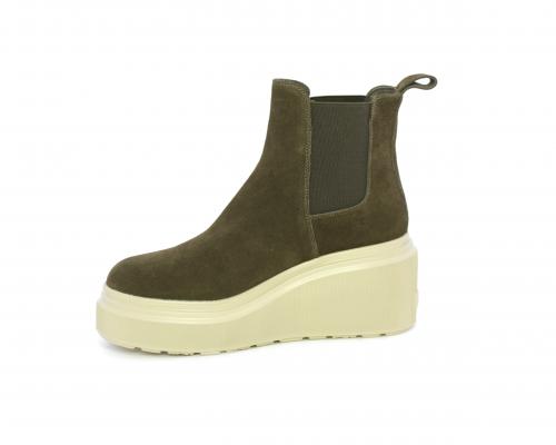 Stivaletto con doppio elastico, zeppa e plateaux in gomma, tomaia in camoscio, sottopiede in pelle, fodera interna in tessuto, fusbet estraibile con merory.